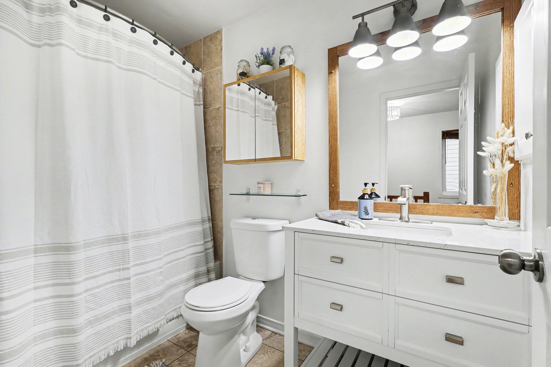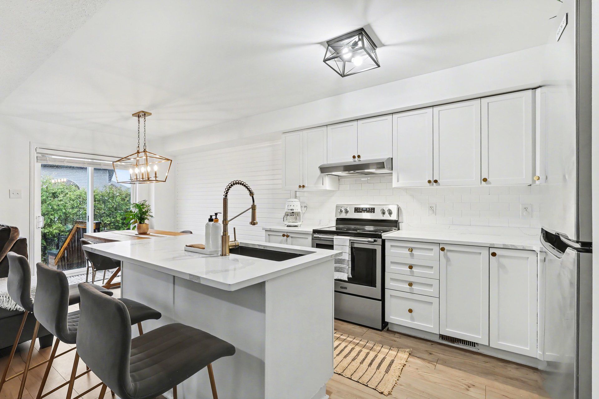 • Stylish kitchen with quartz countertops and farmhouse sink, full of natural light.