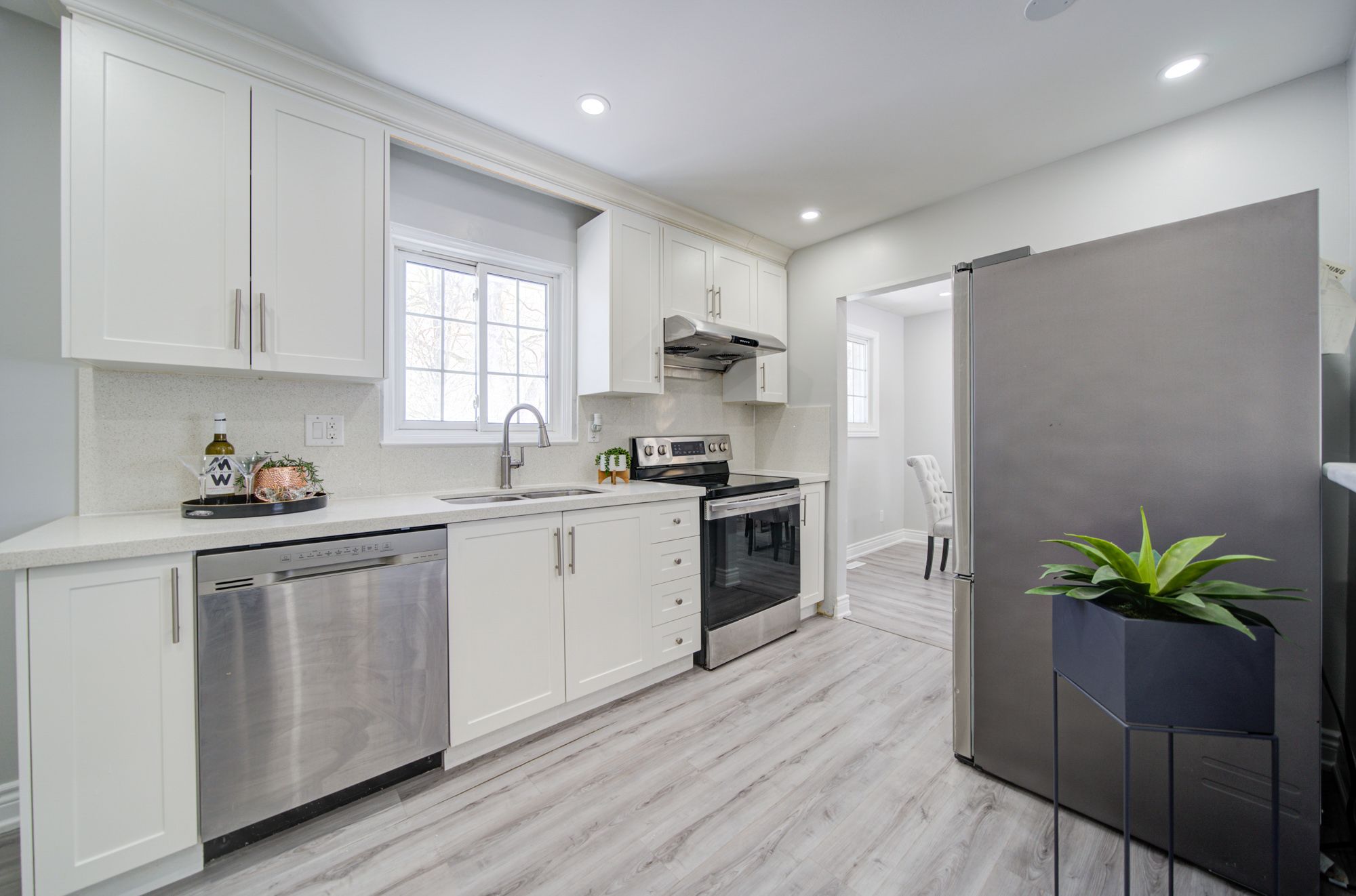 Renovated bungalow with in-law suite potential!!! This beautifully updated bungalow sits on a premium 60ft x 110ft lot, offering a rare combination of modern design and functional versatility. Perfectly suited for multi-generational families or investors, this turn-key property is ready for its next chapter. Interior highlights main floor: an open-concept living and dining area features a large bay window, recessed pot lighting, and contemporary wide-plank flooring. Dual kitchens: the main floor boasts a crisp white chef's kitchen with stone countertops and stainless steel appliances. The lower level includes a second fully-equipped kitchen, ideal for an in-law suite or rental income. Accommodations: three bright, spacious bedrooms on the main level and two fully renovated bathrooms across both floors. Finished lower level: a large, cozy recreation room with high ceilings and oversized windows provides an inviting second living space. With two bedrooms, open concept kitchen/living area and full washroom this space is perfect for a growing family. The exterior & location: massive backyard that is 60ft wide and 110ft deep, fully fenced yard offers endless possibilities for a pool, garden, or workshop. Strategic location: located in a quiet, mature neighbourhood minutes from rvh hospital, georgian college, and the highway 400 corridor-perfect for commuters and local professionals alike. Buyer or buyer's agent to verify all taxes & measurements. Seller does not warrant retrofit status of in-law suite.