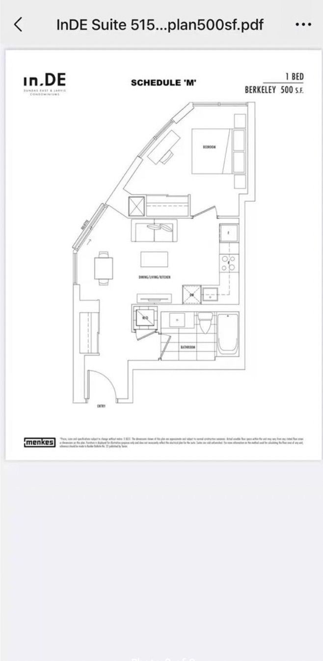 One-bedroom unit at in. De condo by menkes. South-facing with a functional layout . Features ensuite laundry and a modern kitchen with stainless steel appliances. Conveniently located with ttc at your doorstep. Very close to tmu (toronto metropolitan university), and within walking distance to dundas square, cf eaton centre, the financial district, ocad, and george brown college. Surrounded by shops, restaurants, cafés, and everyday amenities.