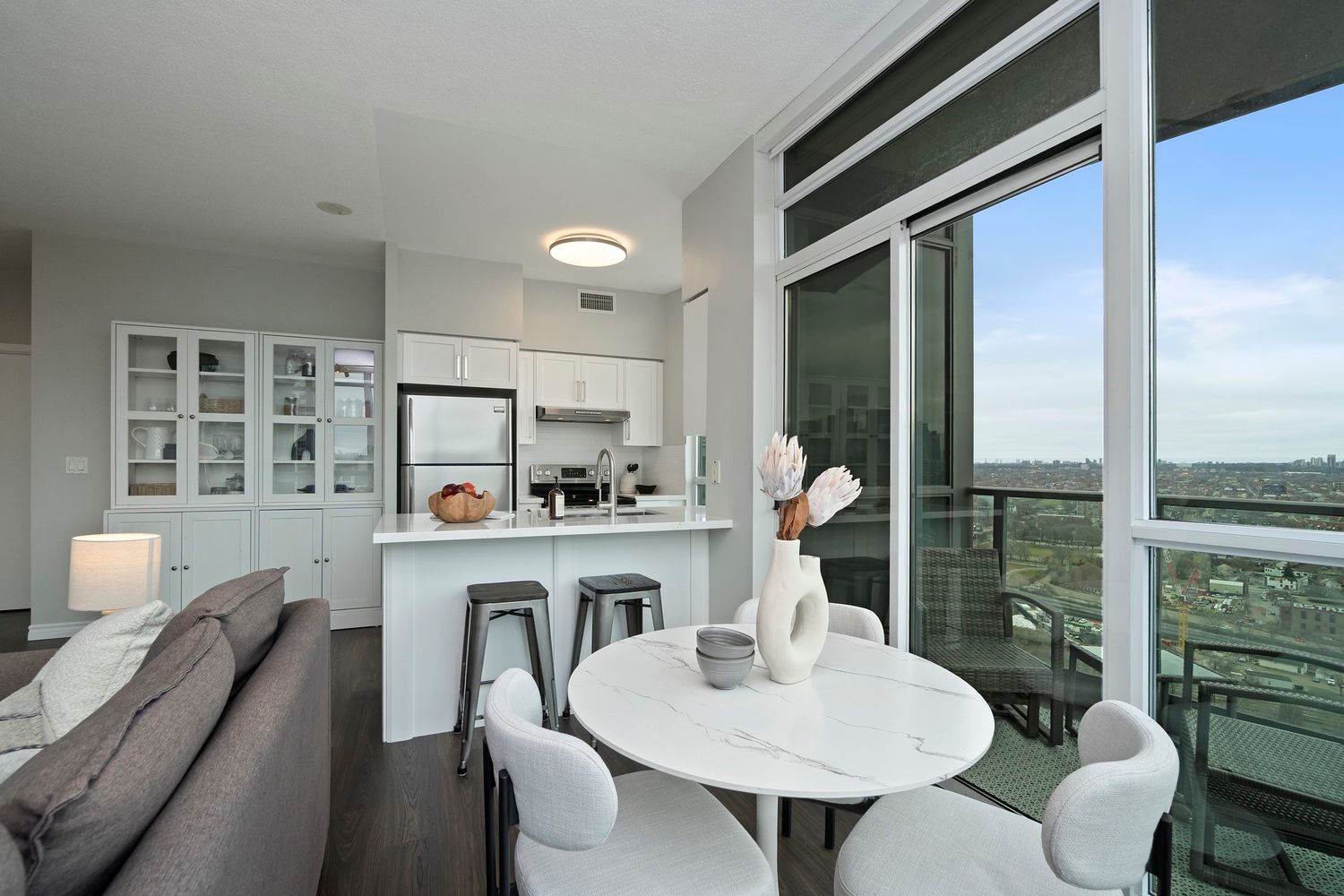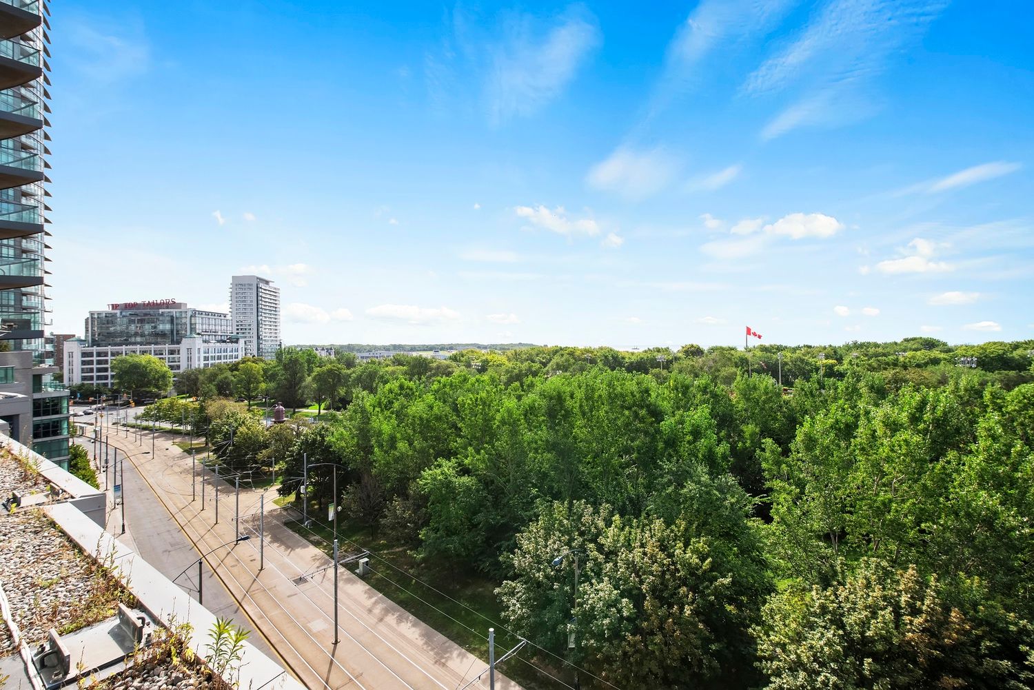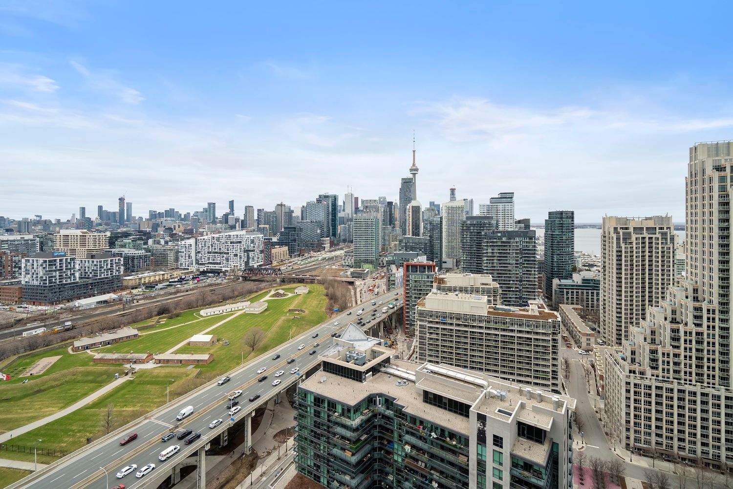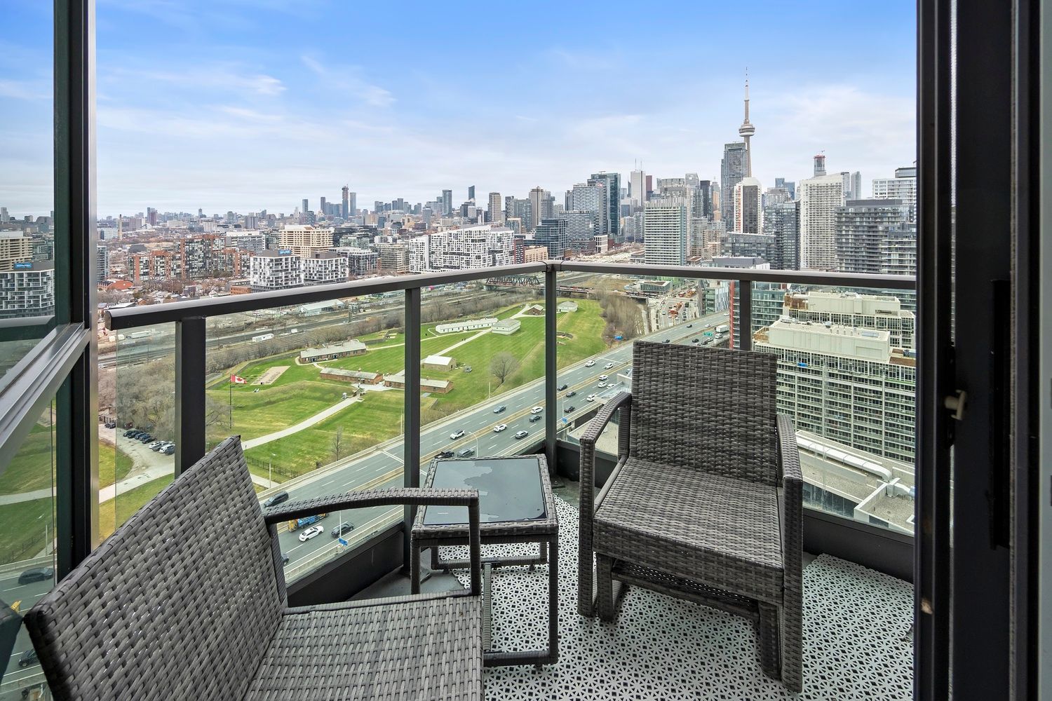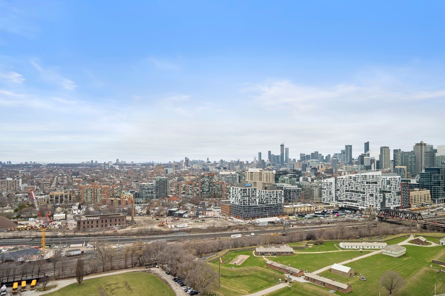 Stunning panoramic views greet you from every corner of this exceptional suite-featuring sweeping vistas of the lake, the city skyline, and fort york park. Floor-to-ceiling windows throughout flood the space with natural light, creating a bright and inviting atmosphere, including a full-length window in the kitchen. This beautifully designed split two-bedroom, two-bathroom layout offers both style and functionality. The open-concept living and dining area is thoughtfully arranged, providing ample space for a full dining table and generous living room furnishings-perfect for entertaining. The spacious primary bedroom comfortably accommodates a dresser and additional seating, complete with a double closet and room for a cozy reading nook. The second bedroom is ideal as a home office or guest room, offering flexibility for modern living. The tastefully renovated kitchen shines with built-in features and a central island-an ideal setting for cooking, entertaining, or enjoying a glass of wine with friends. Unwind on your private balcony and take in the vibrant energy of the city alongside tranquil lake views. This is truly one of the most desirable layouts in toronto condo living-an exceptional opportunity not to be missed. Right in the heart of the city - there is so much to walk to and enjoy. King west/queen west/trinity bellwoods/liberty village /the lake/bike paths/shops/cafes - the list is endless! Ttc - easy access to the gardiner/lakeshore and island airport at your doorstep.
