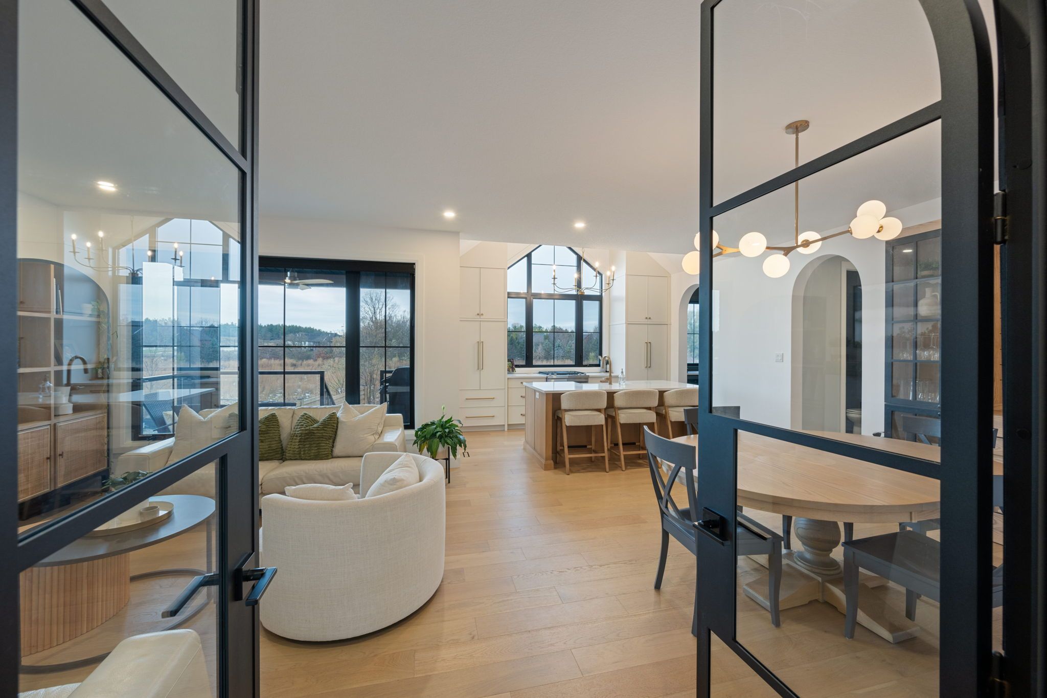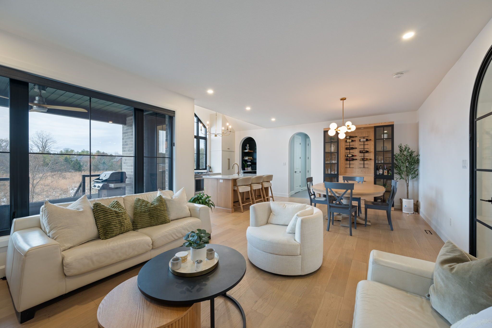 • Open-concept living room with floor-to-ceiling windows and a gas fireplace.