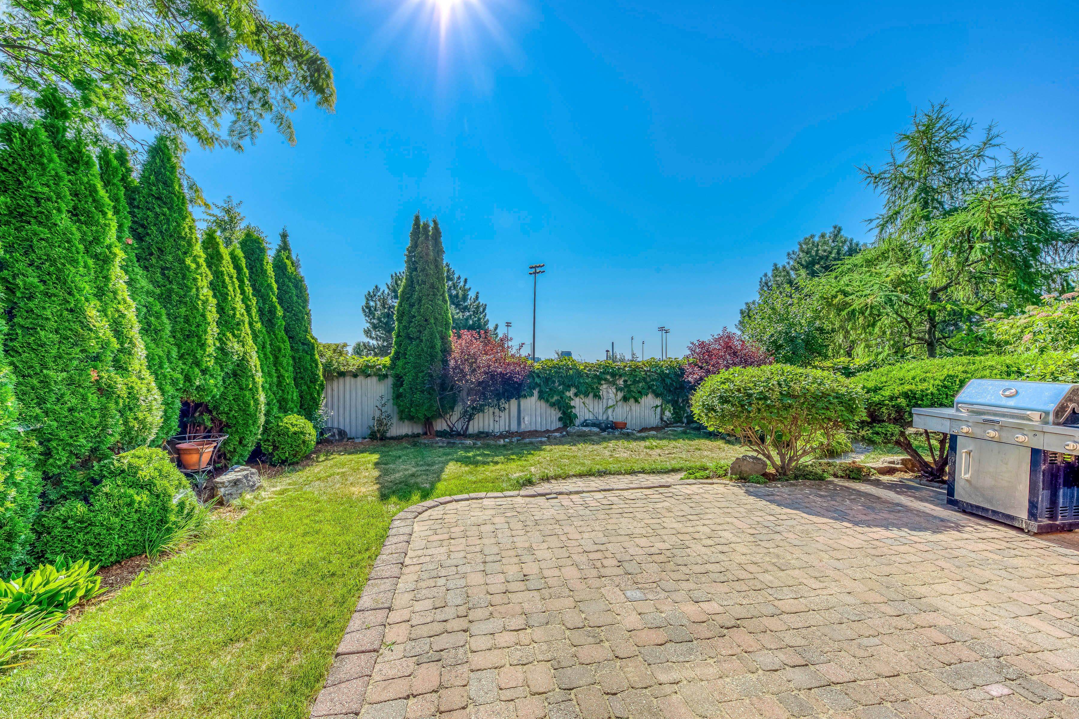 • Professionally landscaped backyard surrounded by serene tall pine trees.