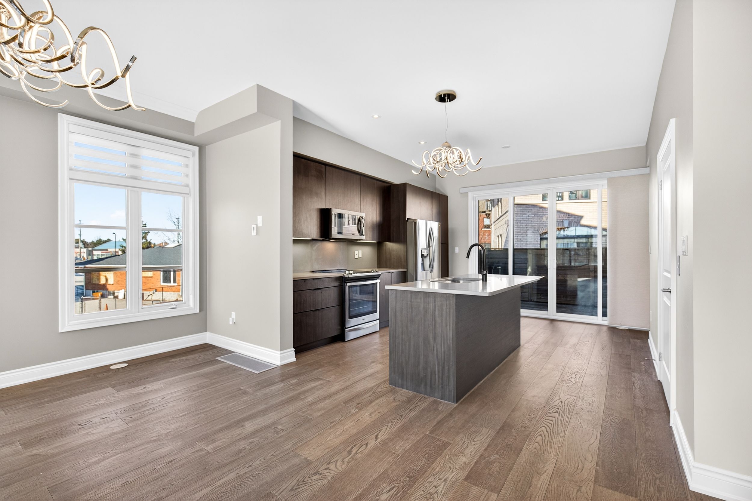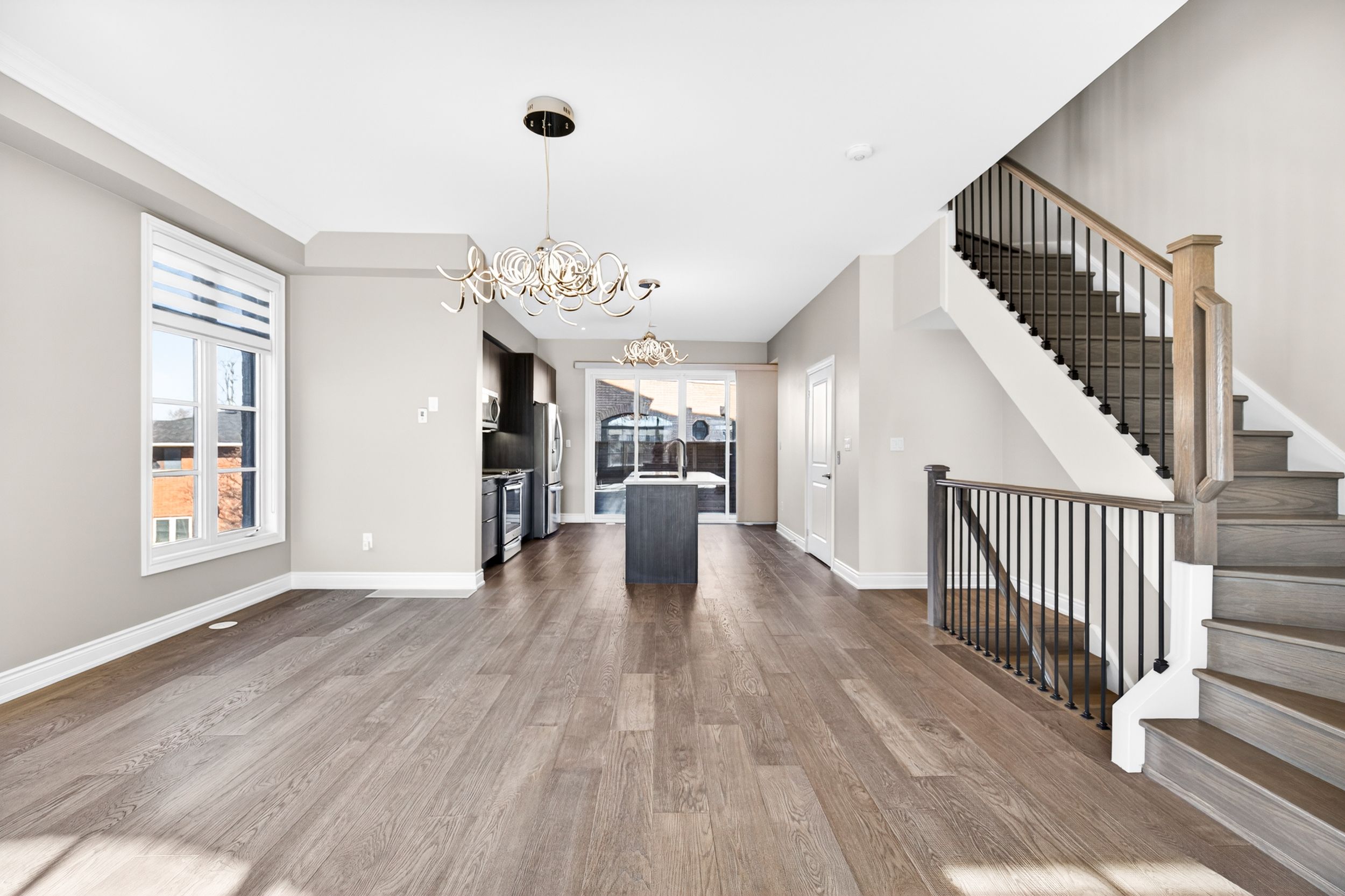 • Bright open-concept design with high ceilings and hardwood floors throughout.