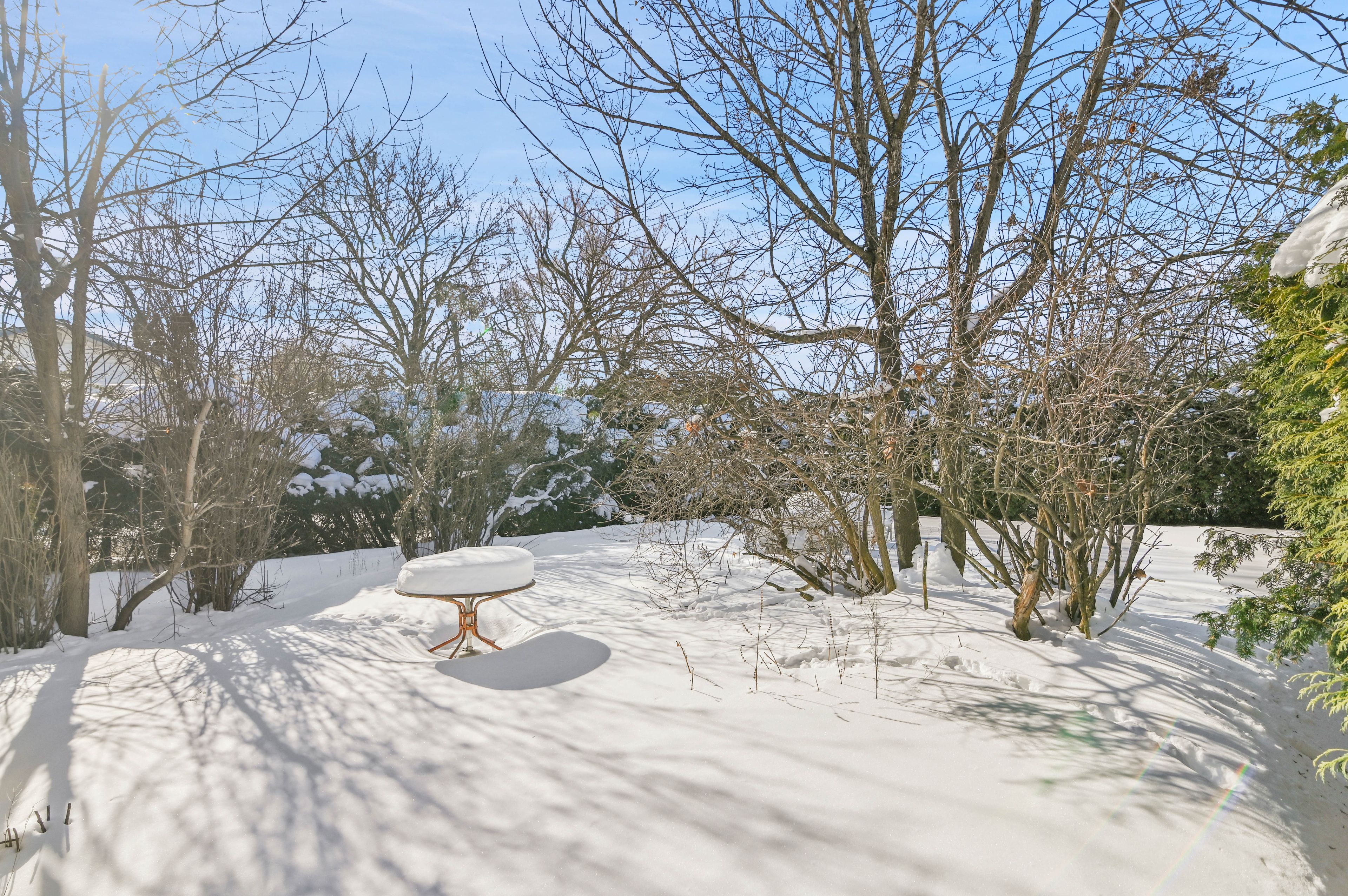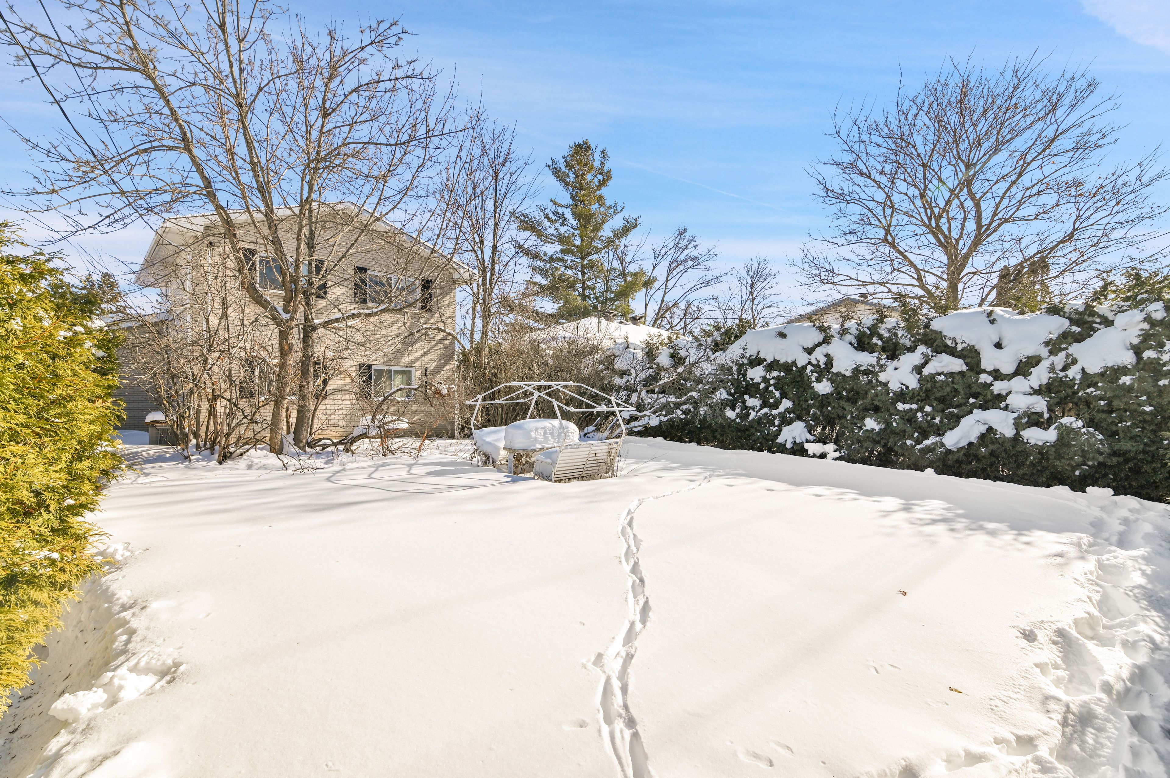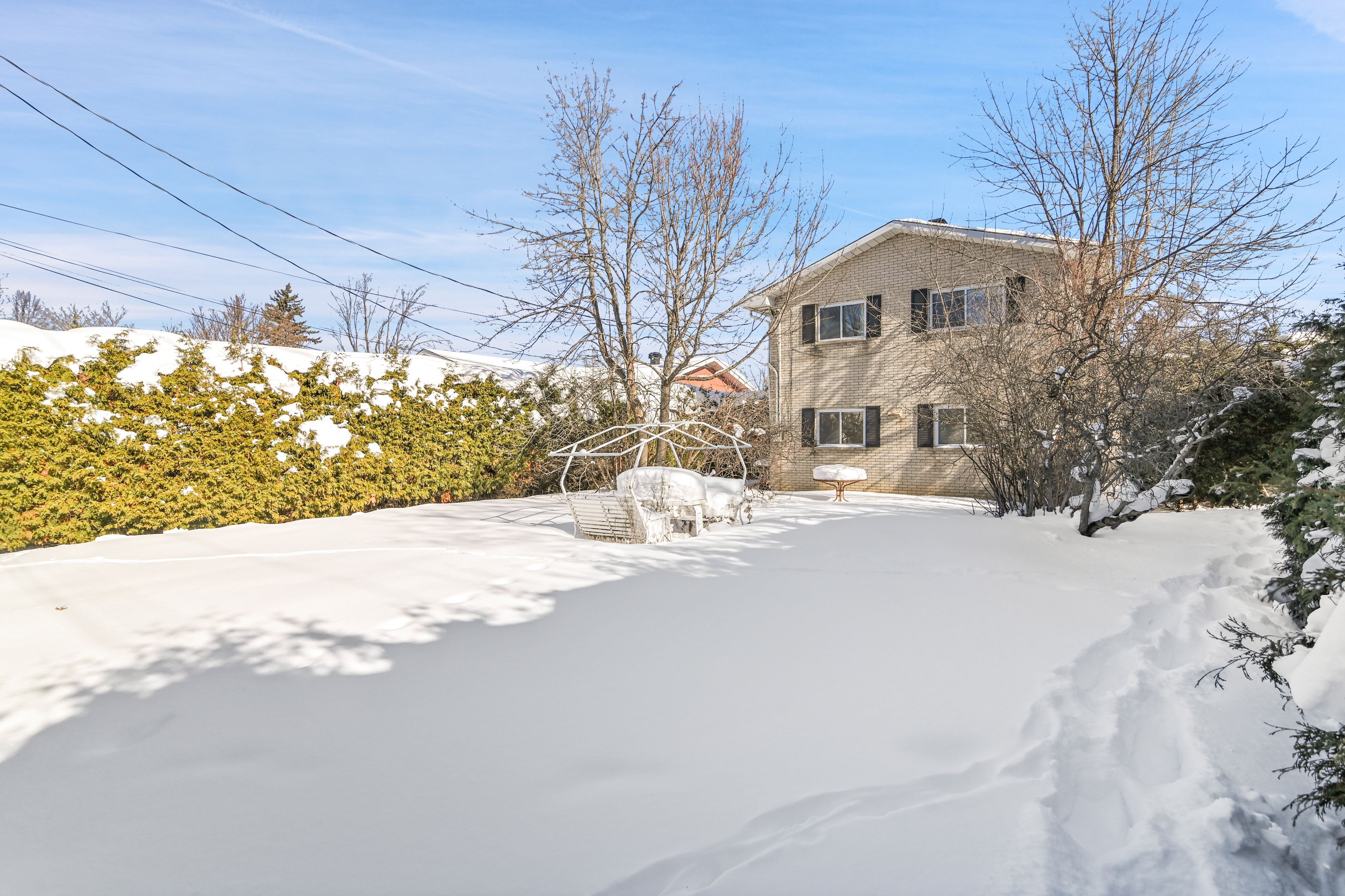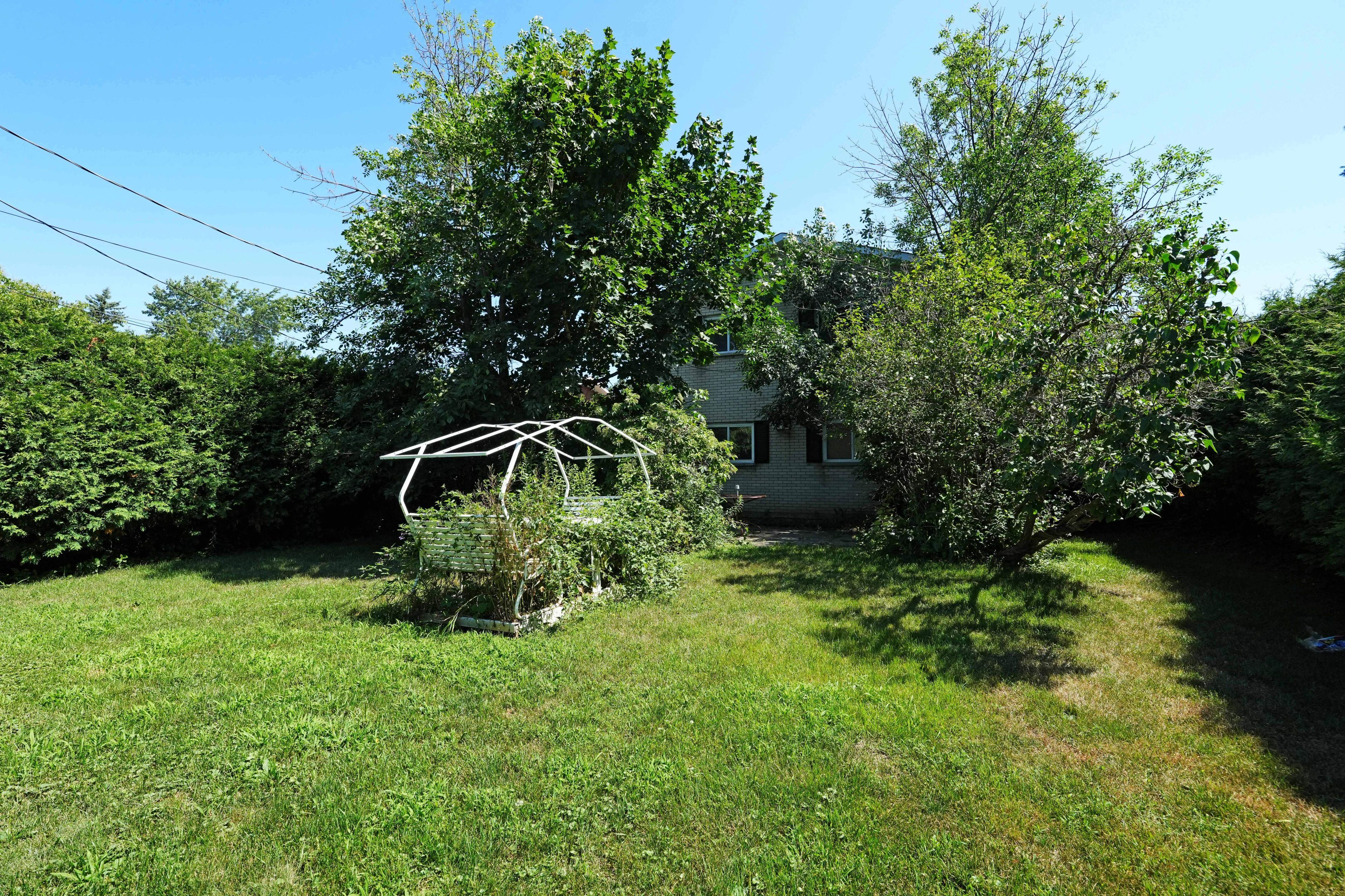 • Private backyard with mature cedar hedges for a secluded feel.