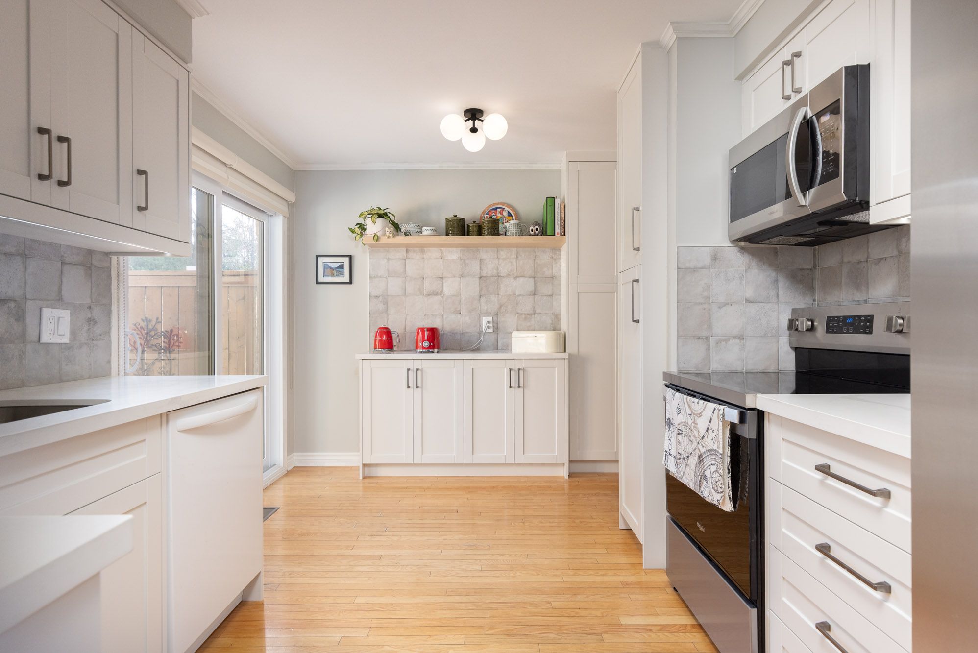 • Modern kitchen with quartz countertops, stainless steel appliances, and patio access.