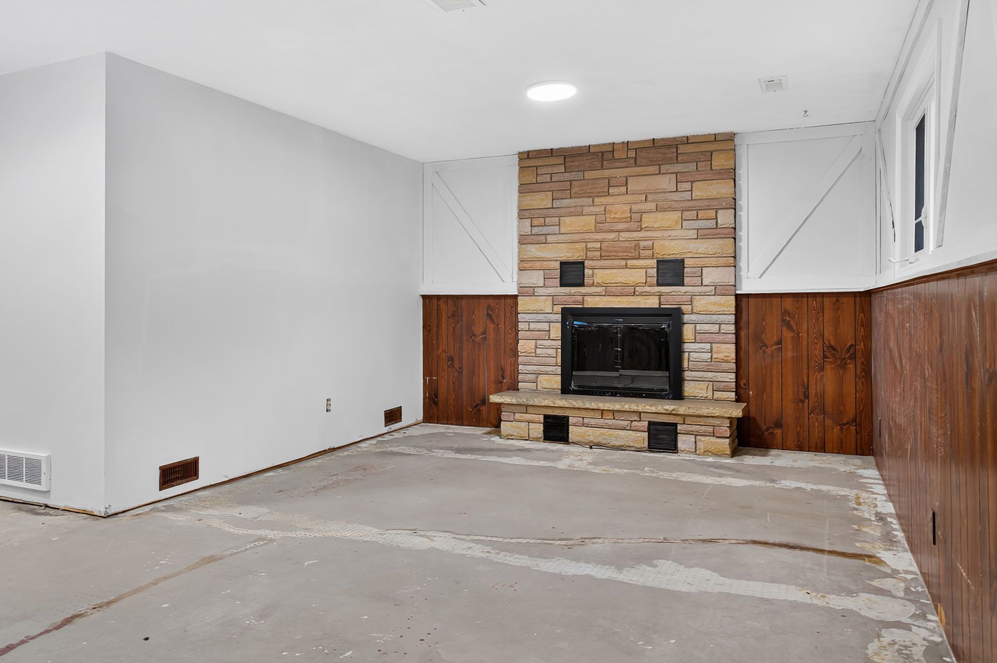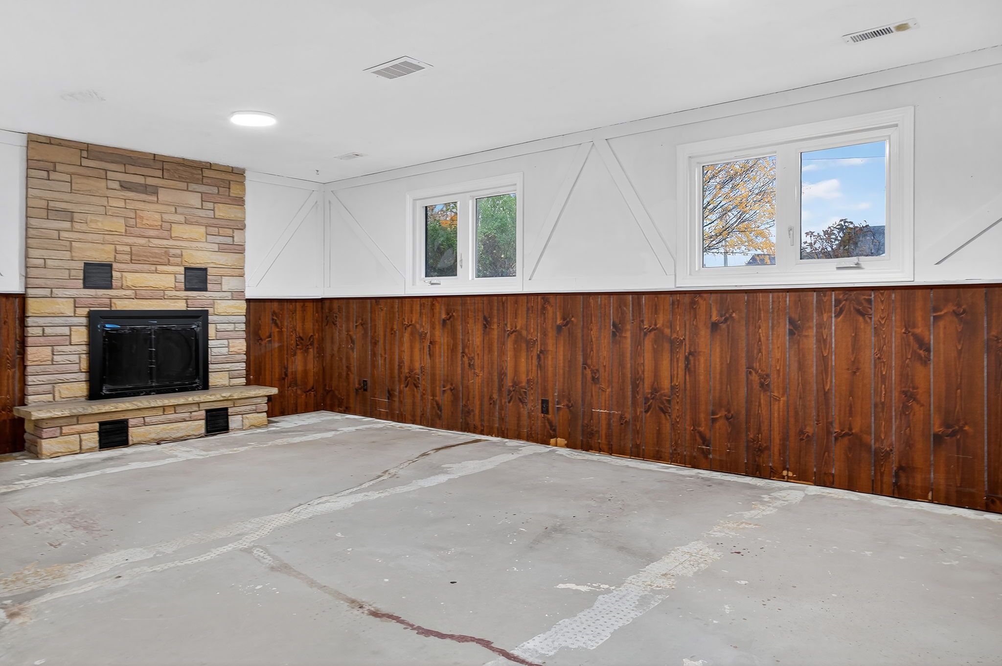 • Partially finished basement with a family room and wood-burning fireplace.