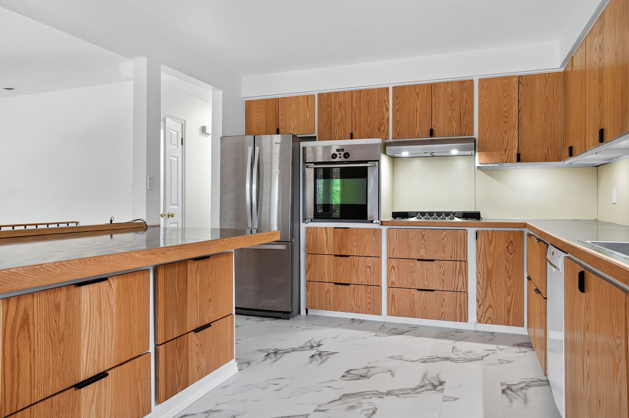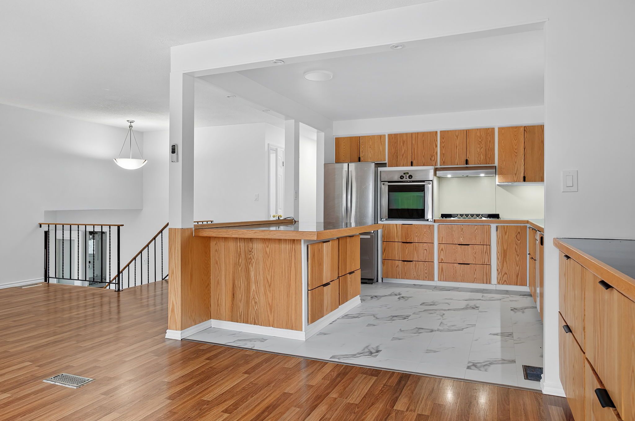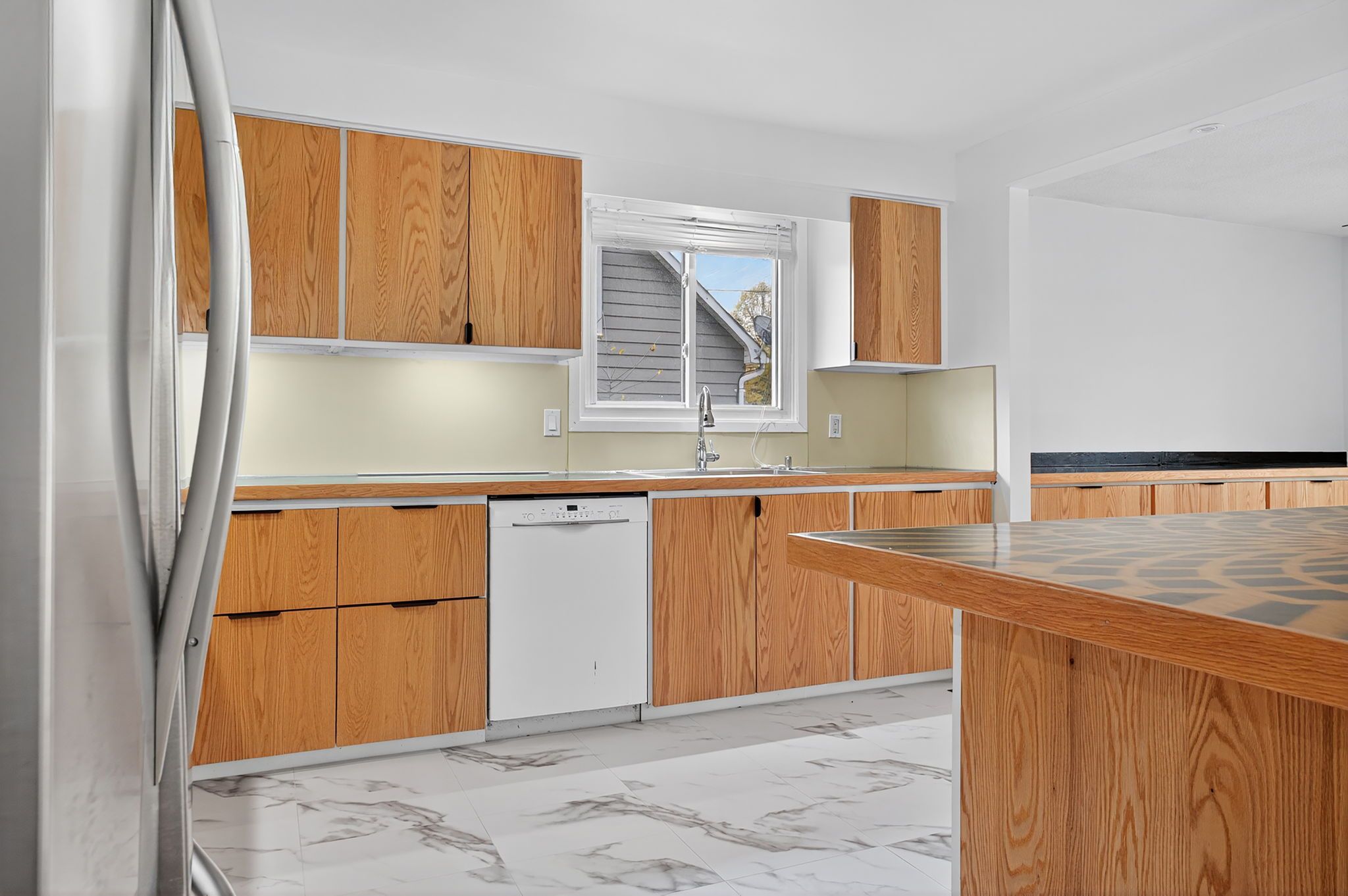 • Renovated kitchen features a large island and plenty of storage.