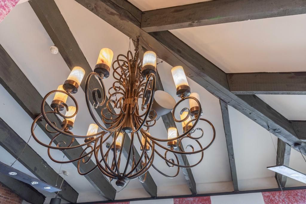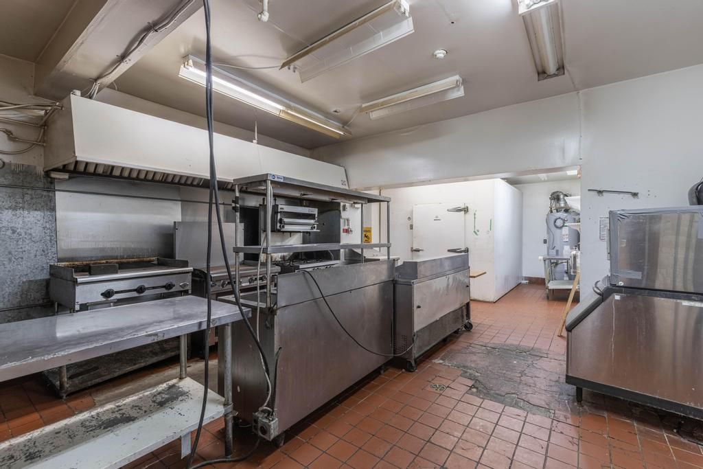 • Flexible layout with two commercial kitchens, bar, and open dining areas.