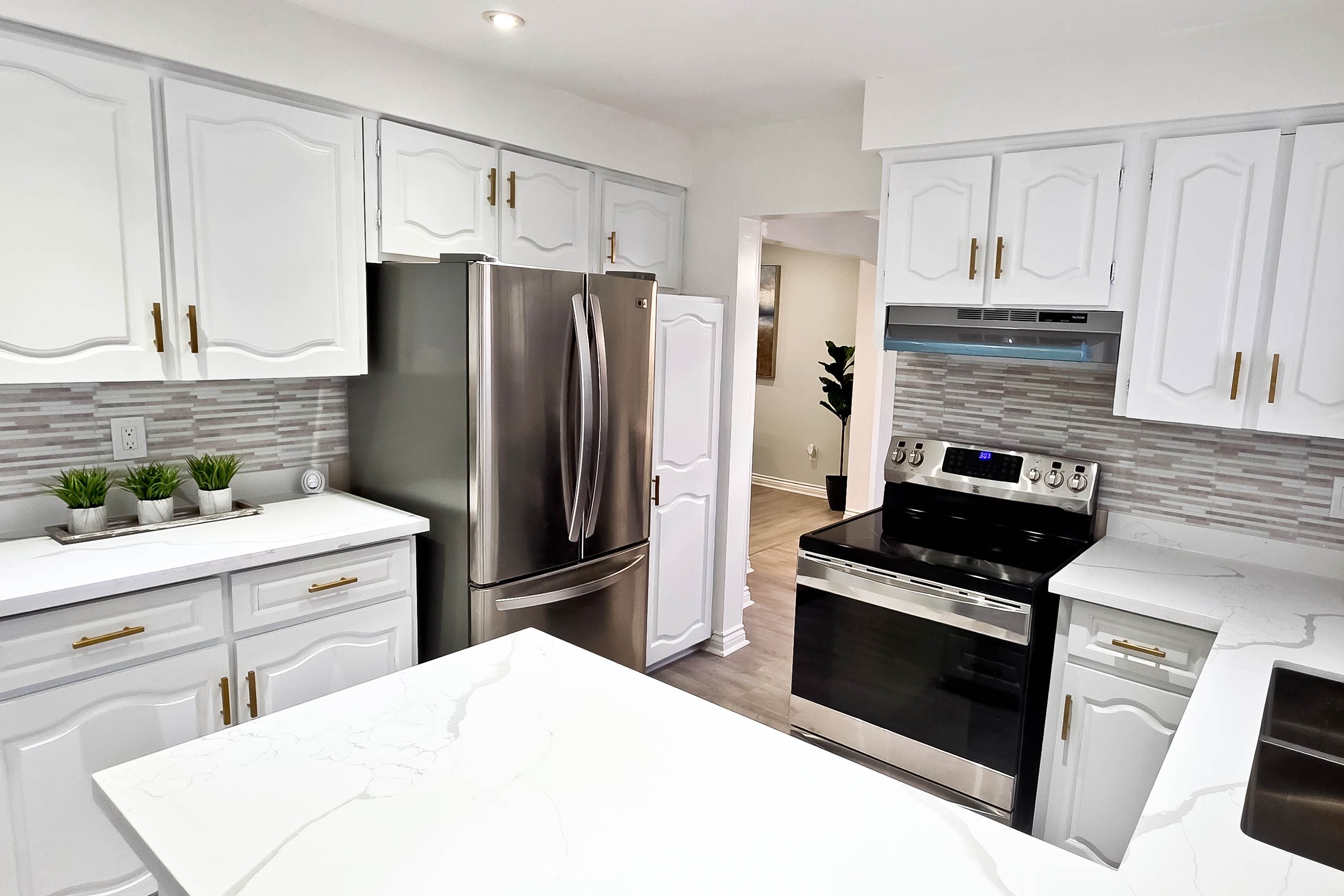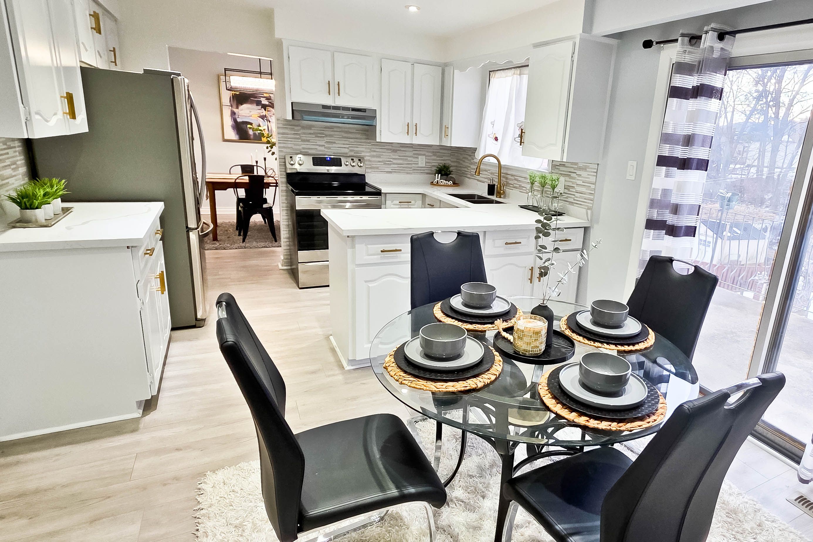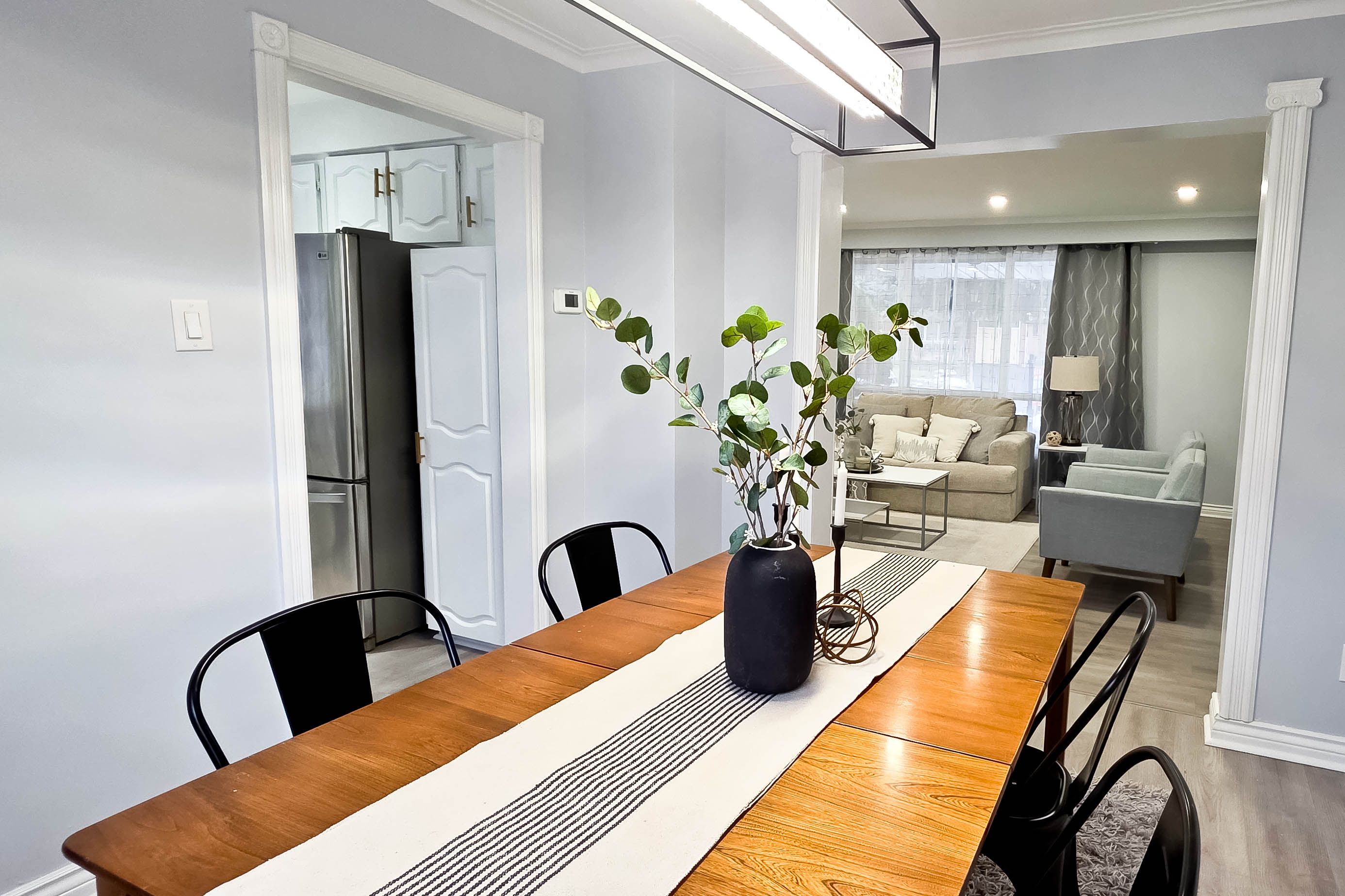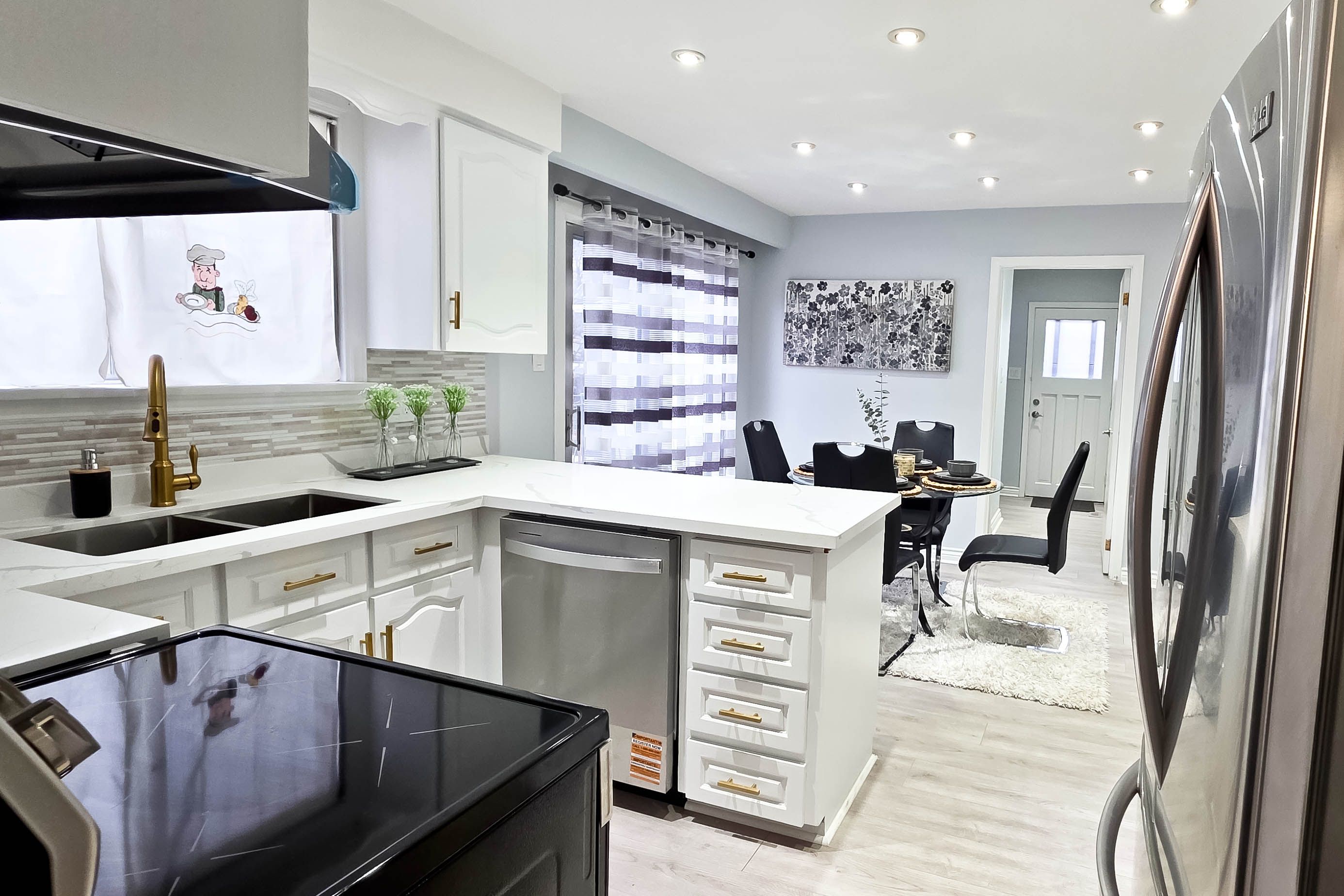 Welcome to your dream home in the heart of etobicoke! This stunning, newly renovated, recently decorated two-storey home is perfect for large families seeking ample space or investors looking for an ideal rental opportunity both on the main floors and basement area. From the moment you step inside, you'll be greeted by a bright, welcoming atmosphere in a meticulously maintained and cared-for property. The main floor features gleaming laminate flooring throughout, elegant pot lights, and professionally painted walls. Step into the spacious and sun-filled living room, highlighted by a large picture window perfect for family gatherings and cozy evenings. The dining room, complete with a stylish light fixture, seamlessly connects to the living area, creating the perfect flow for entertaining. The modern kitchen boasts stainless steel appliances, brand-new quartz countertops and sleek cabinetry with gold accents. Enjoy casual meals in the bright breakfast area, which opens onto a private balcony overlooking mature trees - a serene spot for morning coffee or evening relaxation. Upstairs, you'll find four generous bedrooms, each featuring new laminate flooring, fresh paint, ample closet space, and large windows that fill each room with natural light. The finished basement offers incredible versatility featuring a spacious recreation room complete with a bar and cozy fireplace, perfect for entertaining family and friends. The basement also includes a dedicated dining area, a second full kitchen, a bedroom (basement has enough space to add an additional bedroom), making it ideal for added rental income potential. Step outside from the basement to a large, private backyard backing onto a tree-lined ravine providing peace, privacy, and the perfect setting for summer bbqs and gatherings. Located close to transit, shopping malls, schools, places of worship, and restaurants, this property truly has it all.