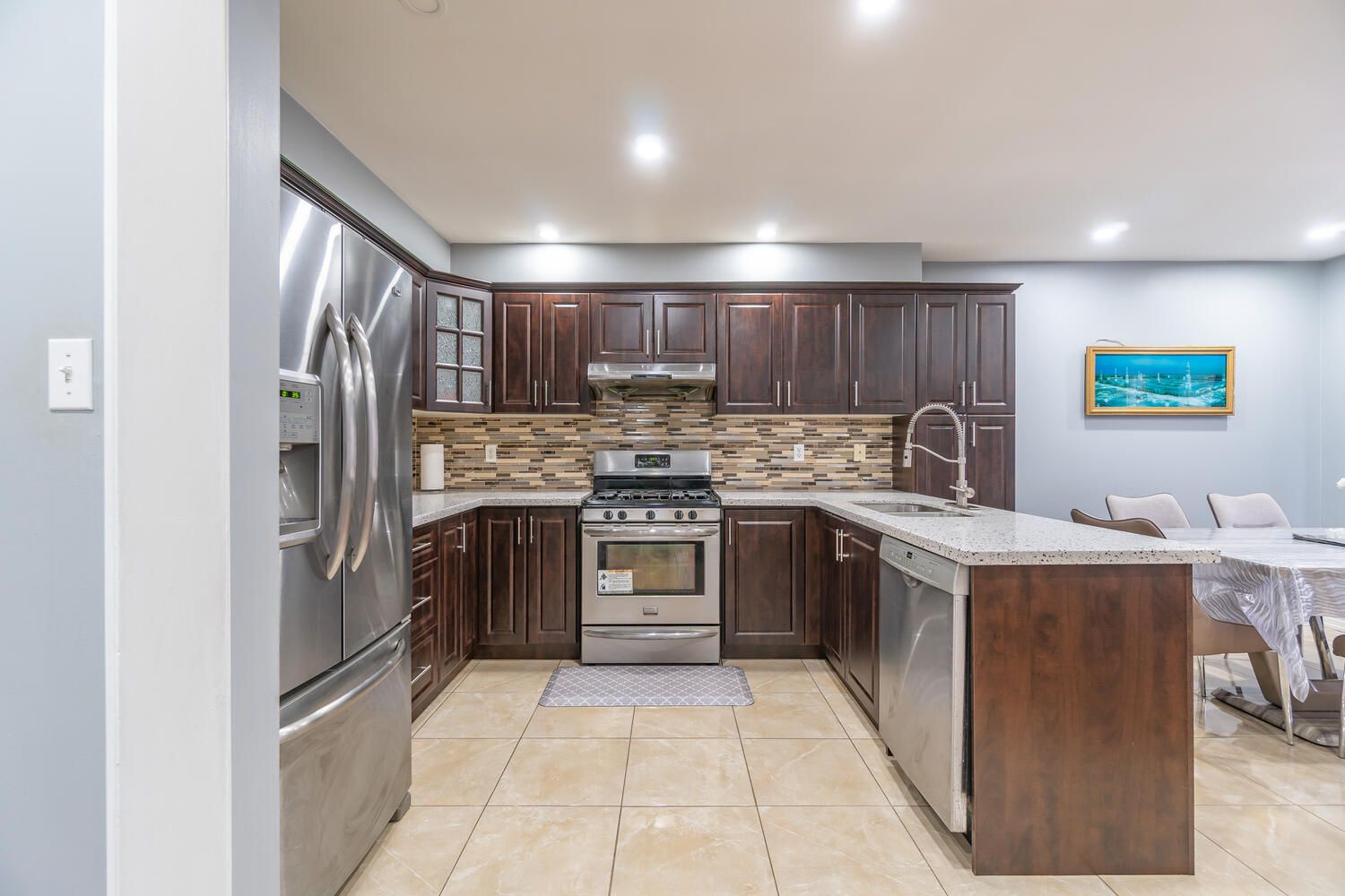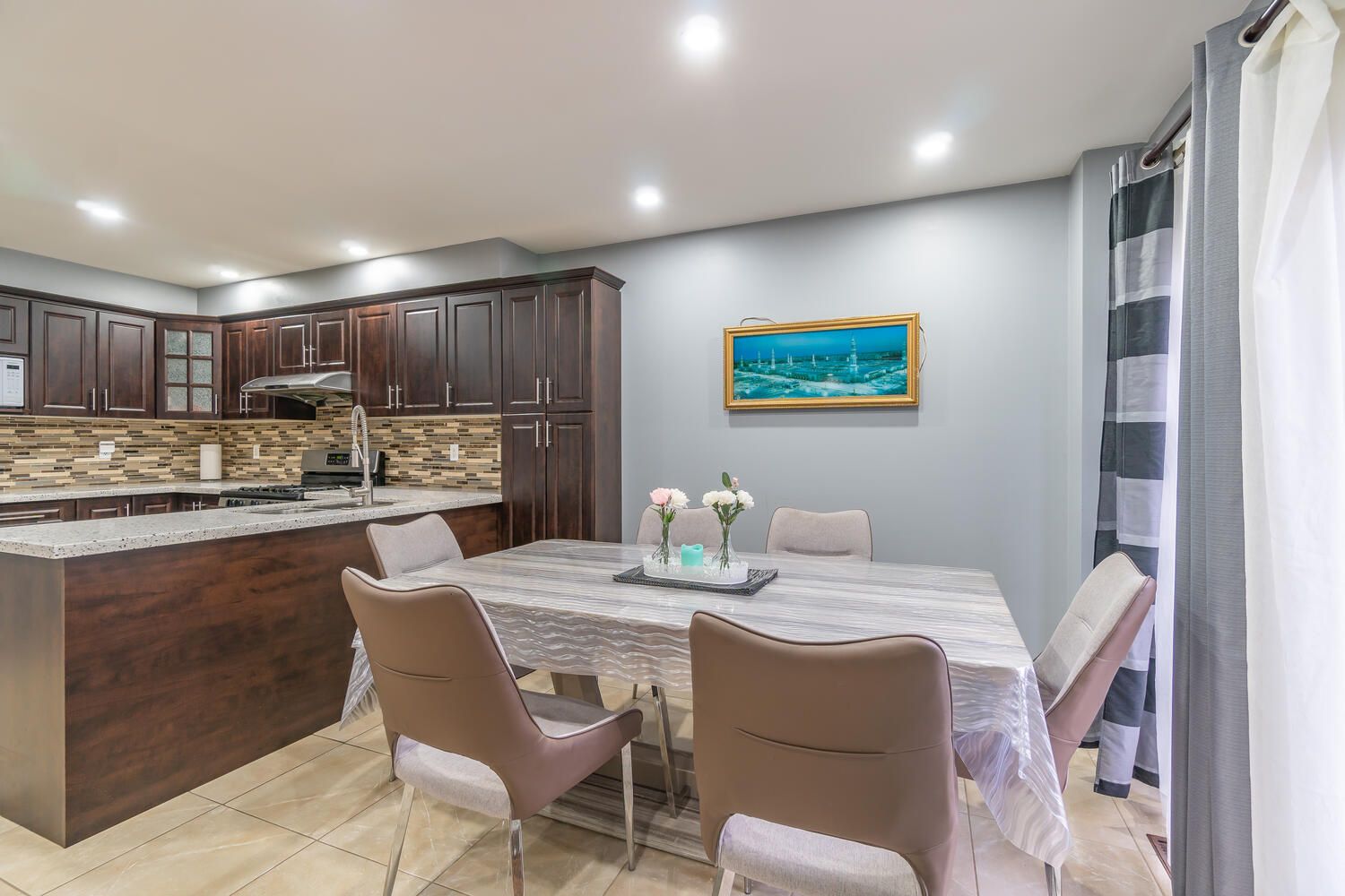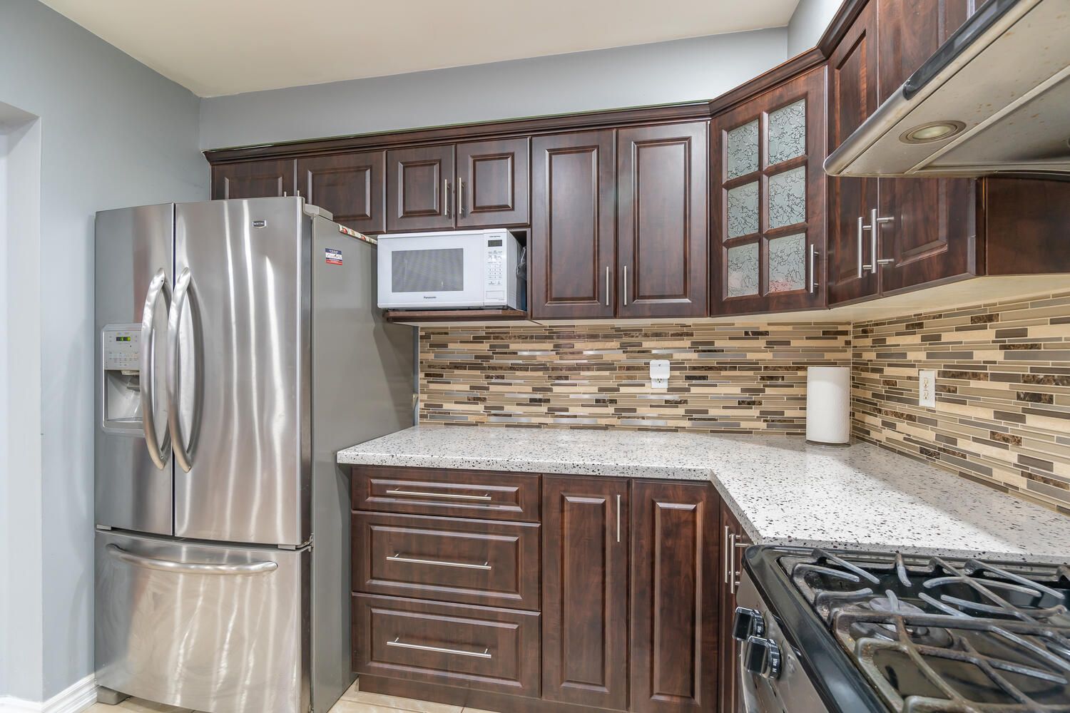 • Gorgeous kitchen featuring granite countertops and ceramic tile accents.