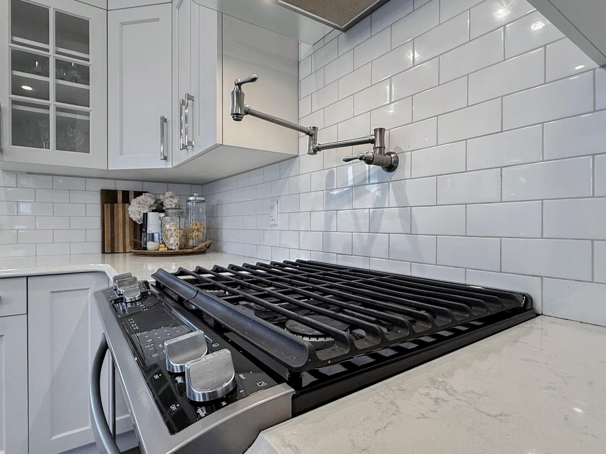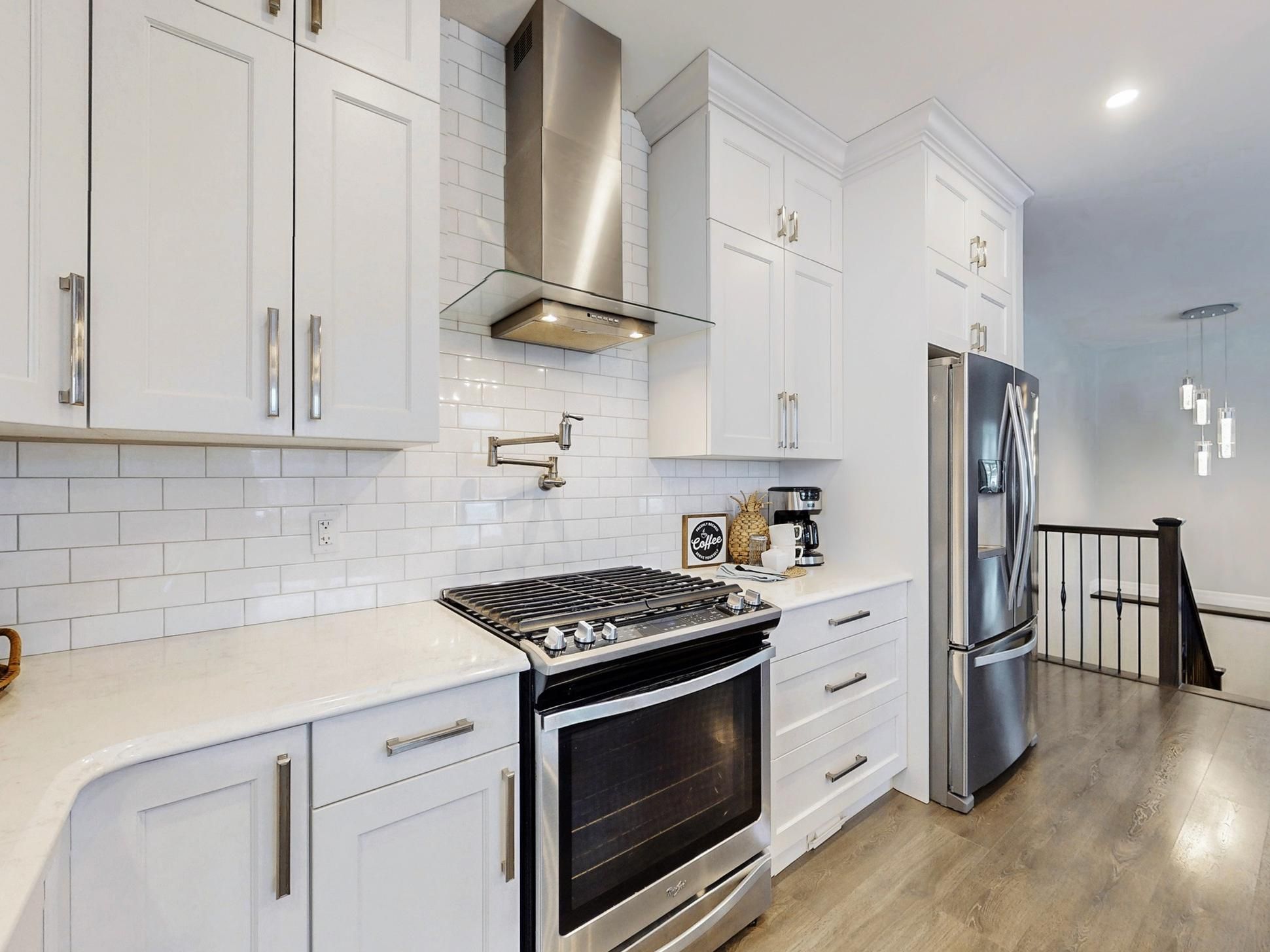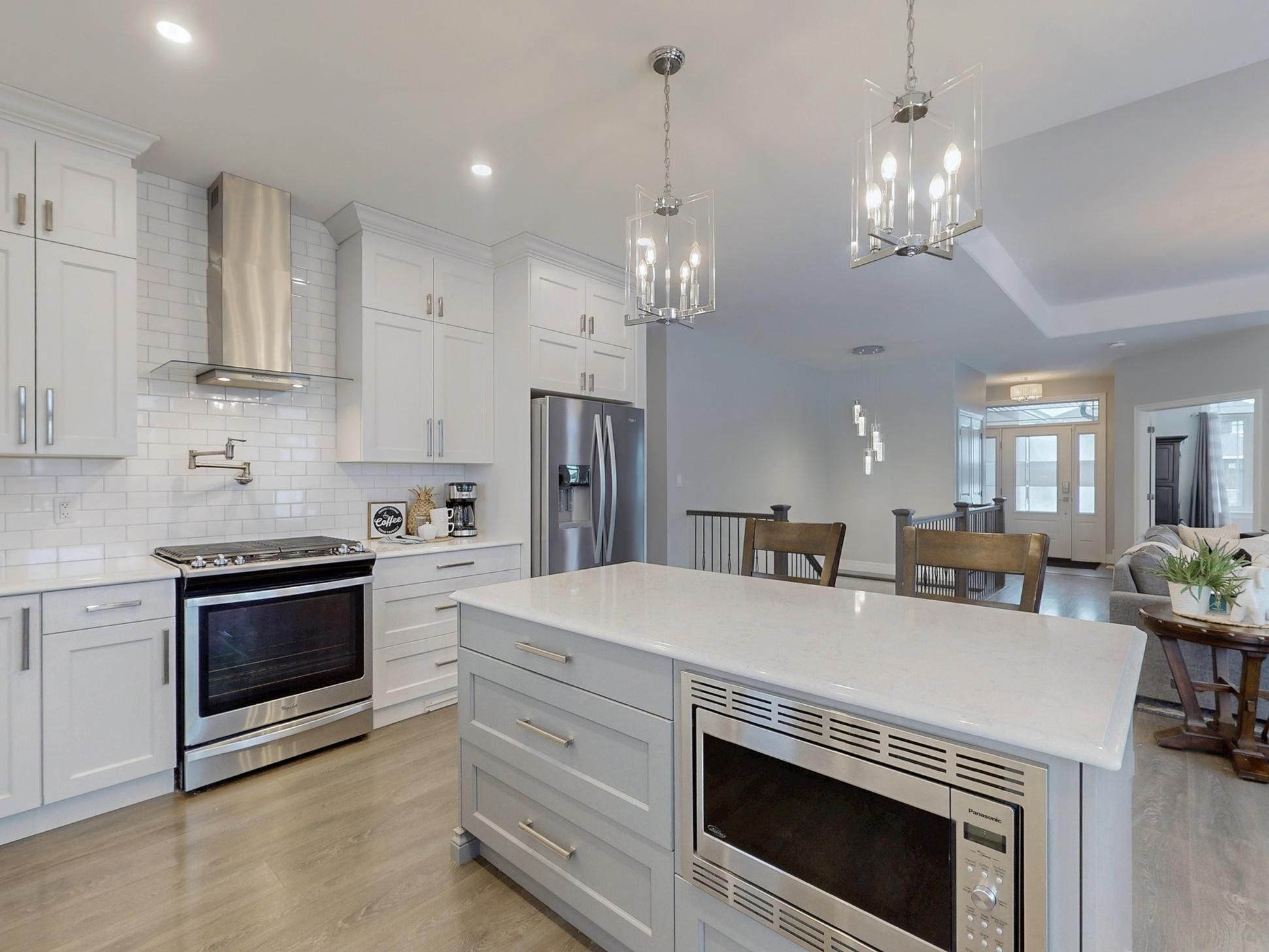 • High-end kitchen with stainless steel appliances and quartz countertops.