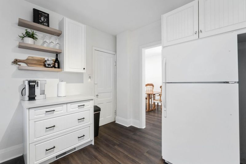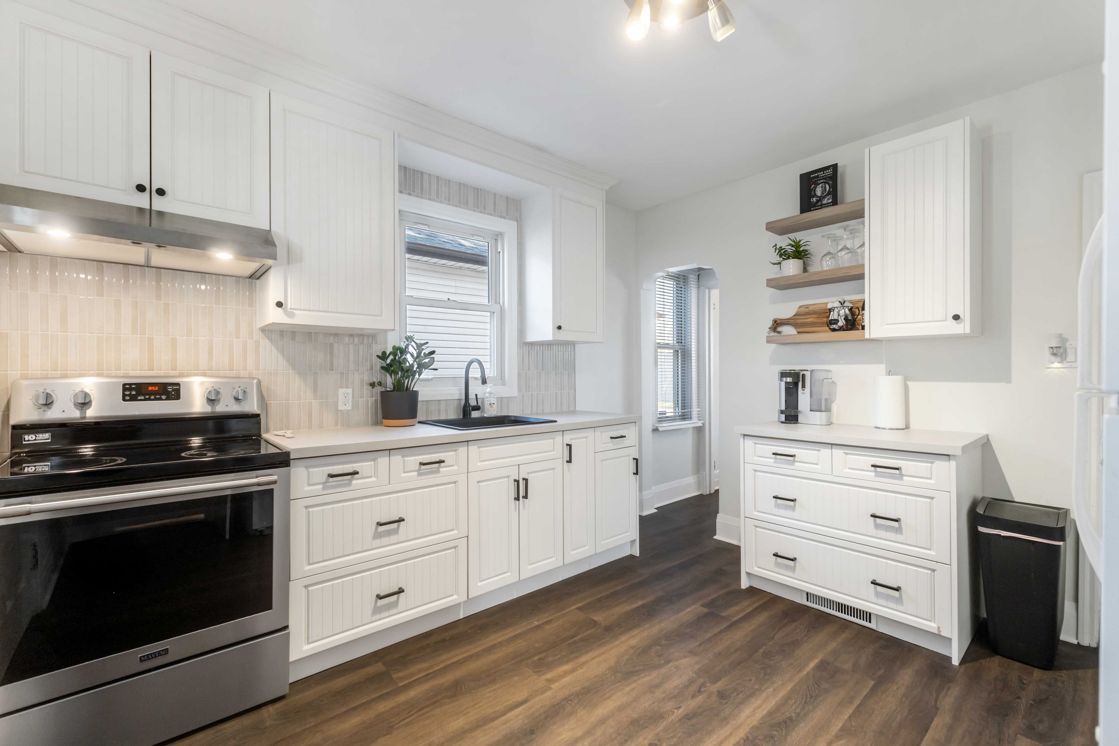 • Bright, updated kitchen with ample counter space and floating shelves.