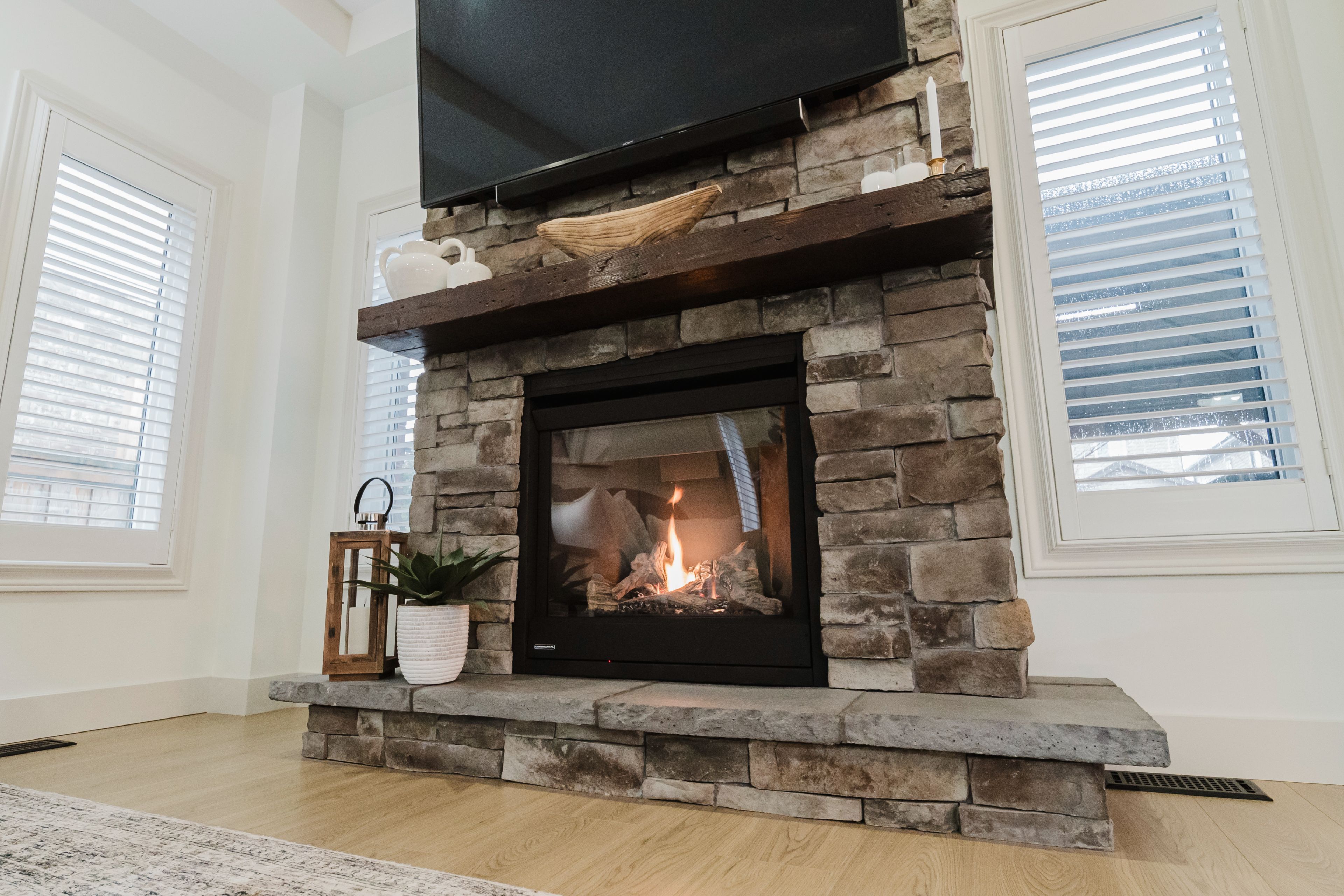 • Living room features a striking stone gas fireplace for comfort and warmth.