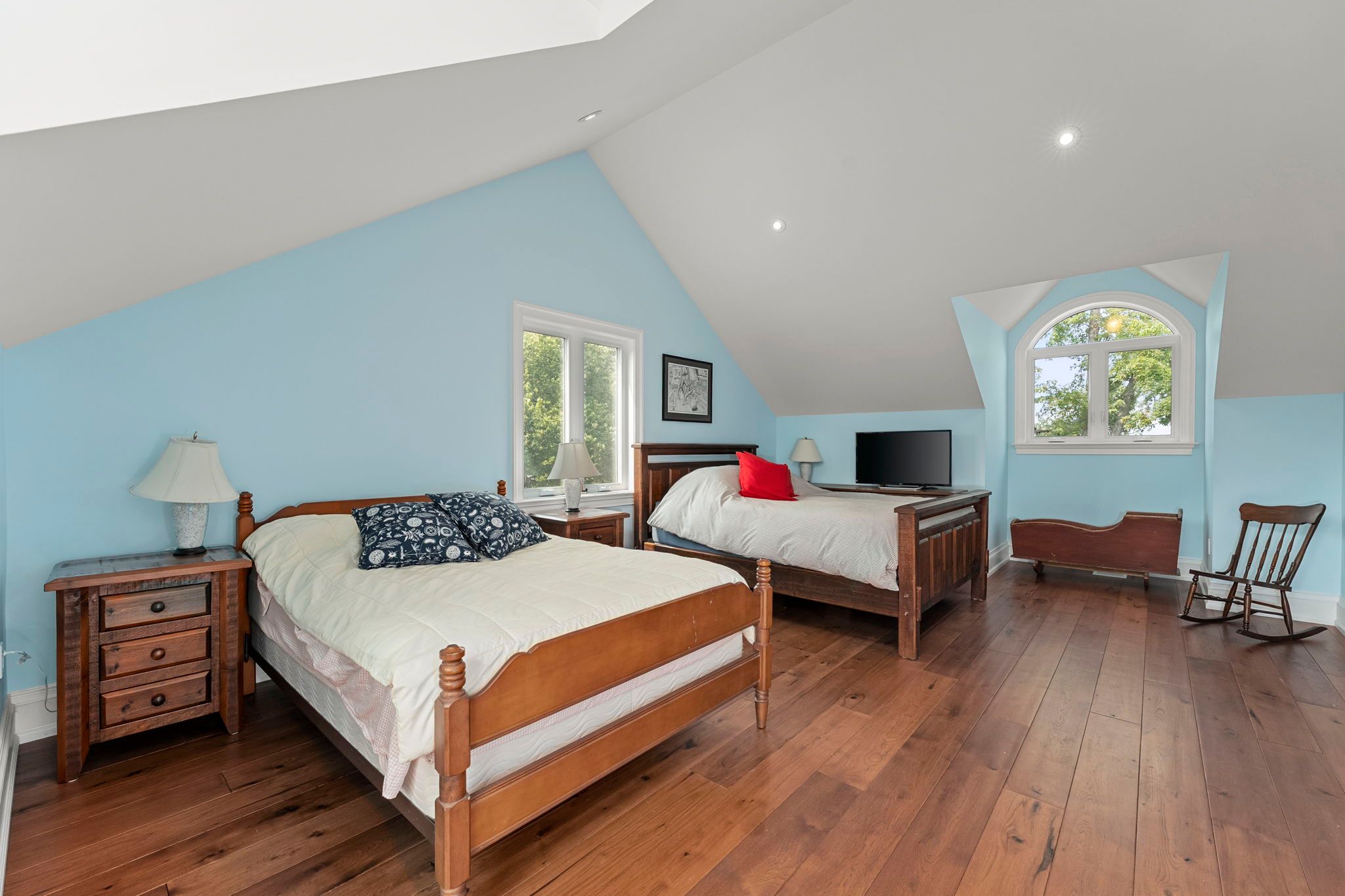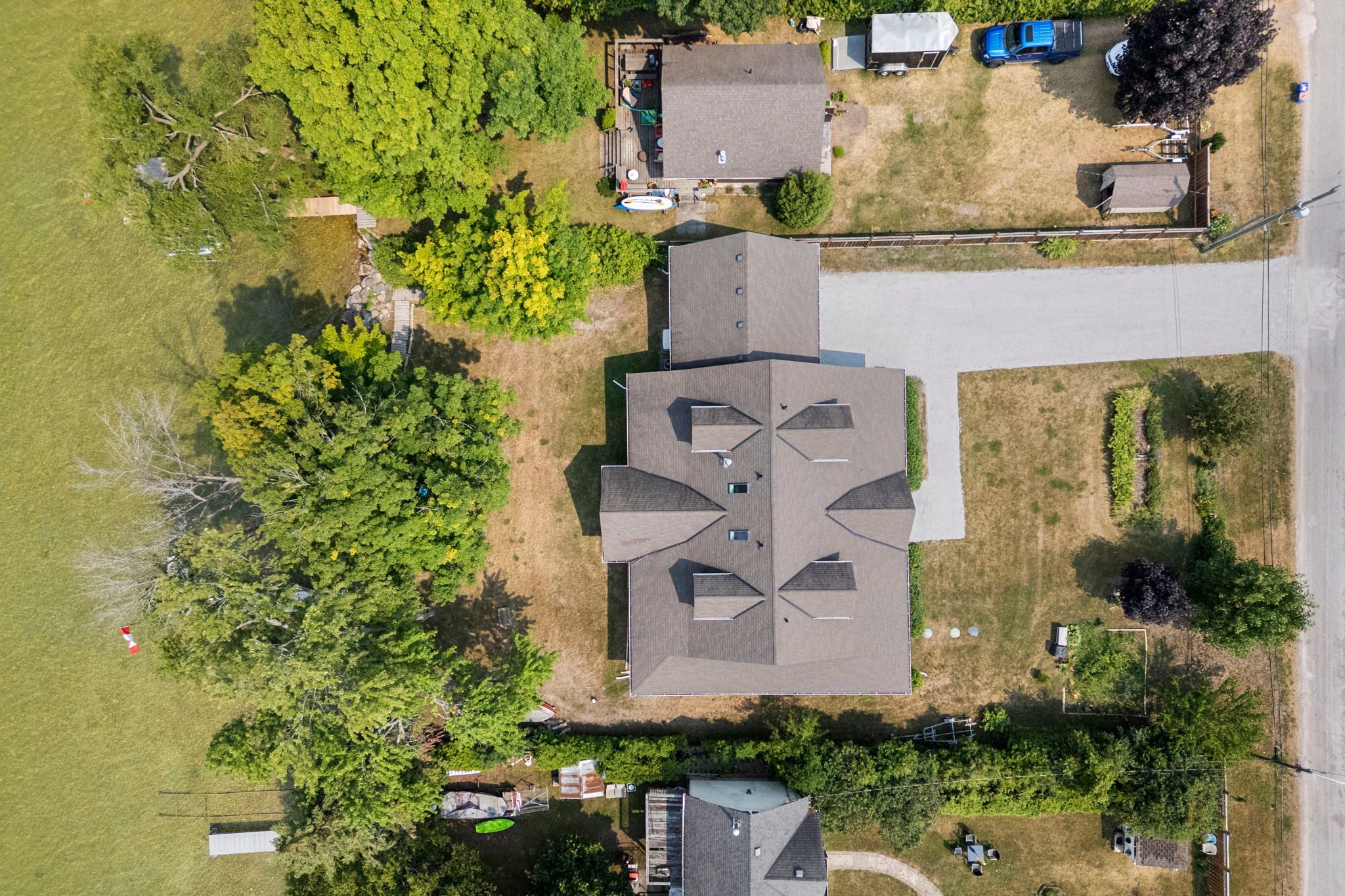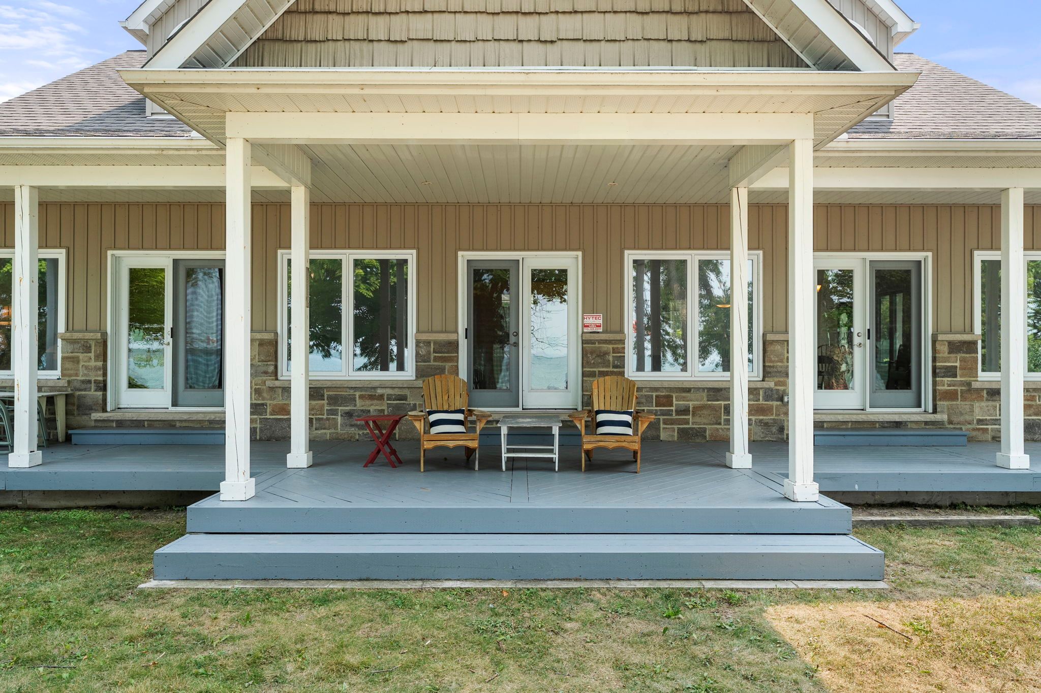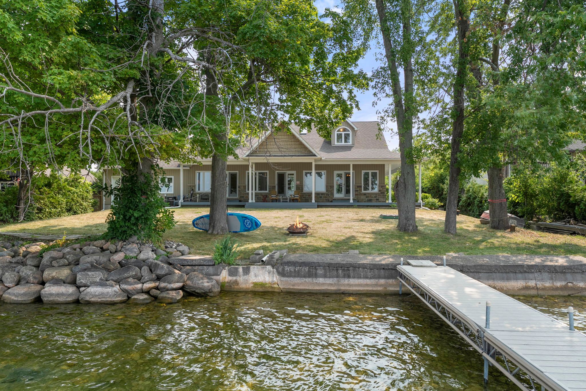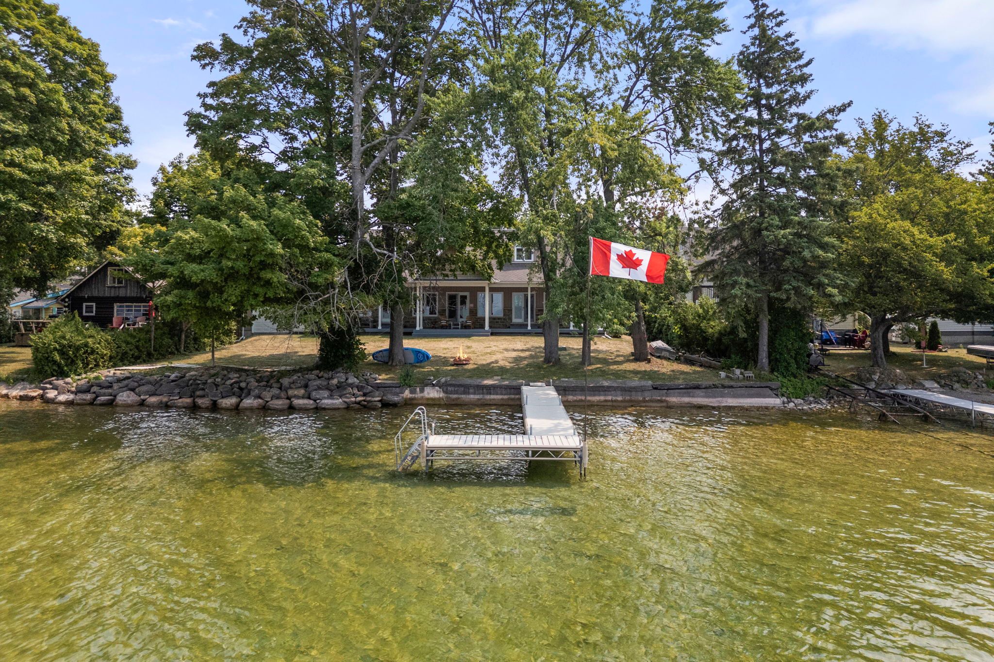 Welcome to a true year-round retreat with rare western exposure and 100 feet of clear, swimmable shoreline. This custom 2,963 square foot (per mpac) cape cod style bungaloft sits on a double width lot and captures uninterrupted sunset views from nearly every room, thanks to oversized bay windows and sliding doors that line the lake-facing side. The main floor features a chef's kitchen with a wolf gas range, wall oven and a massive island, all open to a bright living space with gas fireplace. The primary suite includes a 5-piece ensuite, lake views and direct access to the covered rear deck. Upstairs offers two vaulted-ceiling bedrooms and a large 5-piece bath, perfect for guests or family. The double garage includes a rare drive-through bay for launching watercraft directly from your property. Full-home generac backup generator, wraparound porch and parking for 8+ vehicles, boats or rvs complete the package. Located under an hour from toronto with quick 404 access and 30 minutes to the go, this is a one-of-a-kind waterfront lifestyle property built for all-season enjoyment.
