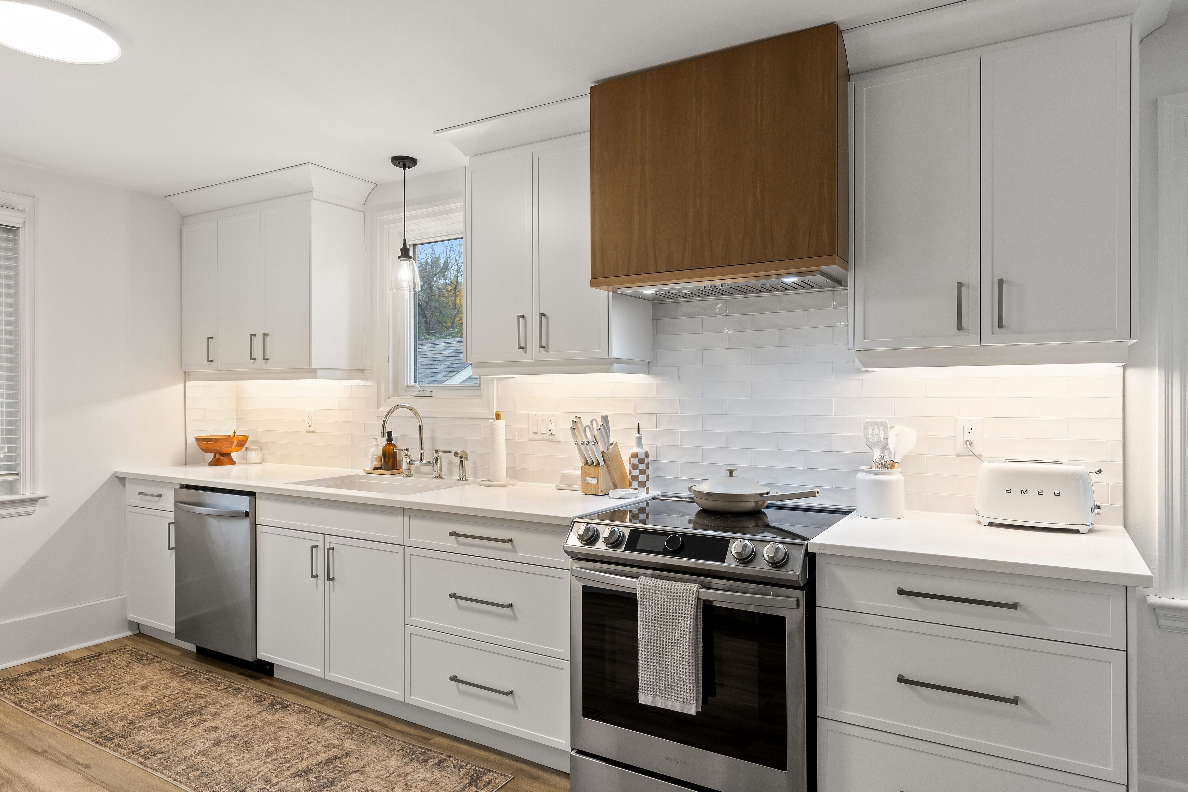 • Gourmet kitchen features quartz countertops, stainless steel appliances, and ample seating.