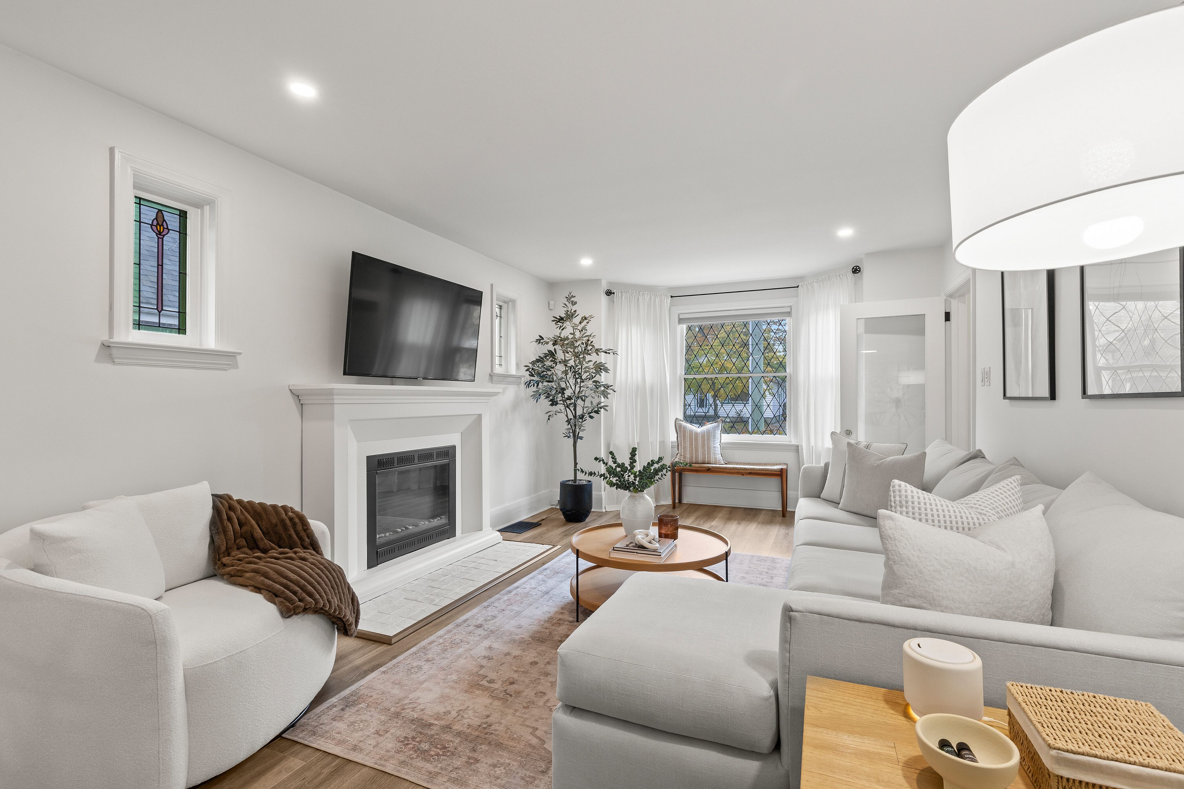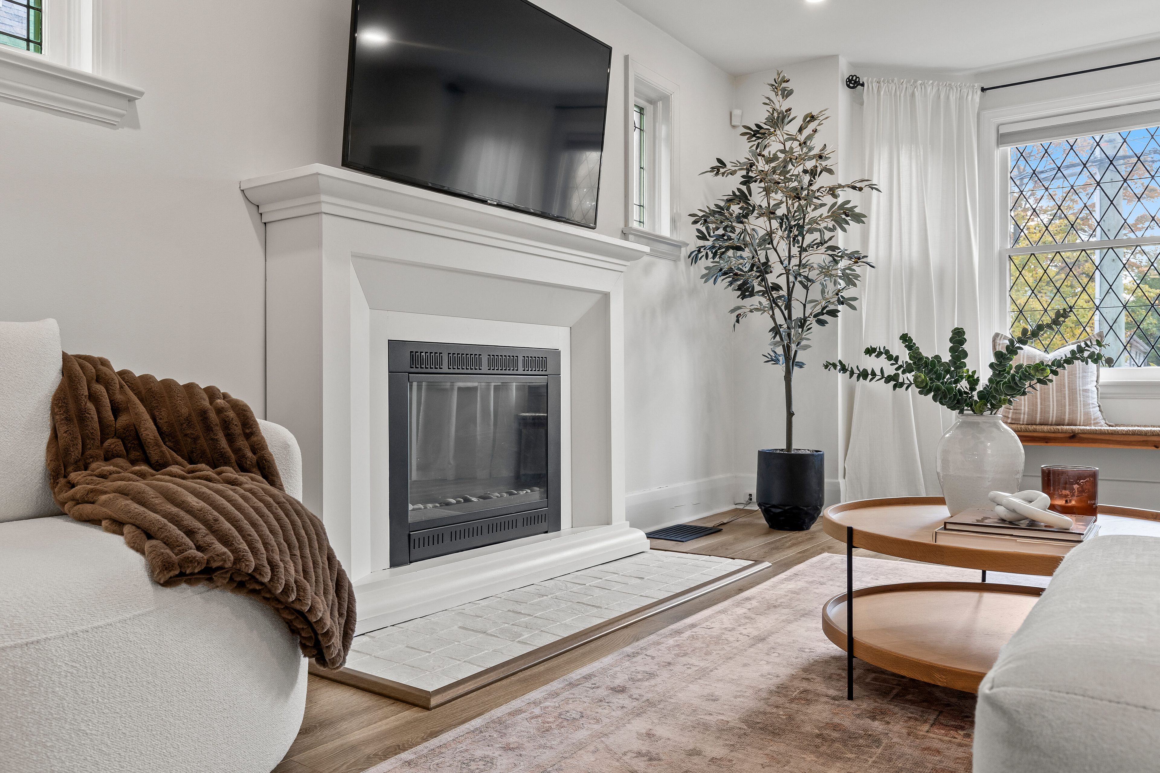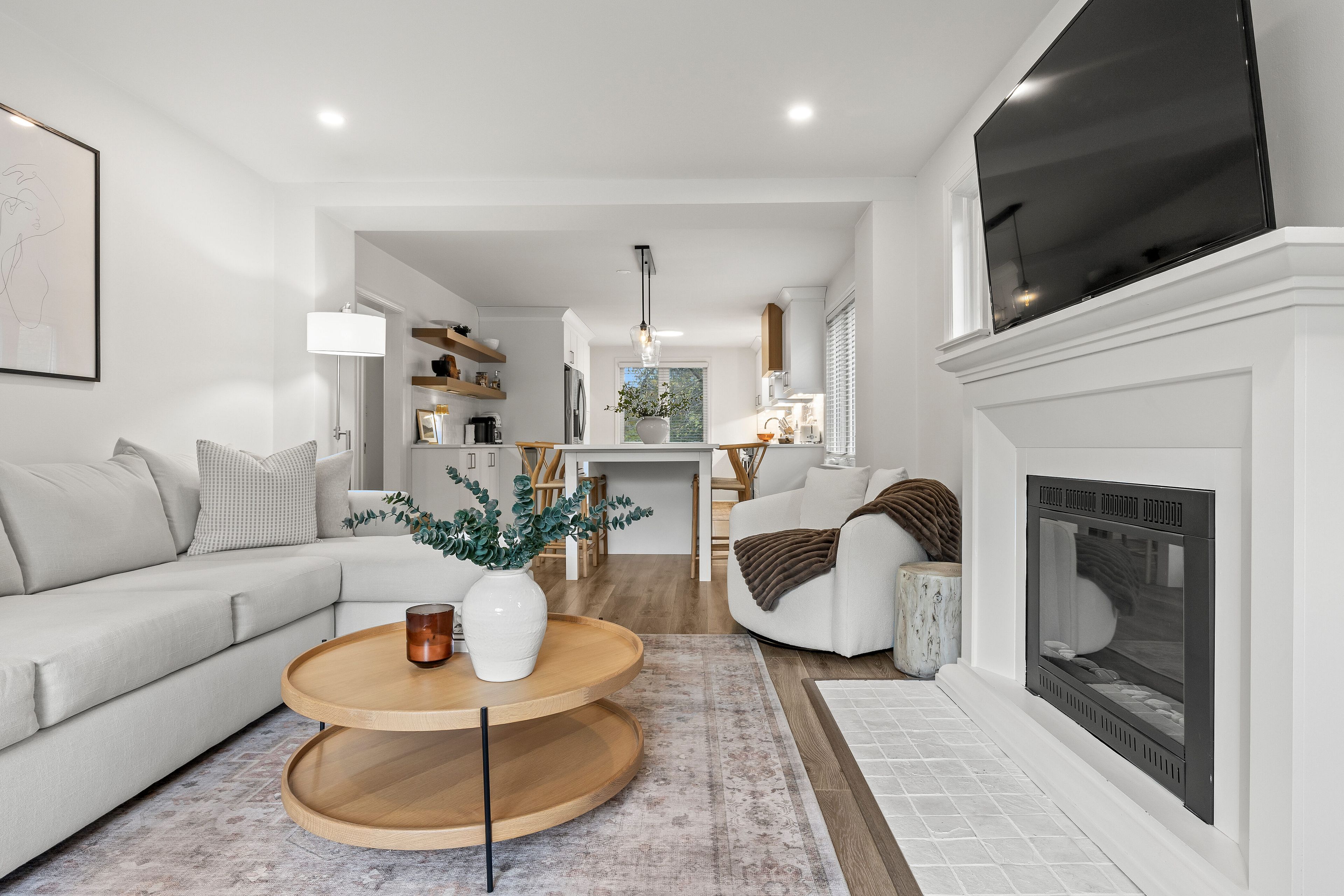• Open-concept main level with a spacious living area and updated gas fireplace.