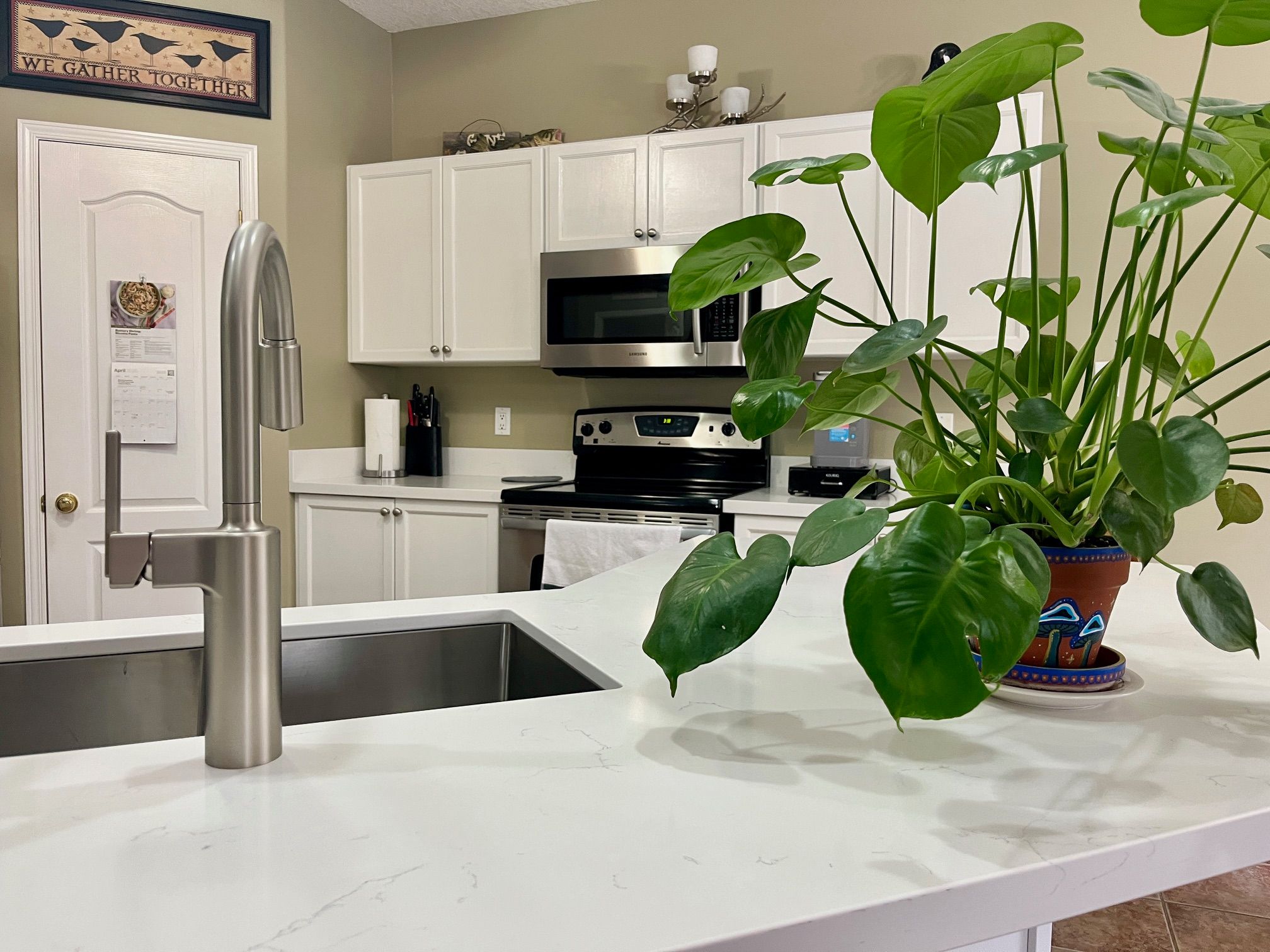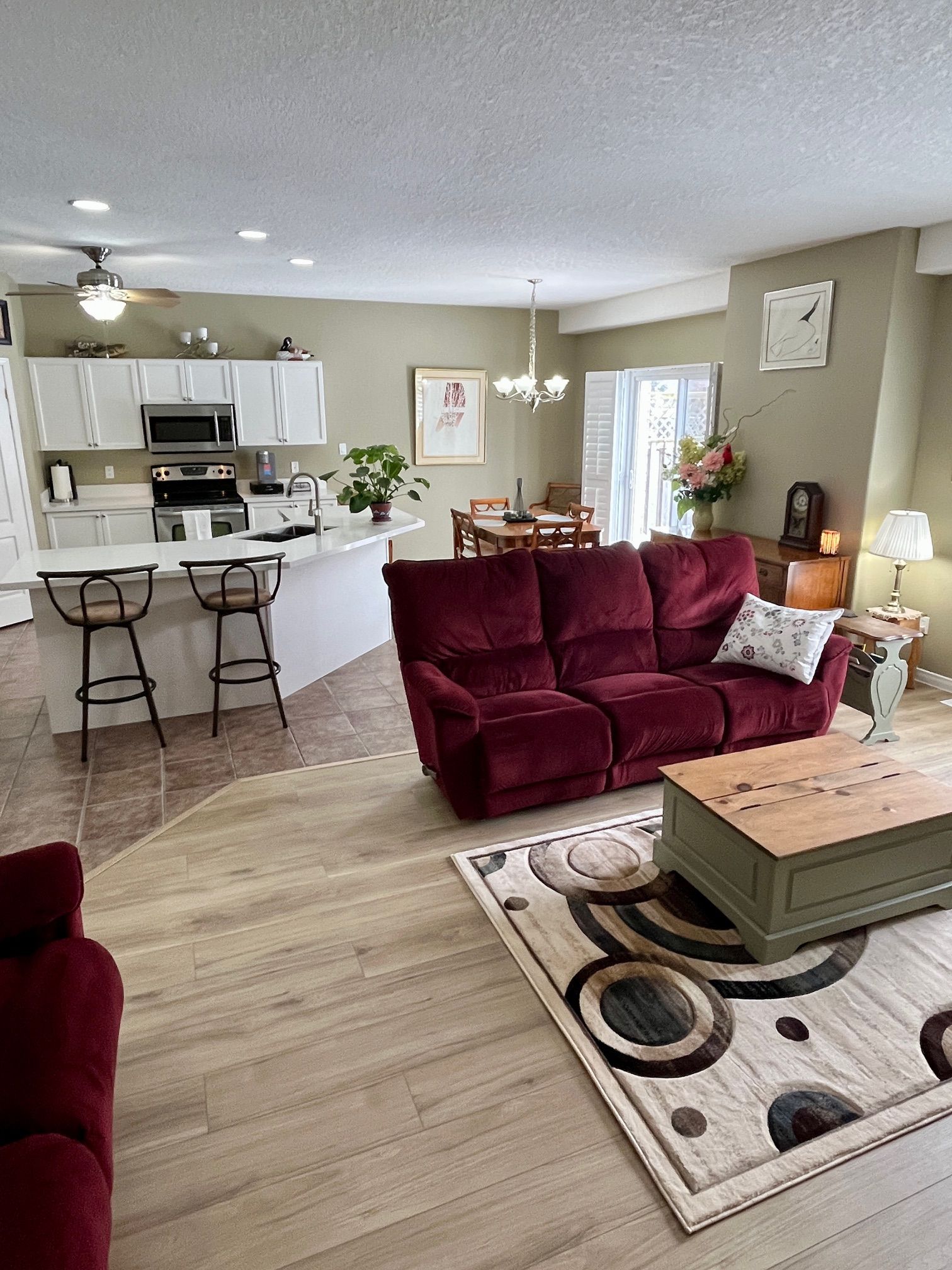• Recently renovated kitchen with quartz countertops and laminate flooring.