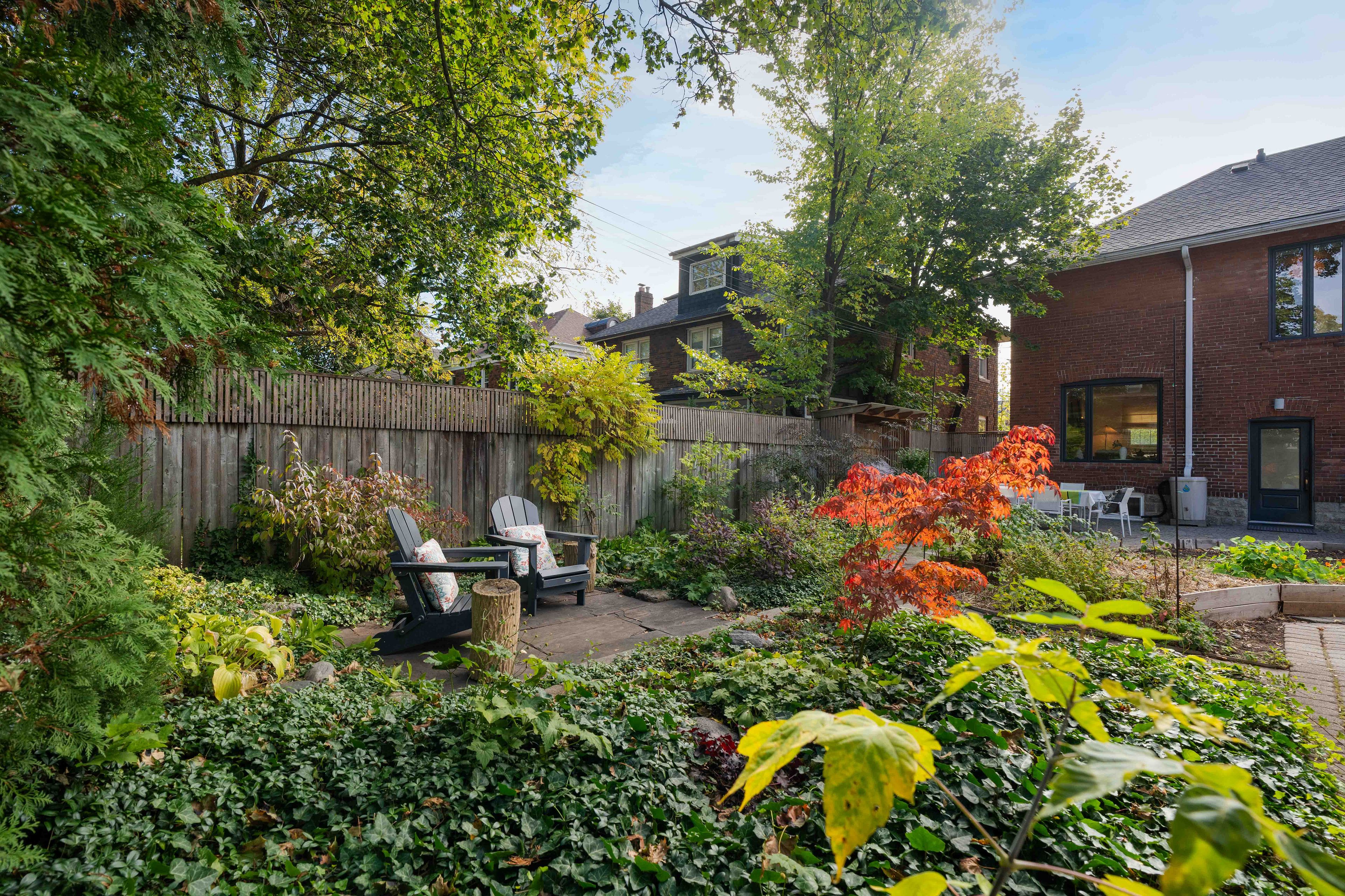 • Backyard includes gardens and interlock patio for outdoor gatherings.