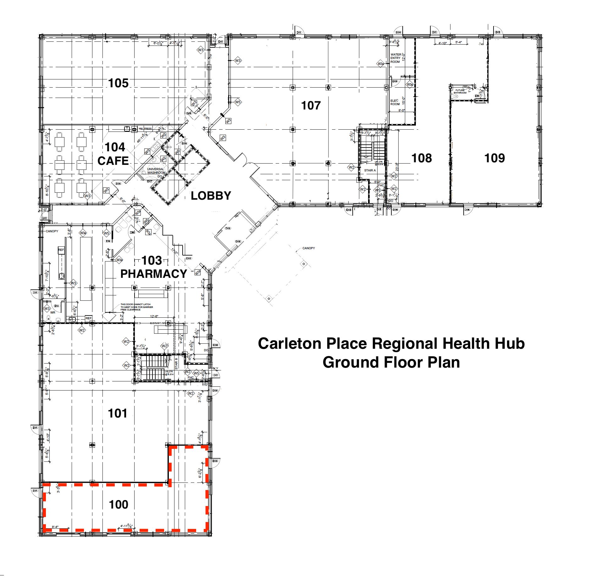 Health care provider opportunity. Now open and operating, the carleton place regional health hub is a purpose-built primary care facility merging all local family physicians into a single 15,000 square foot clinic. The hub serves the western outlying ottawa region from the ottawa western suburbs to regional towns such as perth and smith falls. The building currently welcomes 300+ patient visits per day and growing, creating exceptional exposure and referral opportunities for allied health providers. Physicians are looking to provide continuity and coordination of patient care by collaborating on-site with other inter-professional health providers. A strong tenant mix is already in place including pharmacy, hearing, optical, psychotherapy and counselling services. Carleton place is the epicentre of west regional ottawa, canada's fastest growing region, with easy access to a population basin over 600,000. Retail has responded to the region's growing needs with a strong presence in carleton place including numerous big-box players. The health hub is a proactive response to the region's lacking, yet continuously growing, need for primary care delivery. Exciting opportunities remain for collaboration, including podiatry, dentistry, endoscopy, dermatology, pain management, and others. Units available from 1,000 to 8,000. Some units can be merged for larger users. Unit 100 offers approximately 1,088 sq. Ft. And features a bright ground-floor end-cap corner unit with excellent natural light provided by the windows on 3 sides. The unit benefits from direct exterior access off of the parking lot, strong visibility, and prominent signage opportunities, making it ideal for a variety of medical, wellness, or complementary retail users.