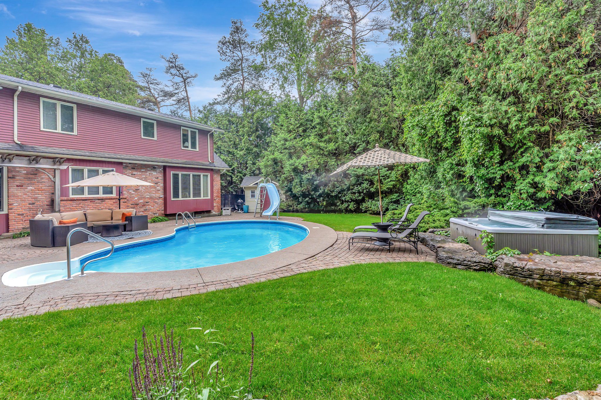 Private estate living - 22 deerpath court, an extraordinary residence tucked away on a quiet cul-de-sac, surrounded by towering trees and beautifully landscaped grounds. Situated on 1. 17 private acres, resort-like property, this custom home offers over 5,018 sq ft of living space across 3 meticulously designed levels. The long, rounded driveway flows effortlessly toward an impressive 3-car garage & inviting covered front porch. Step inside the grand foyer, where a sweeping staircase, slate floors, and intricate trim work set the tone for timeless elegance. To your right, the formal living room offers rich herringbone hardwood floors & a statement fireplace-perfect for hosting guests or quiet evenings by the fire. The heart of the home is the magazine-worthy kitchen, featuring custom cabinetry, luxury appliances, stone counters, and a butcher block island. The bright breakfast area & family room are wrapped in windows with incredible views of the backyard retreat. Sunlight pours into the bonus sitting room-an ideal space to curl up with a coffee and take in the peaceful, natural surroundings. The main floor also offers a private office with fireplace, a spacious formal dining room, & a luxurious primary suite with double walk-in closets & spa-like ensuite overlooking the pool. Upstairs, you'll find 3 generous bedrooms, 2 full bathrooms, & ample storage. The fully finished basement expands your living space with a rec room, bedroom, 3pc bathroom, and abundant storage, plus direct garage access-perfect for multi-generational living or future in-law potential. Step outside and discover your private oasis: an inground pool with slide, hot tub, lounging areas, and manicured gardens create the ultimate space for summer entertaining. This home truly combines luxury, privacy, and function in one of cambridge's most desirable enclaves, just minutes to shopping, trails, golf, & highway access. Welcome to your forever home on deerpath court-where every day feels like a getaway.