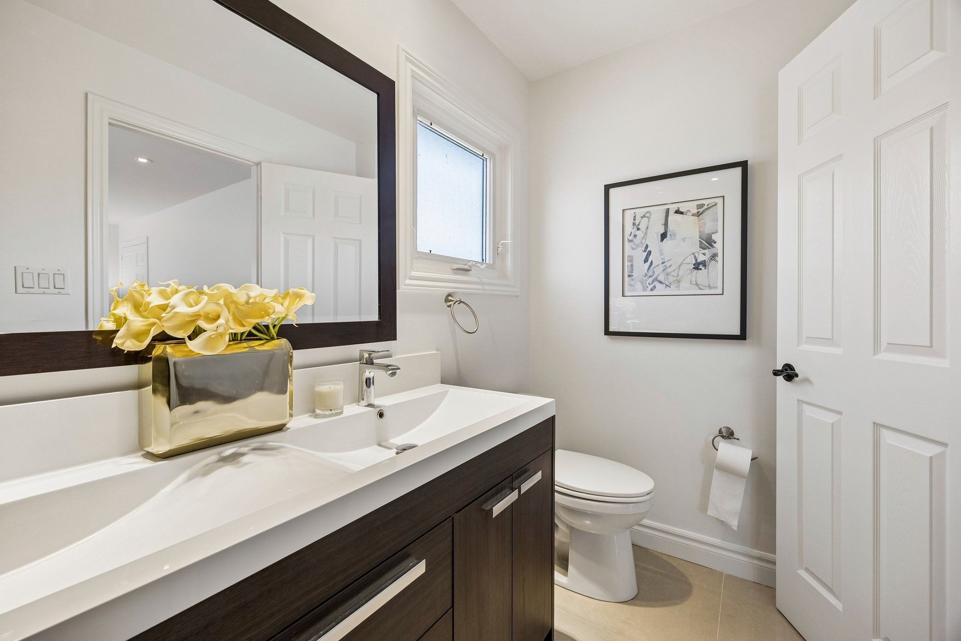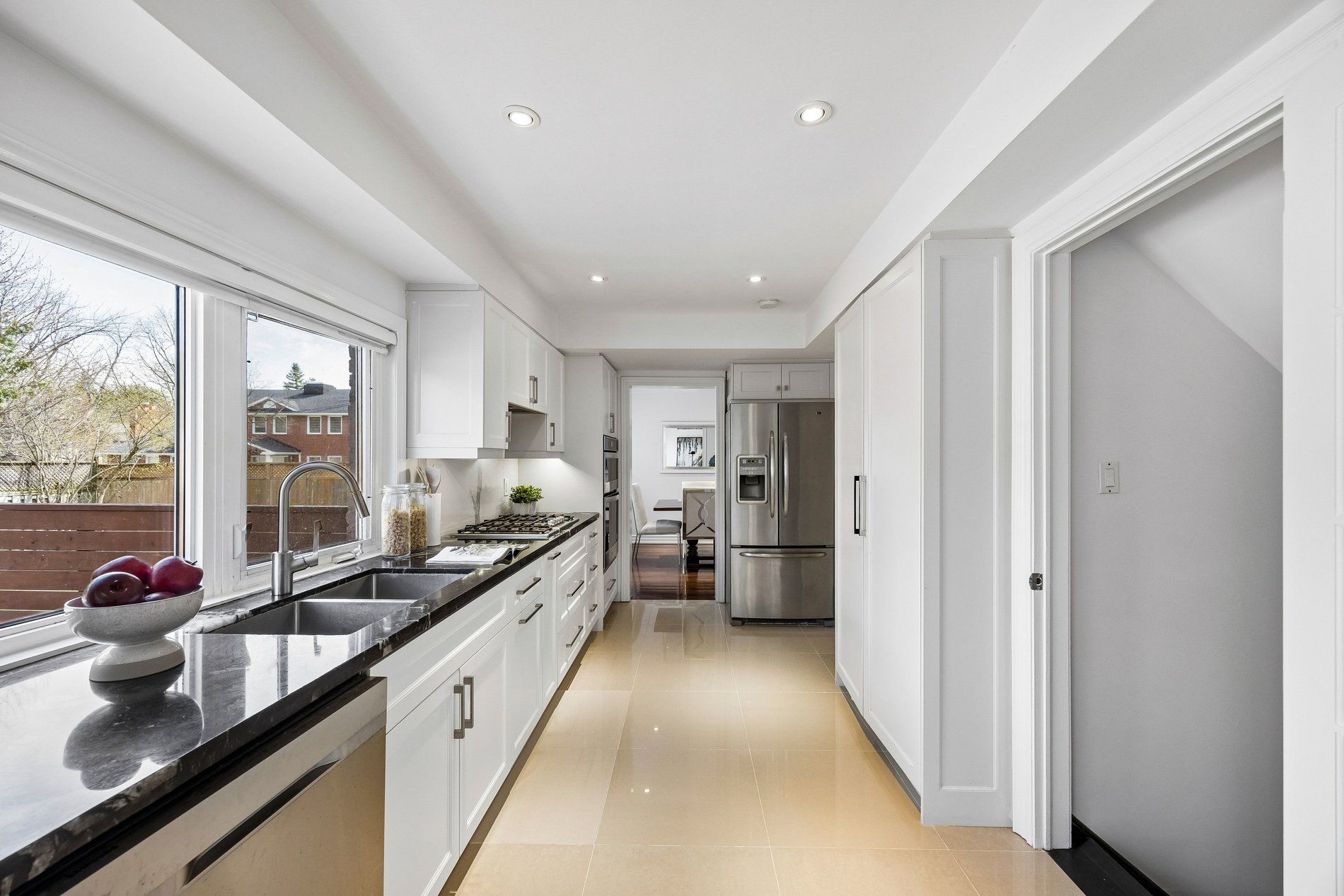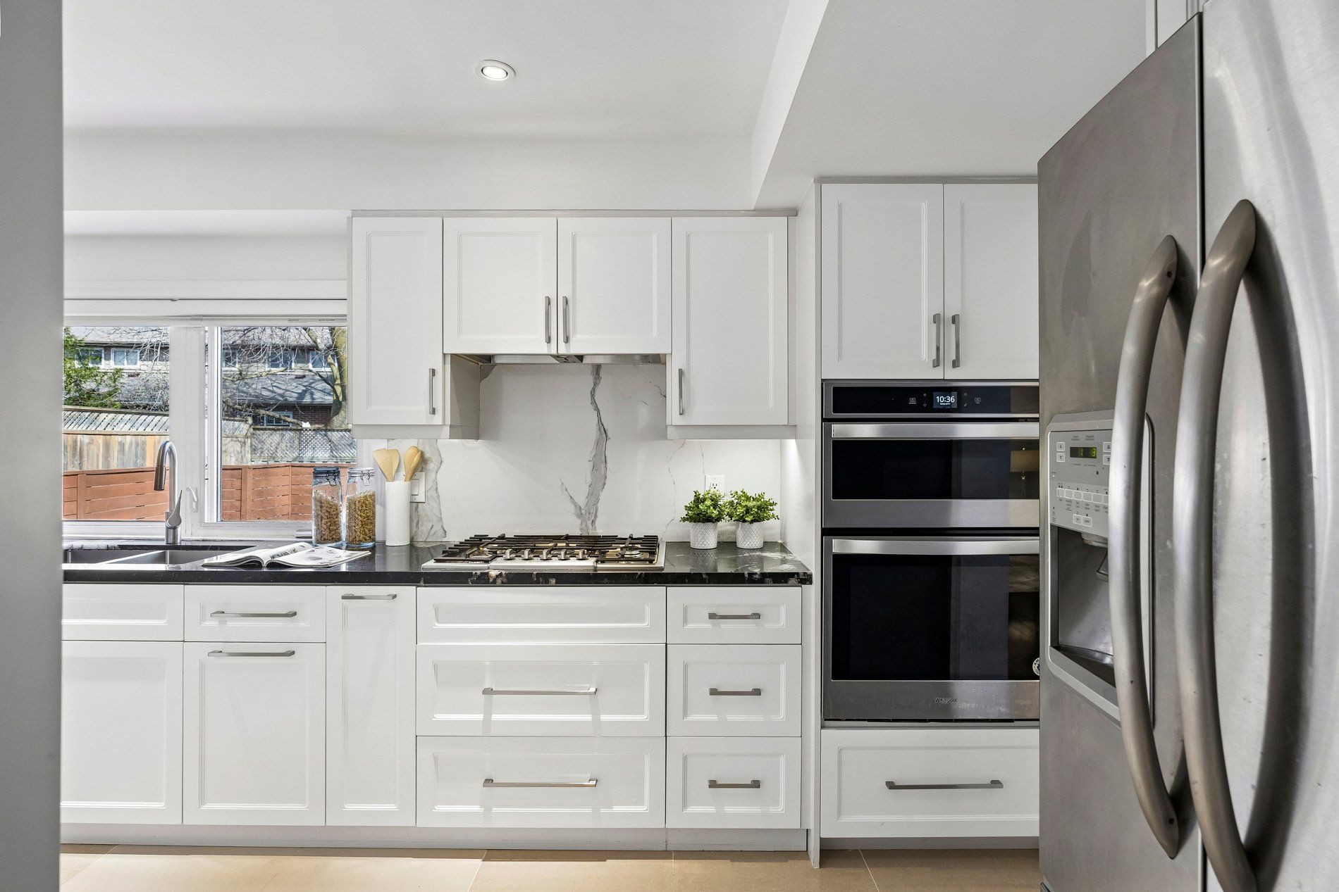• Renovated kitchen with large windows and elegant finishes.