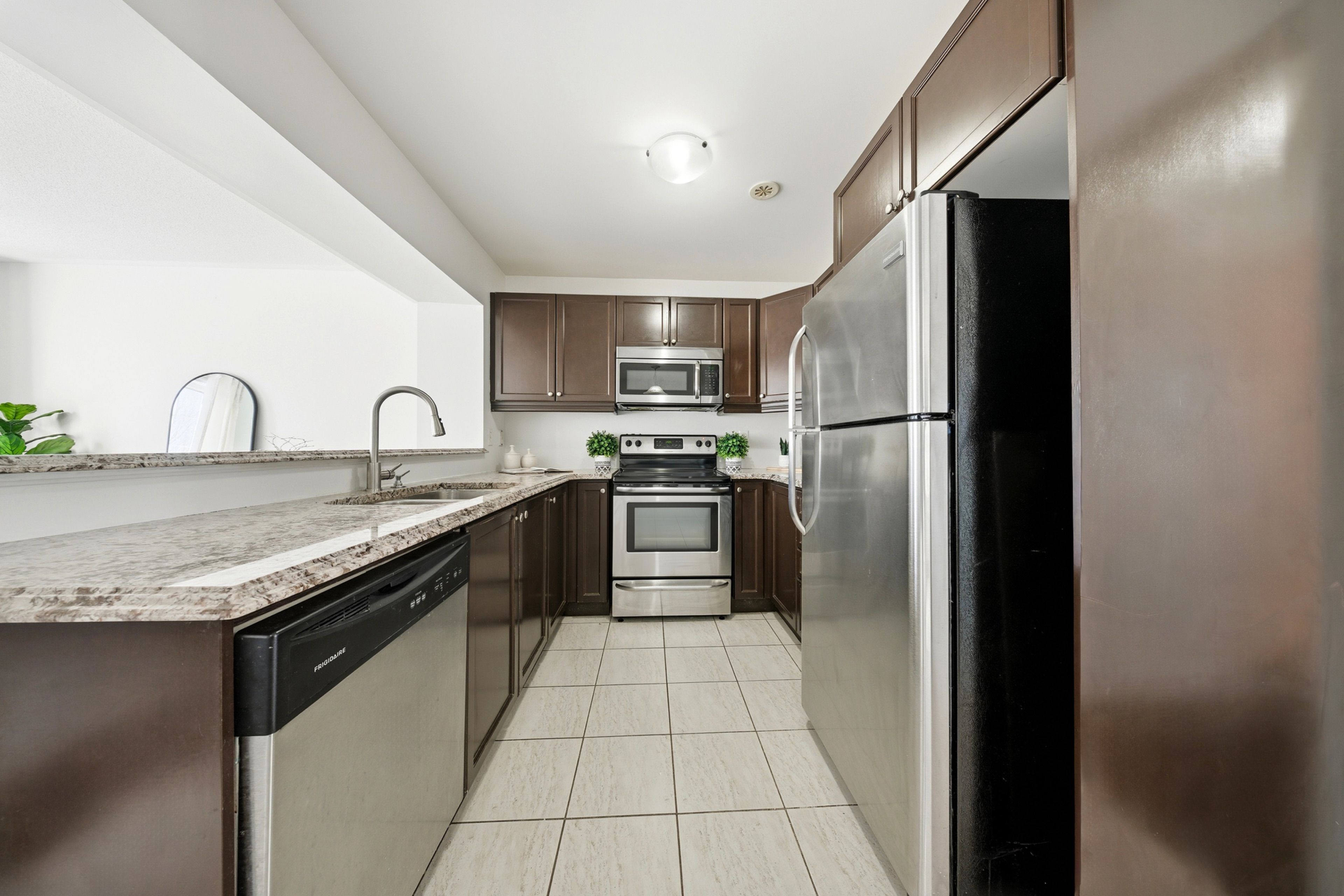 • Bright kitchen with granite countertops and stainless steel appliances.