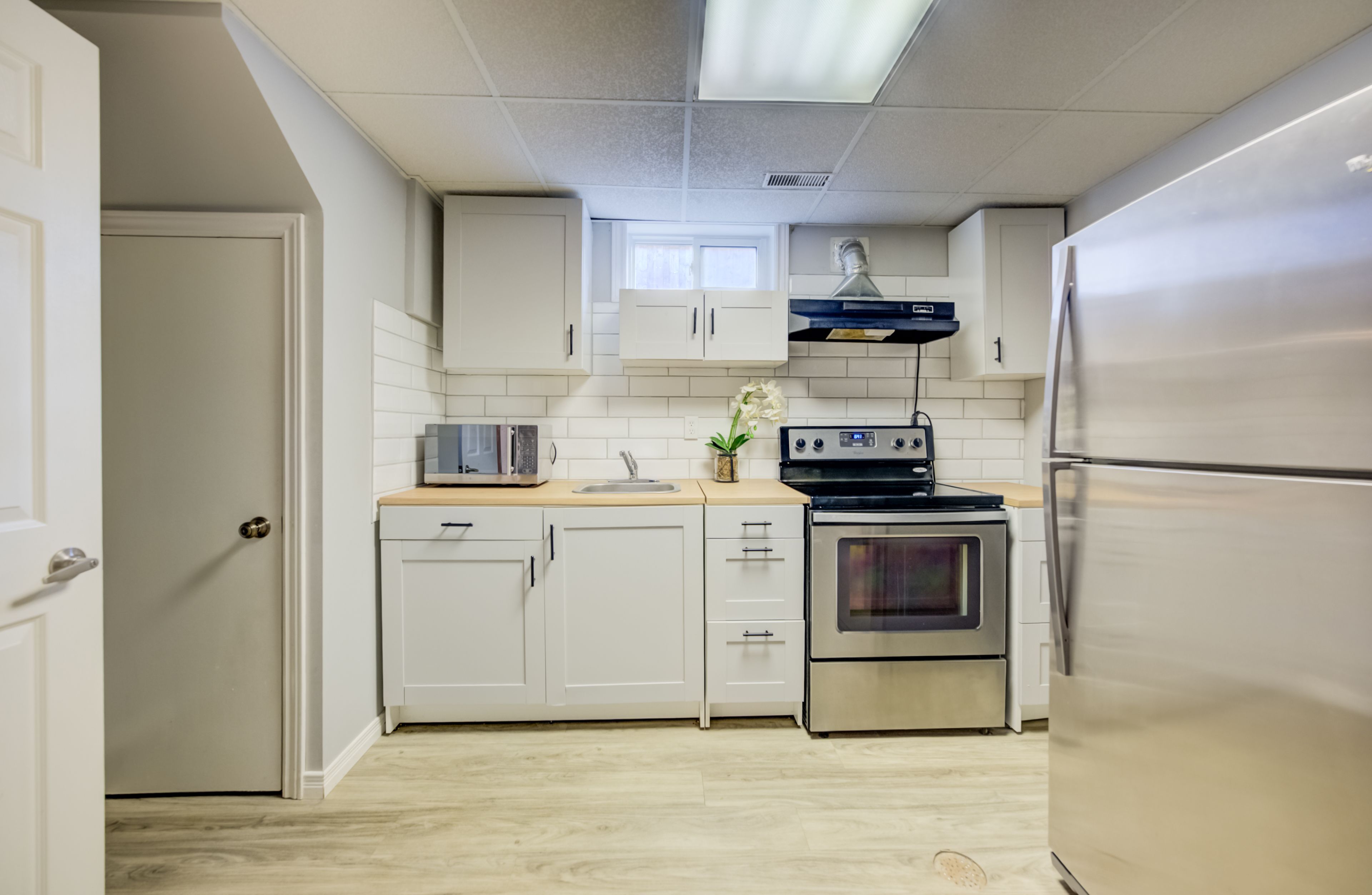 • Modern kitchen with stainless steel appliances and ample prep space.