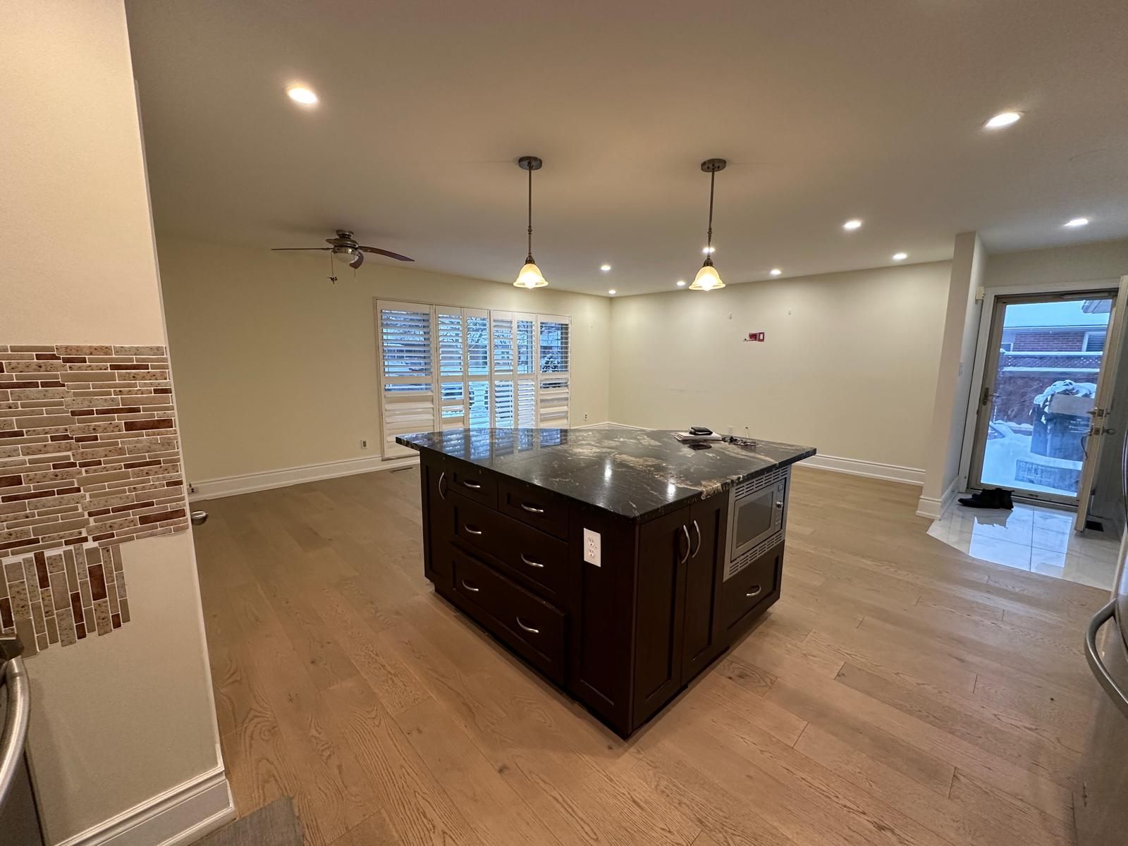 • Modern kitchen with quartz countertops and a large breakfast bar for cooking.