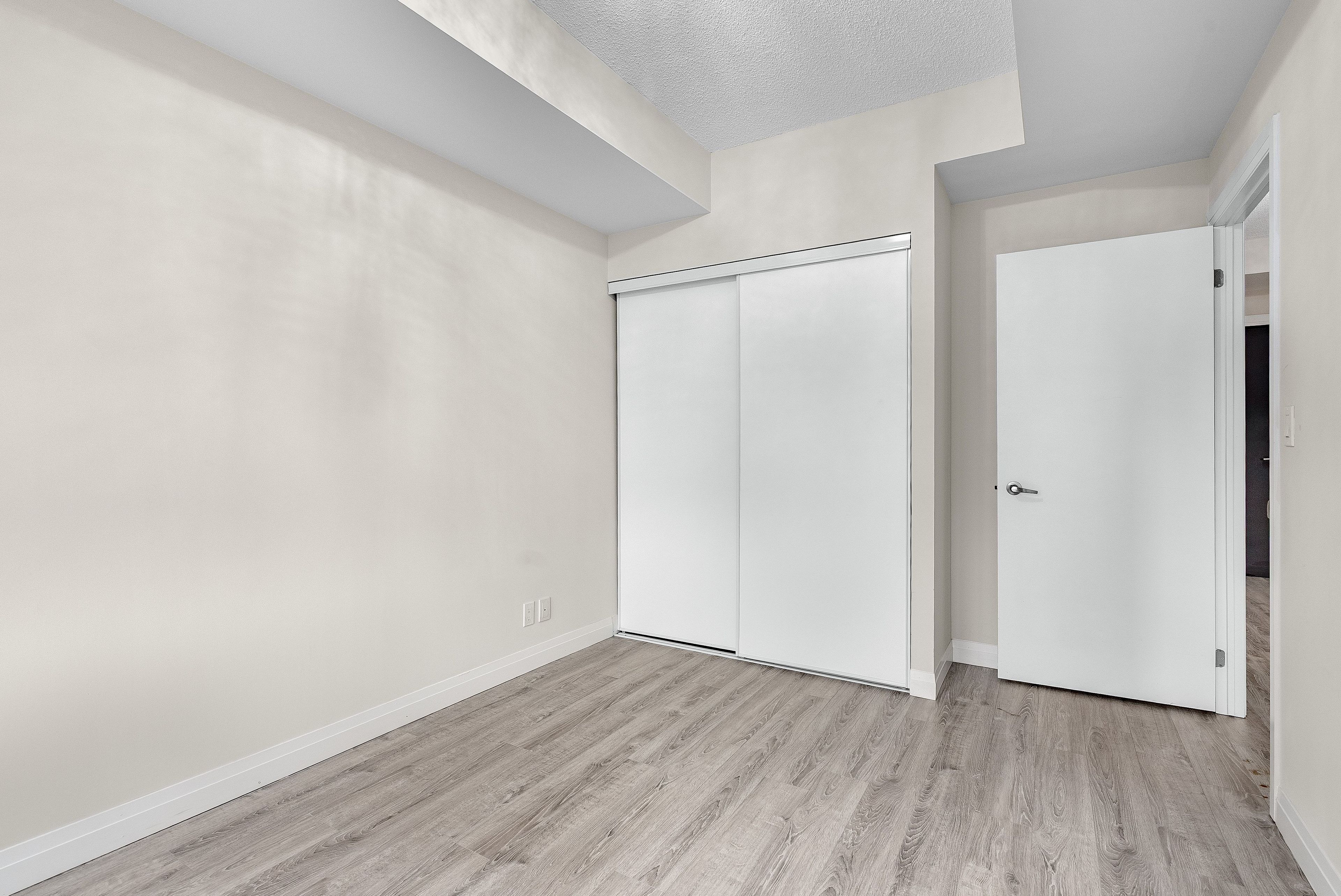 • Spacious bedroom featuring double closets and shelving for storage.