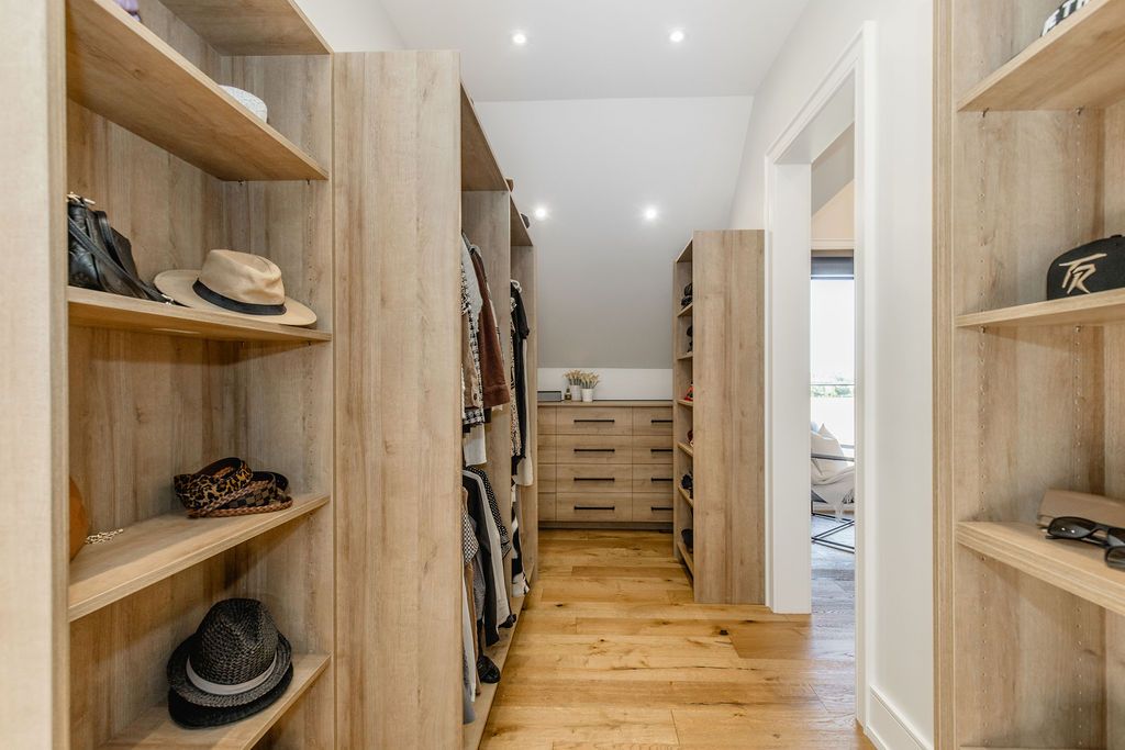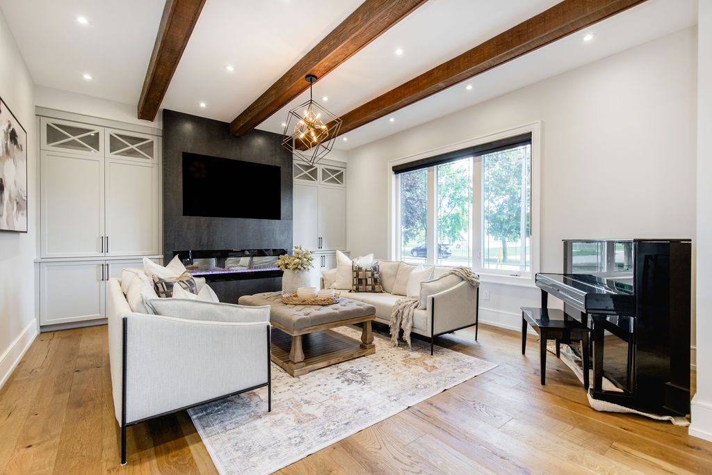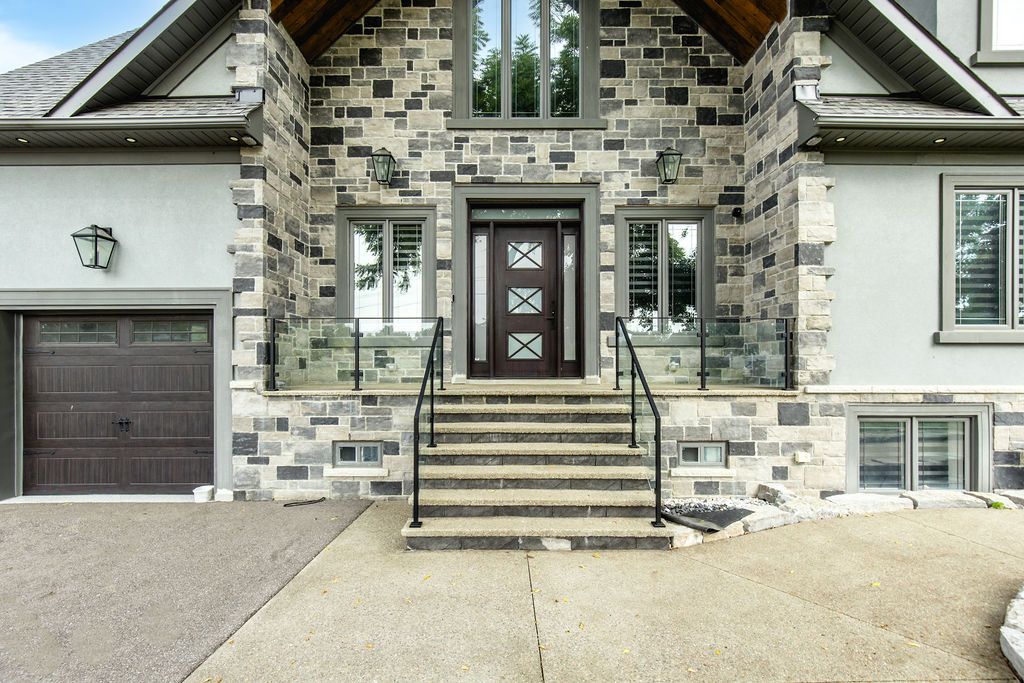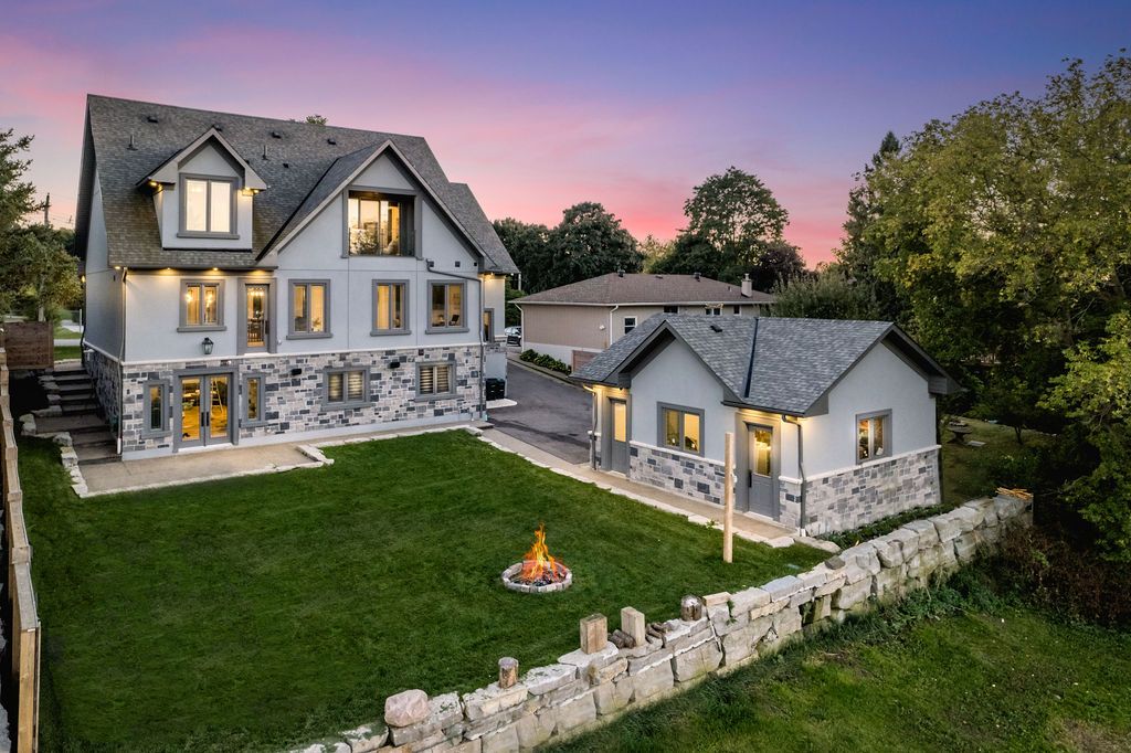 Backs onto protected land. This stunning luxury home is situated on a quiet dead-end st, w/views of the countryside, + steps from park/rink/courts/library. This thoughtfully designed home offers an elegant, vibe, w/high end craftsmanship, featuring a stone + stucco exterior w/exceptional curb appeal. Upon entering, you are greeted by a grand entrance w/ heated porcelain tile floors, a custom wood staircase w/glass railing, + vaulted ceilings that create an inviting ambiance. The main level showcases engineered white oak flooring + exposed beam accents. The spacious living room offers custom-built cabinetry, a tiled feature wall with a built-in electric f/pl, + space for a tv. Adjacent is the elegant dining room, equipped w/ built-in cabinetry, dry bar, quartz counters, backsplash, +under-mount lighting perfect for entertaining. The family room flows directly from the dining room, offering a 2nd tiled wall w/ built-in electric f/pl, lg windows + seamless transition. The gourmet kitchen is classy, featuring an oversized island, quartz countertops, high-end s/s appliances, incl a gas range w/ a custom range hood + walk-in pantry. A private office w/views + a mud/laundry room w/heated tile floors, inside entry to garage w/ epoxy floors + w/up from basement. 25 ft ceilings impress, flowing into 2nd flr w/white oak flooring that continues throughout, leading to the luxurious primary suite. This retreat incl access to private balcony, a walk-through closet w/ built-in organizers, + 6pc ensuite w/ dbl sinks, soaker tub, + large glass shower. Two additional bedrooms each have their own 3pc bathrooms w/ tiled showers + heated floors. The basement offers versatility, featuring expansive rec room + walk-out french doors leading to the patio, providing in-law potential. This bright space offers luxury plank floor, full kitchen, 2 bedrooms, + a 3pc bathroom. Outside, enjoy an add. Detached,heated 2-car garage w/ gas + water lines for future pool installation.