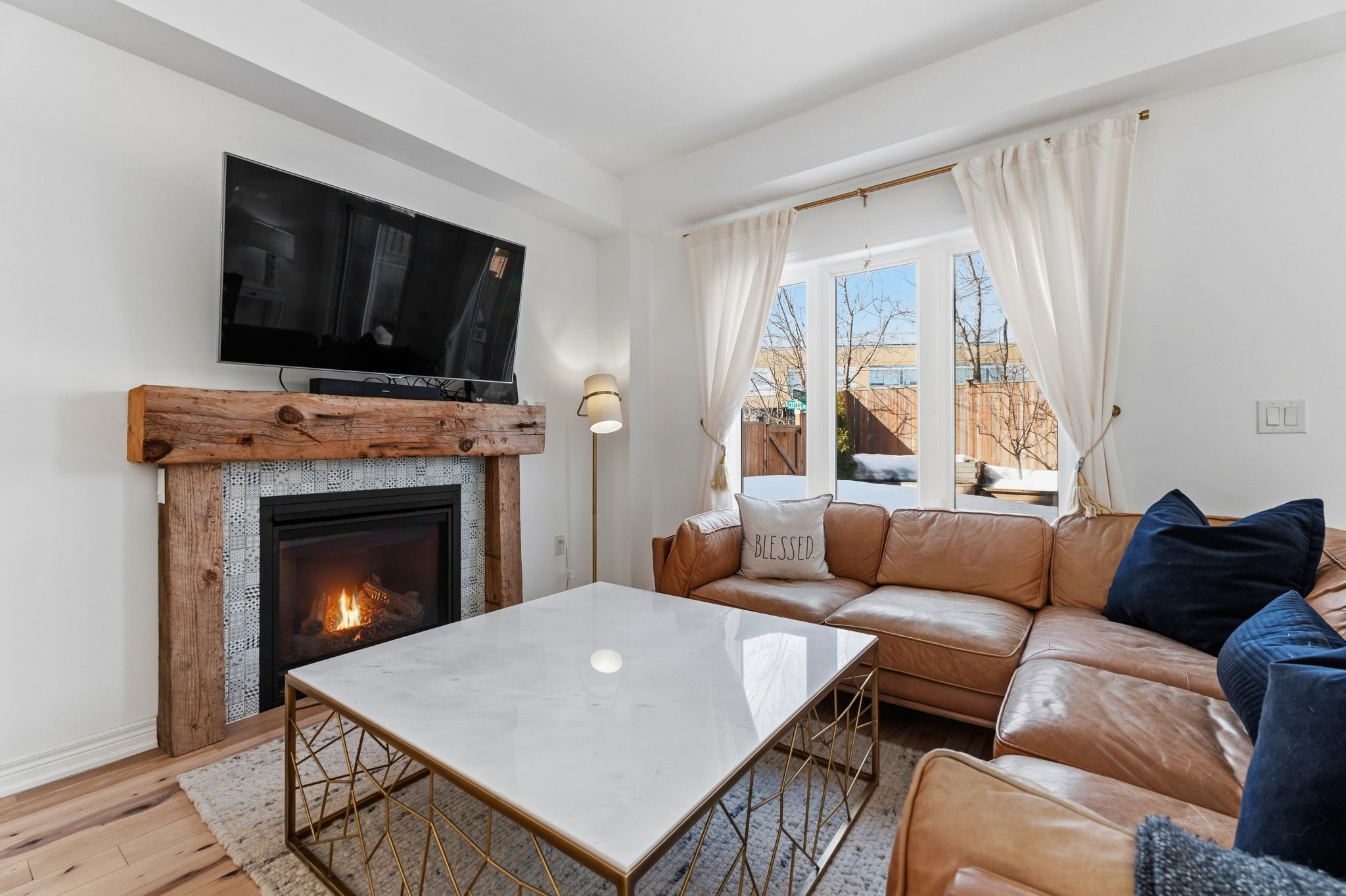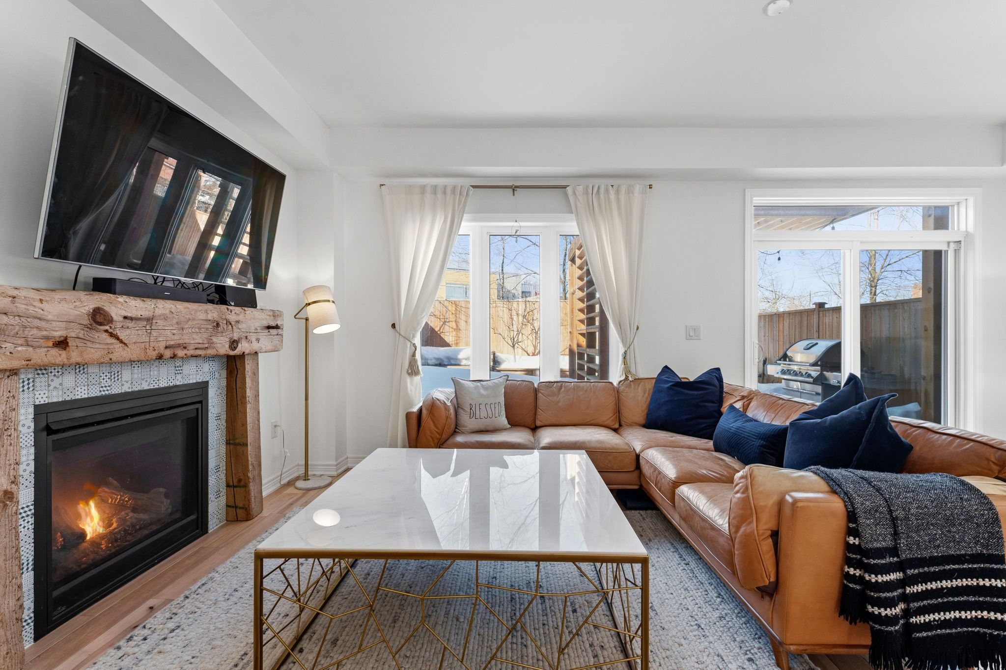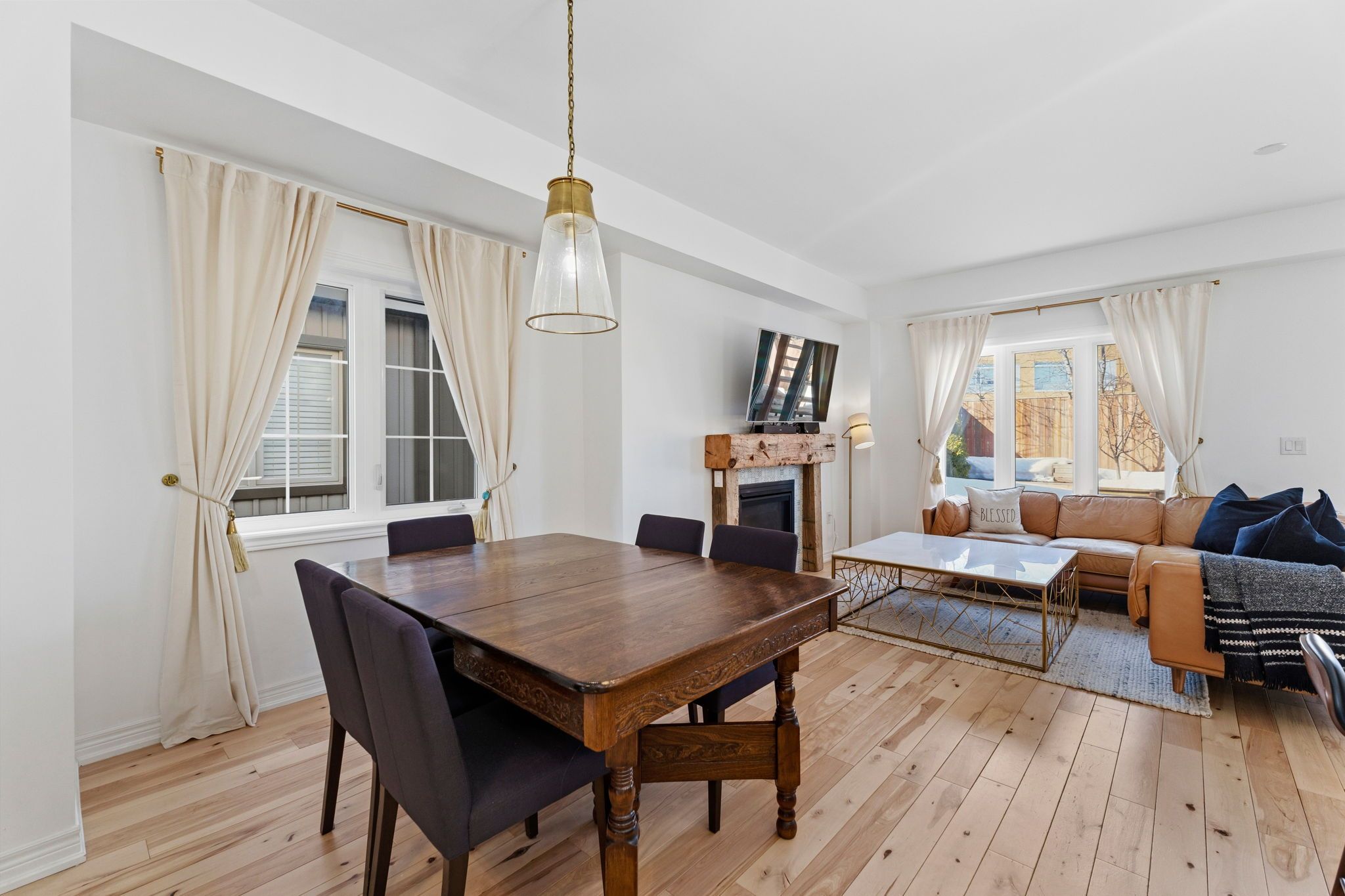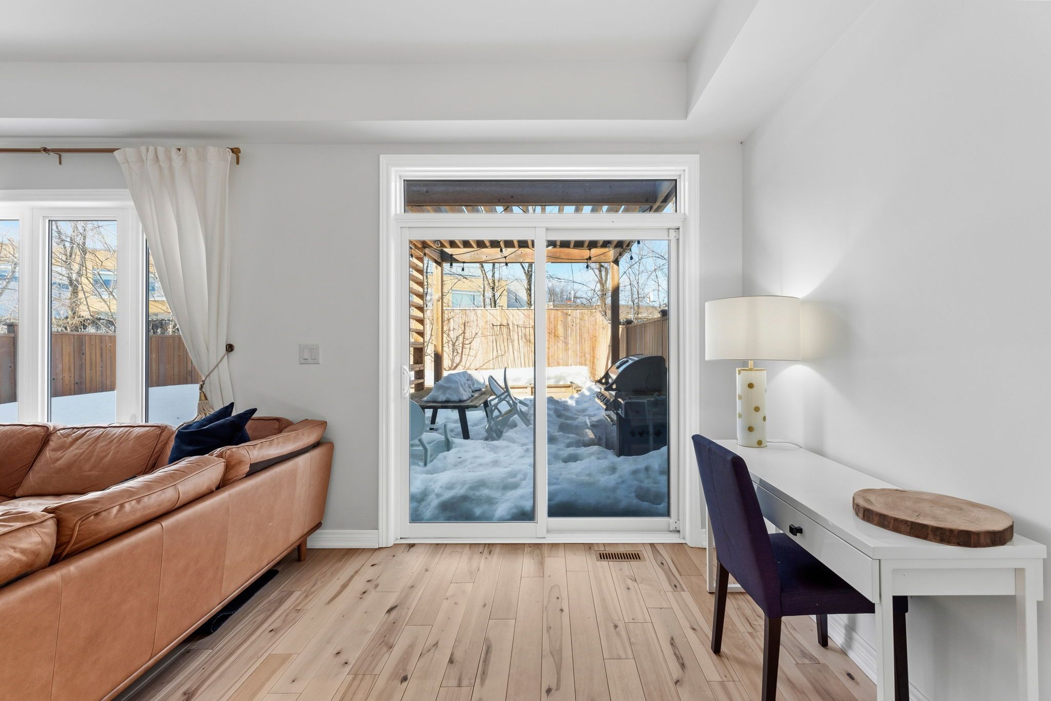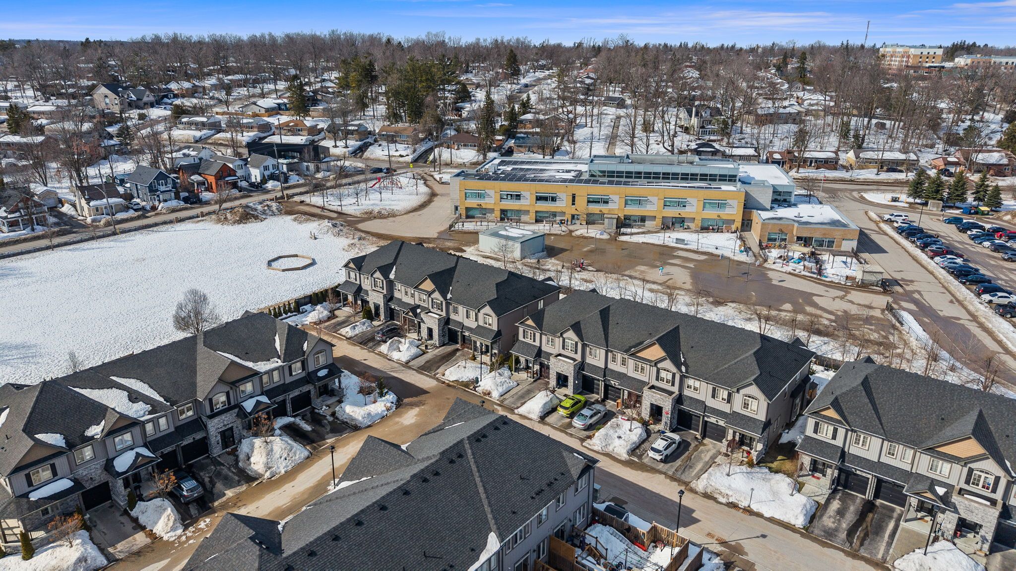 ** watch listing video ** welcome to this spacious, two-storey, freehold end-unit townhome offering over 2,000 sq ft of total living space in a desirable neighbourhood in upper north ward orillia. The main floor features a bright, functional layout with a welcoming living room, a separate dining area, and an open-concept kitchen with quartz countertops and a breakfast nook overlooking the backyard. Maple hardwood flooring was installed on the main floor in 2021, adding warmth and durability to the main living areas. Interior access to the garage provides everyday practicality. The living room features a napoleon gas fireplace with wood accent exposure framing that adds character and warmth to the space. Upstairs you will find three generously sized bedrooms, including a spacious primary suite with a walk-in closet and private 4pc ensuite bathroom. The additional bedrooms offer flexibility for family living, guest accommodations, or home office space. For further convenience, there is a second-floor laundry room. The finished basement, completed in 2020 with pine wood finished on the ceiling, gives off a spa-like feeling. This valuable additional living space includes a large custom bathroom with an electrical hookup for a sauna. It features a napoleon gas fireplace, a custom-built murphy bed, a storage room and additional storage areas, making it ideal for guests, extended family, or a comfortable recreation area. Outside, the fully fenced backyard features a deck and pergola completed in 2018 and backs onto mature trees and lions oval public school, creating a peaceful and private setting for relaxing or entertaining especially during the summer. This thoughtfully maintained home combines functional living space, practical upgrades, and a private backyard setting perfect for growing families. Finally, the location truly can't be beaten; it's within walking distance of everything you need.