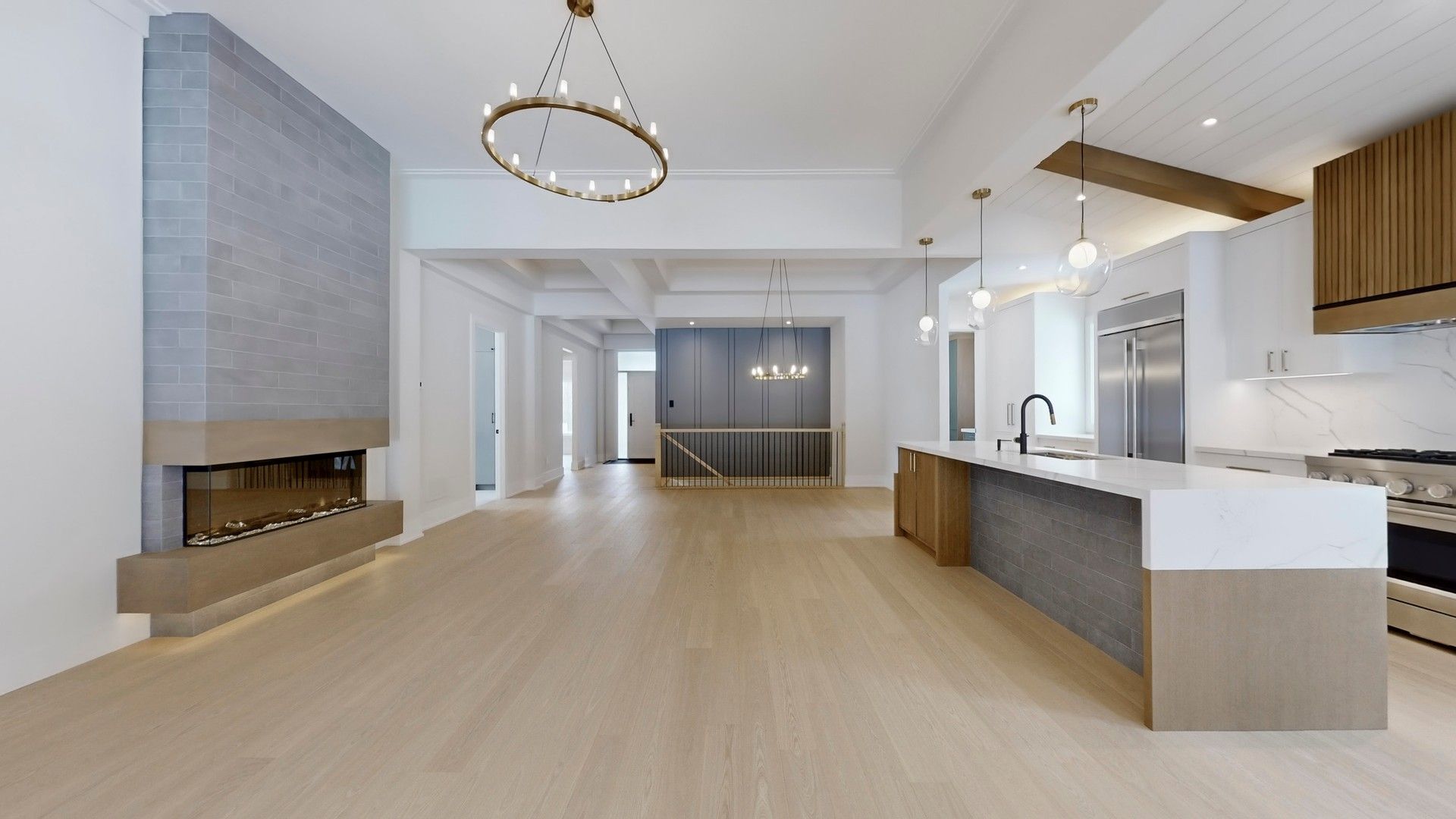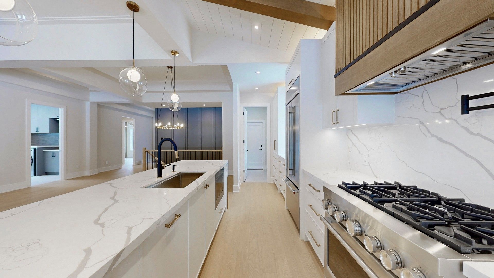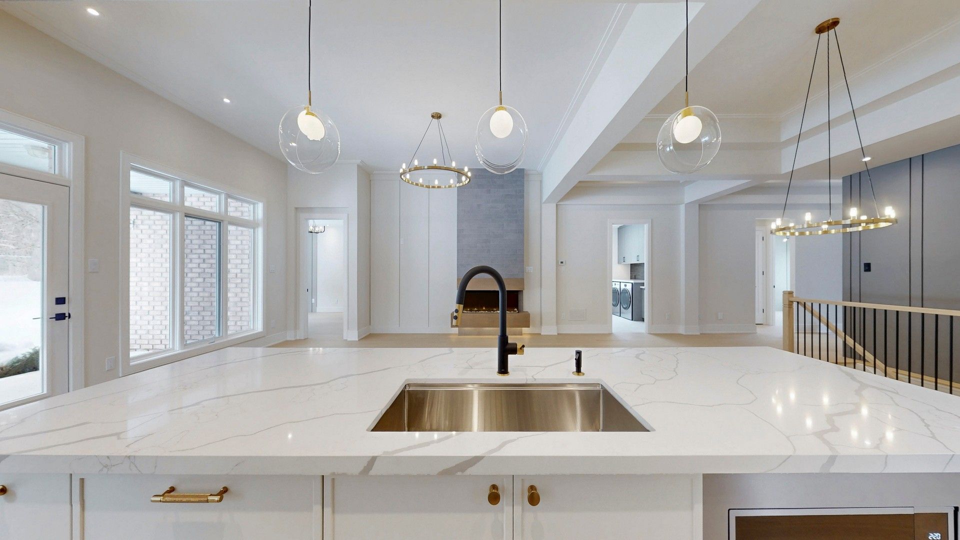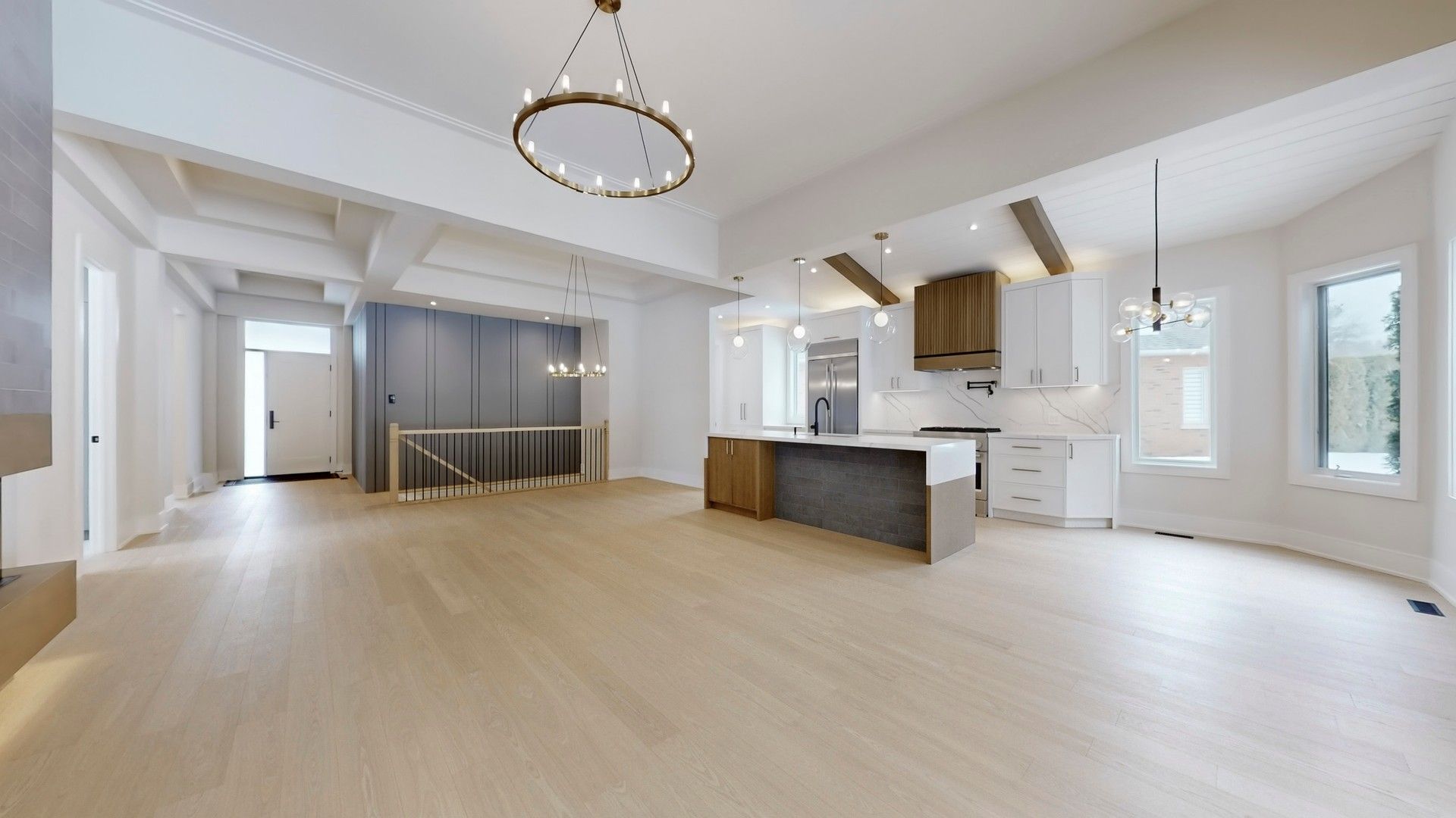 • Custom kitchen features quartz countertops, unique waterfall island, and oak accents.