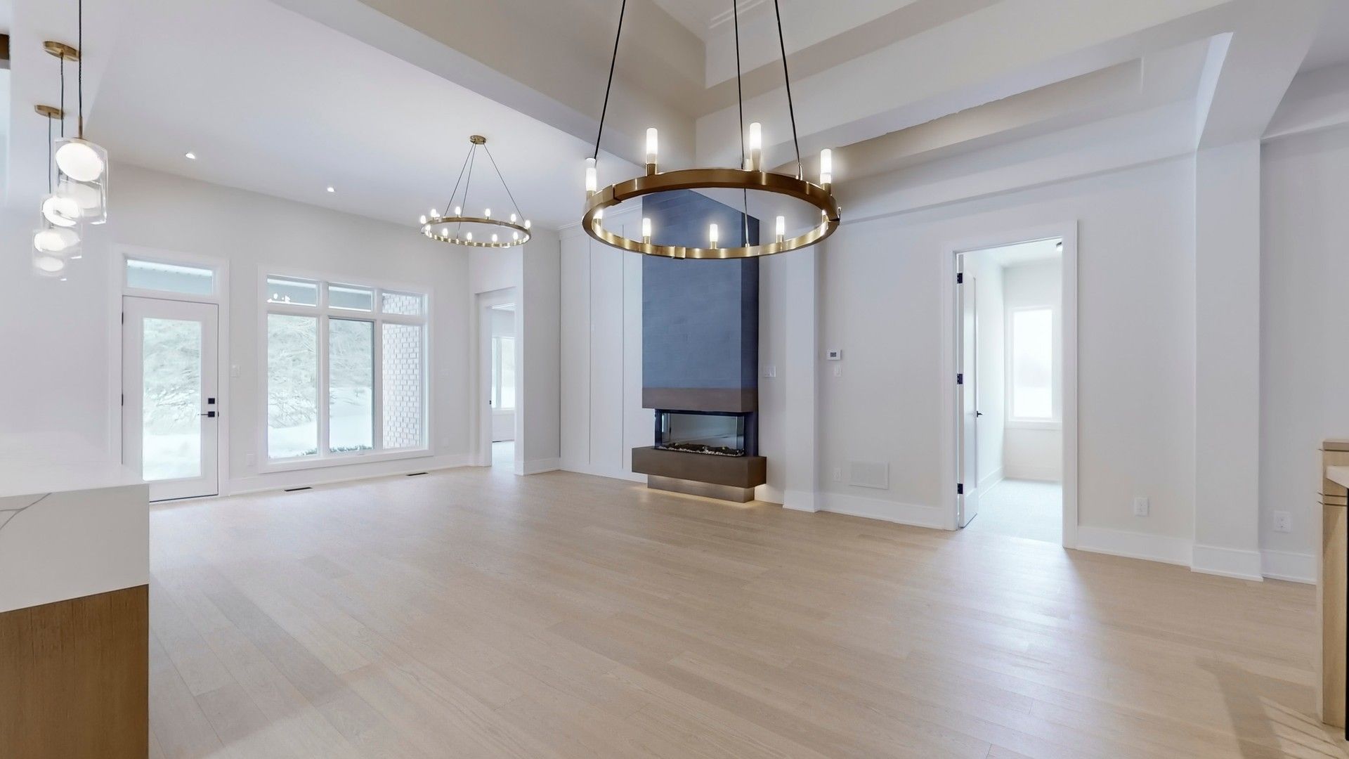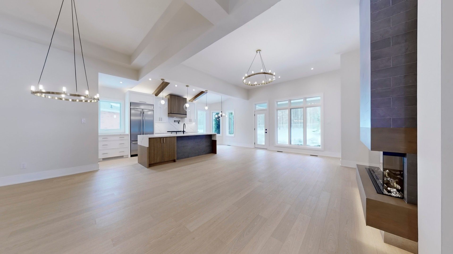 This fully renovated home offers a rare combination of craftsmanship and contemporary design. Beautiful castle pines model with modified layout is 1855 sq. Ft. Updates include new hardwood flooring throughout, custom kitchen that boasts soft white cabinetry with oak accents, built-in appliances, and a unique waterfall island with breakfast bar, quartz countertops and backsplash. Beamed ceilings and a cozy eating area make this kitchen spectacular. All this overlooks the beautiful living room/dining room with floor to 11' ceiling 3-sided dimplex fireplace, stylish feature walls, open oak and wrought iron staircase to the basement, designer light fixtures, and moulded ceilings. The primary bedroom has beamed ceilings and a beautiful feature wall. The redesigned ensuite & dressing area is a show stopper, complete with freestanding tub, huge custom shower with niche and recessed lighting, double sinks, and beautiful oak vanity. The dressing area is completely built in with interior lighting. A bright and spacious main floor laundry has loads of cupboards, laundry tub, quartz counters and pantry. The separate mudroom has built-in cabinetry with a bench and plenty of storage, and easy access to the garage. A fully finished basement adds extra living space with a large recreation room, 3 piece bath and bonus room for an office, crafts or playroom. New stylish exterior doors. All new interior doors that have been raised to 90". All new trim and baseboards, smooth ceilings, upgrades to electrical. Undermount lighting on all cabinetry. No detail has been left untouched. The backyard is one of the most private and largest in the community. The huge pie lot backs onto the forest, with a side view of the golf course, all on a quiet cul-de-sac with quick easy access to ninth line.