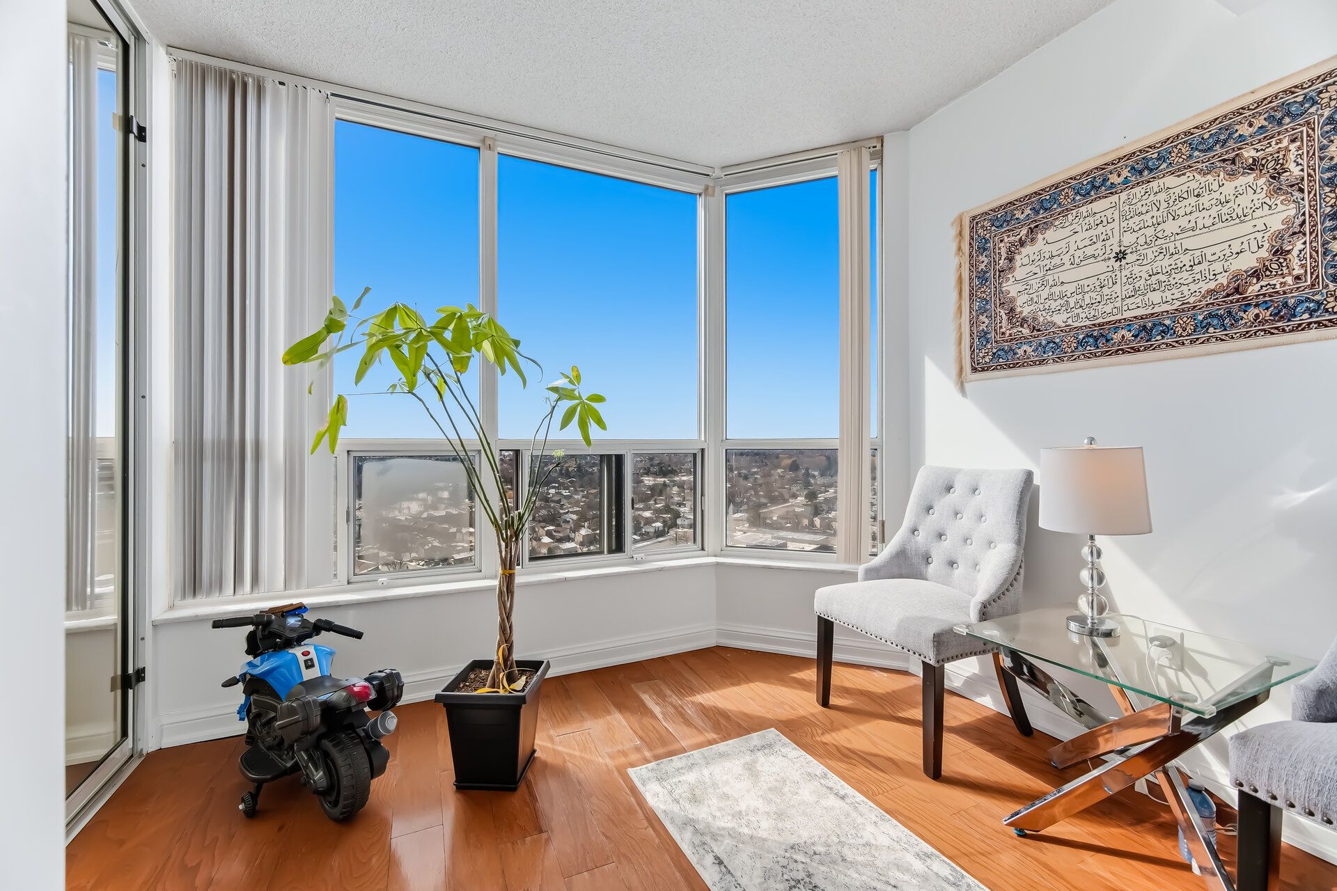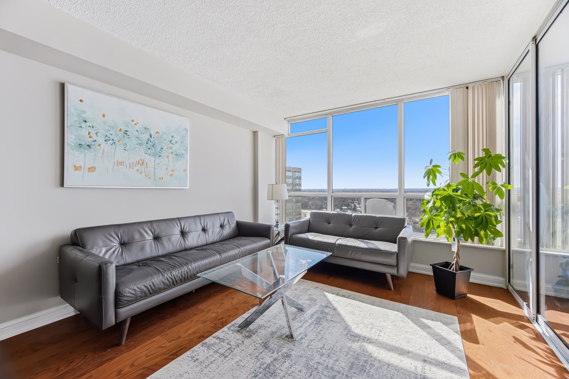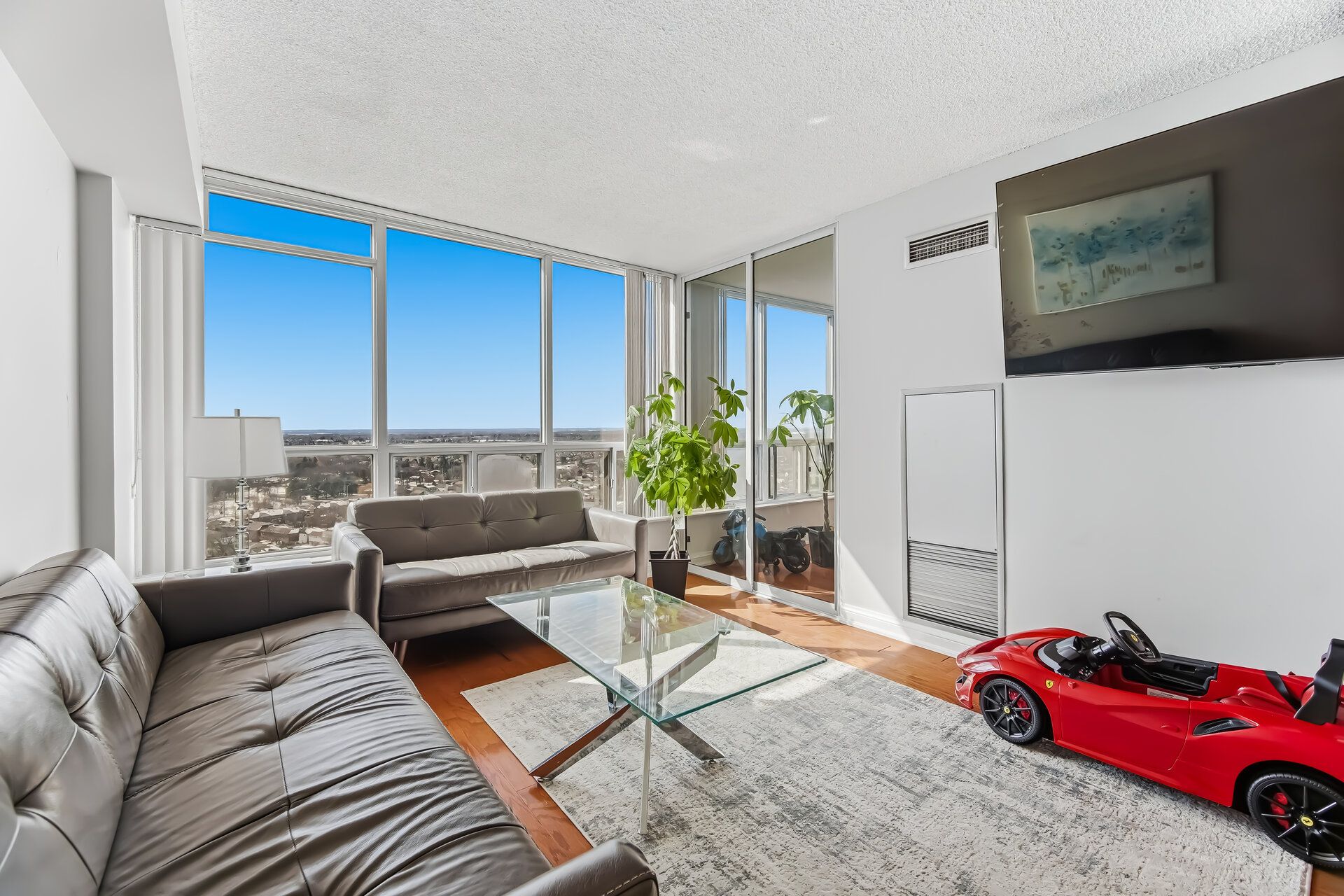 • Bright open-concept living area with large windows for natural light.