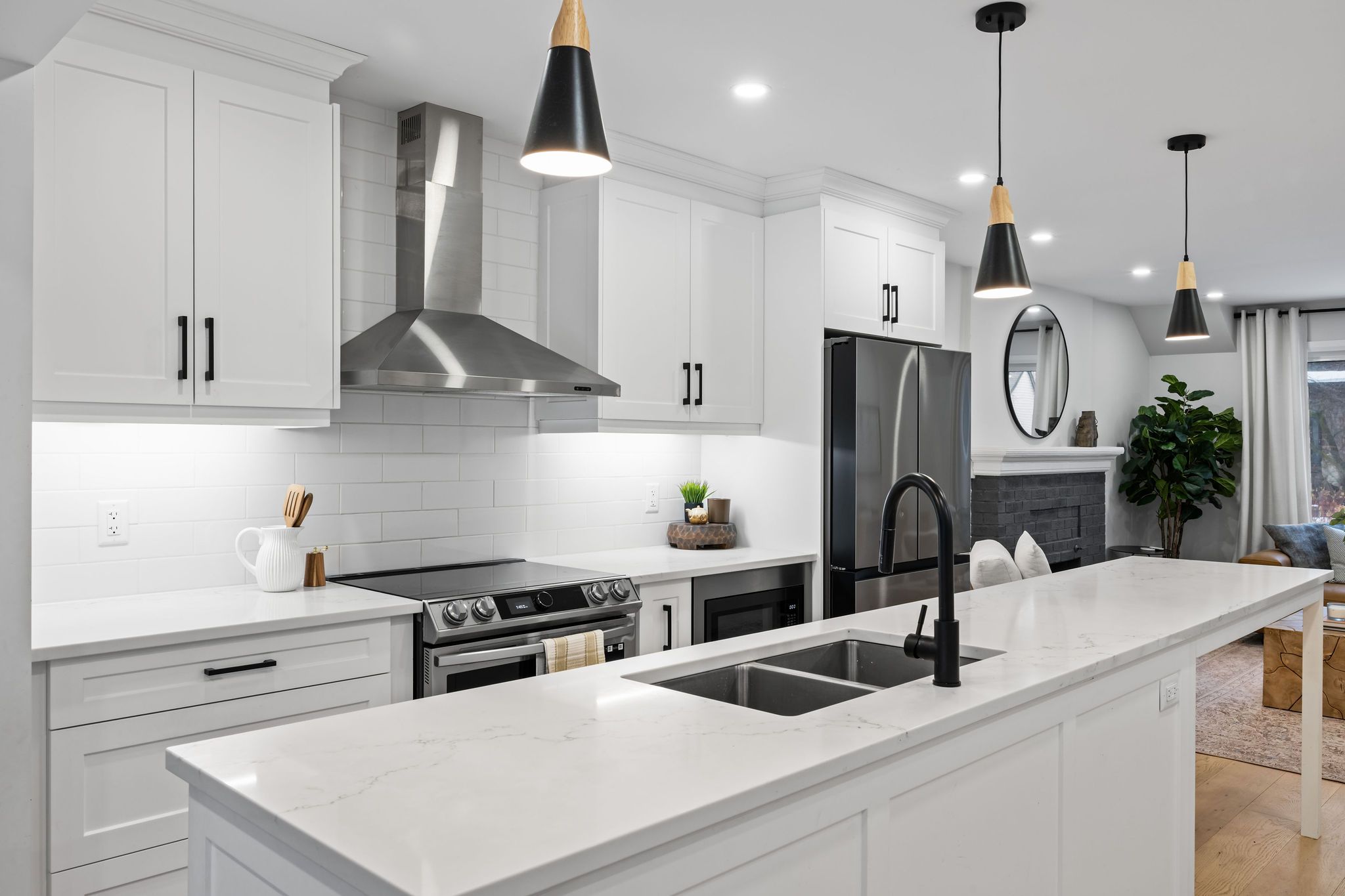 • Designer kitchen featuring a large island, quartz countertops, and high-end appliances.