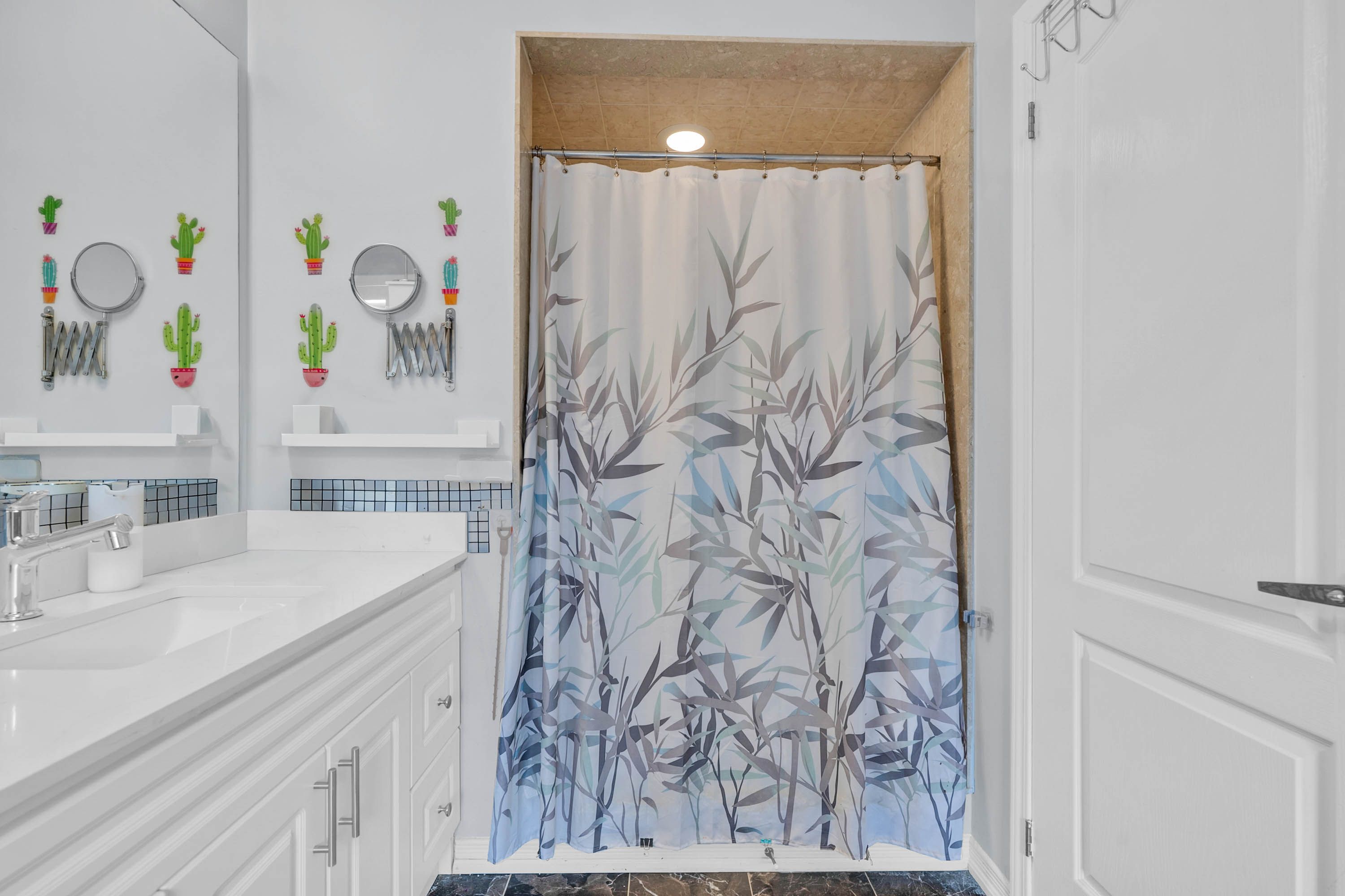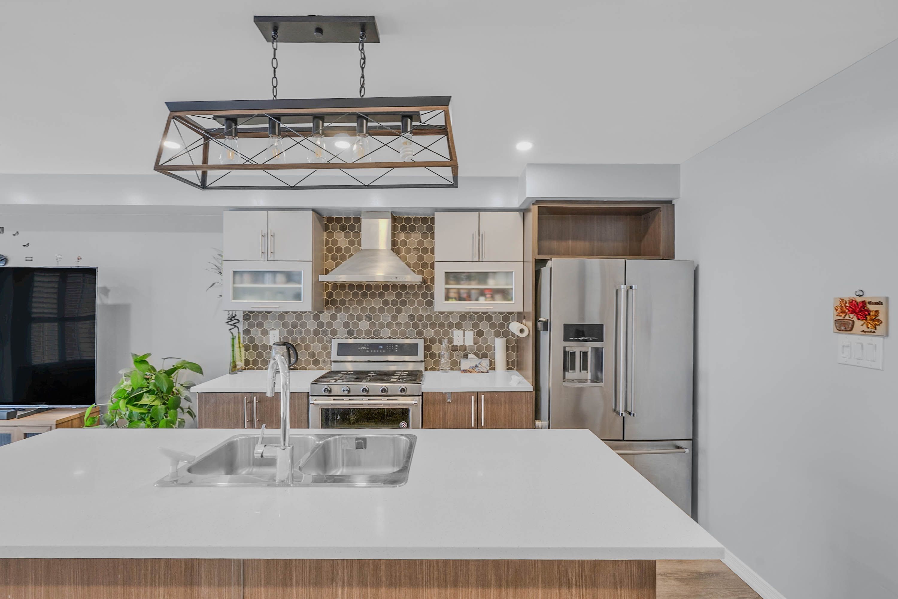 • Gourmet kitchen features quartz countertops and abundant cupboard space.