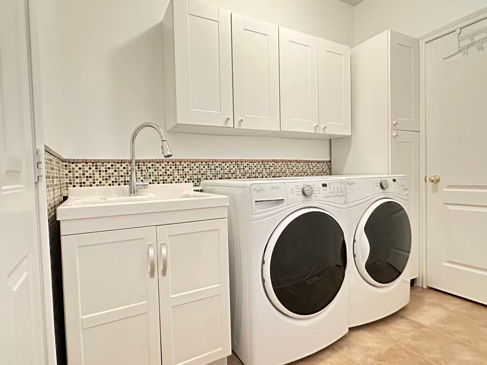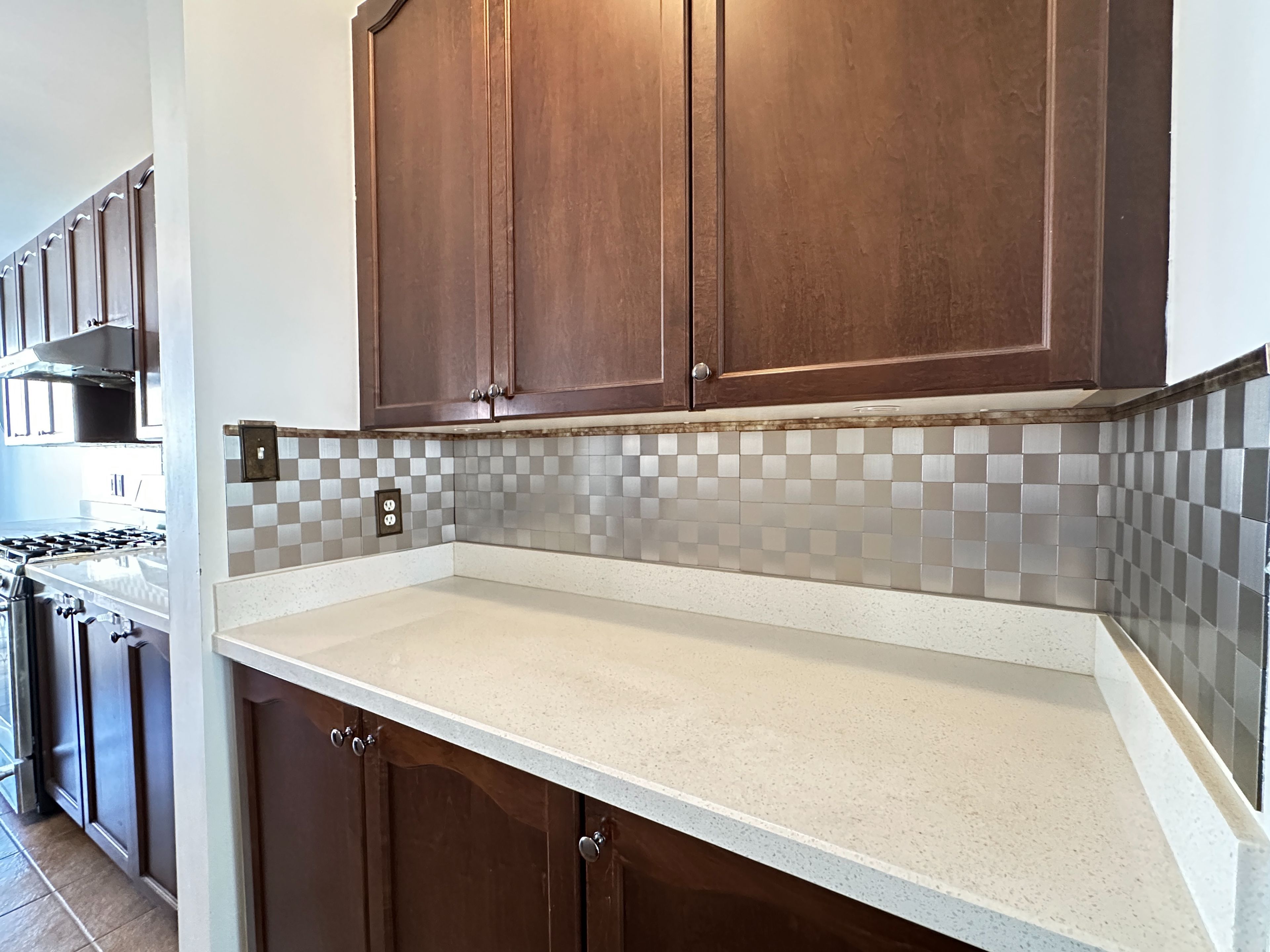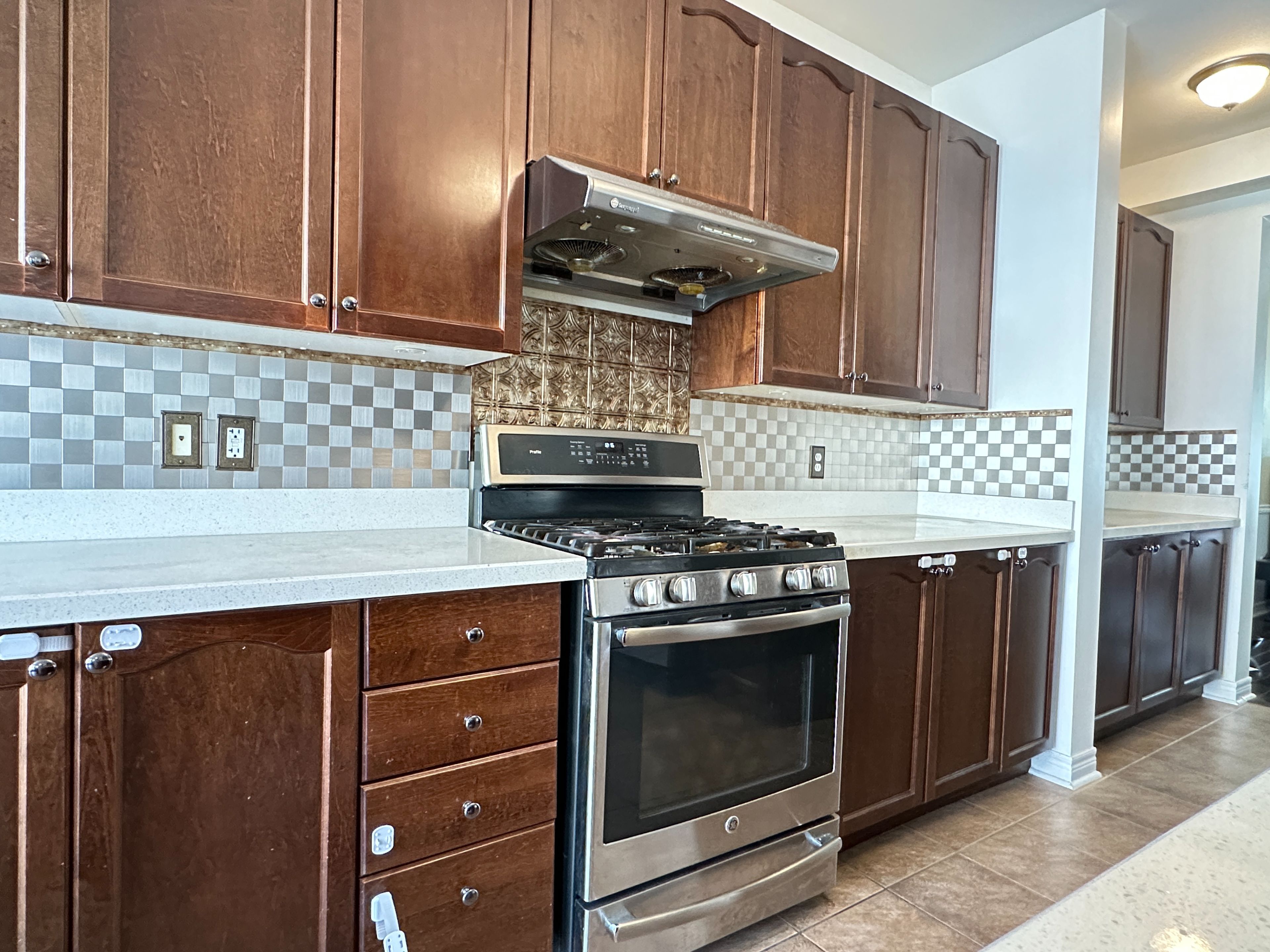 • Modern kitchen with upgraded cabinetry and quartz countertops.