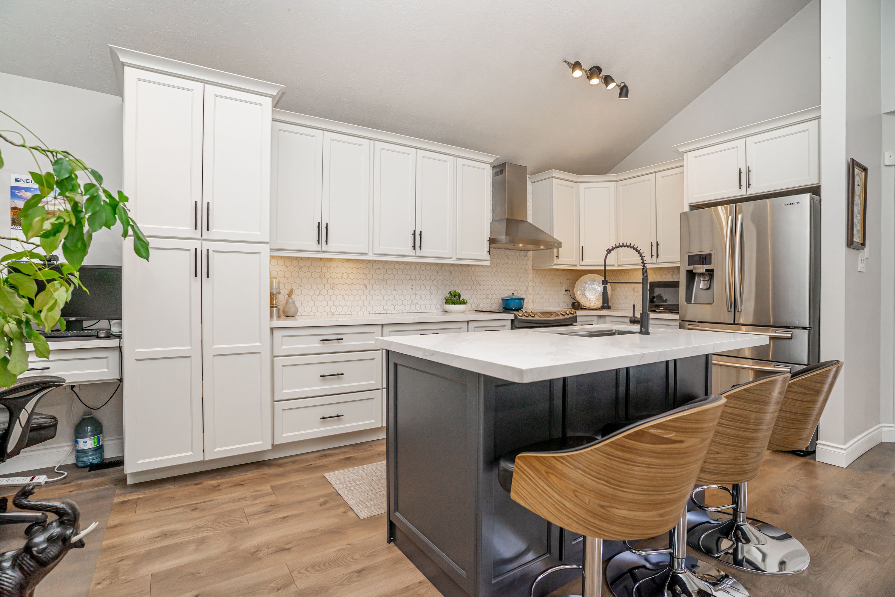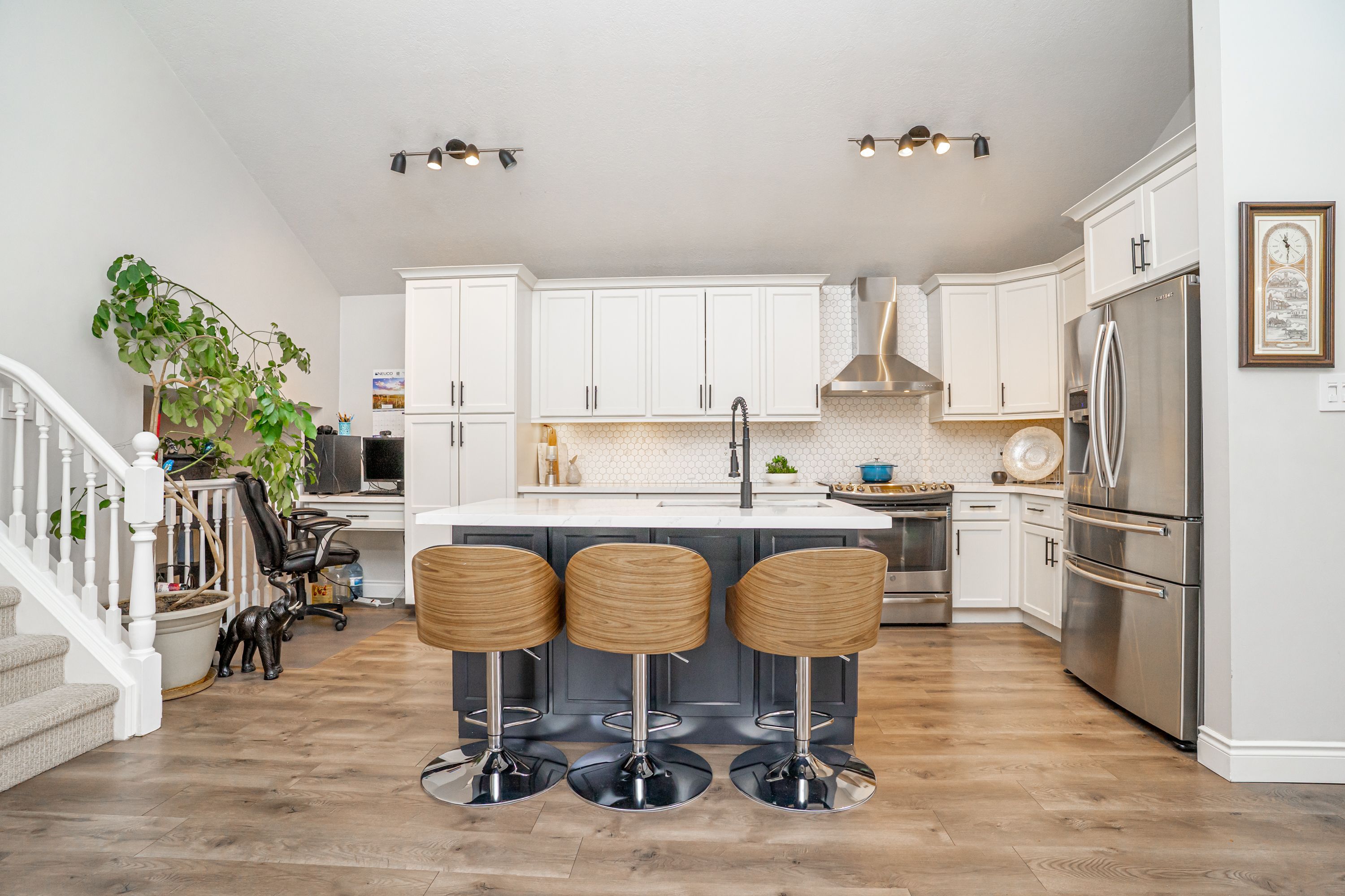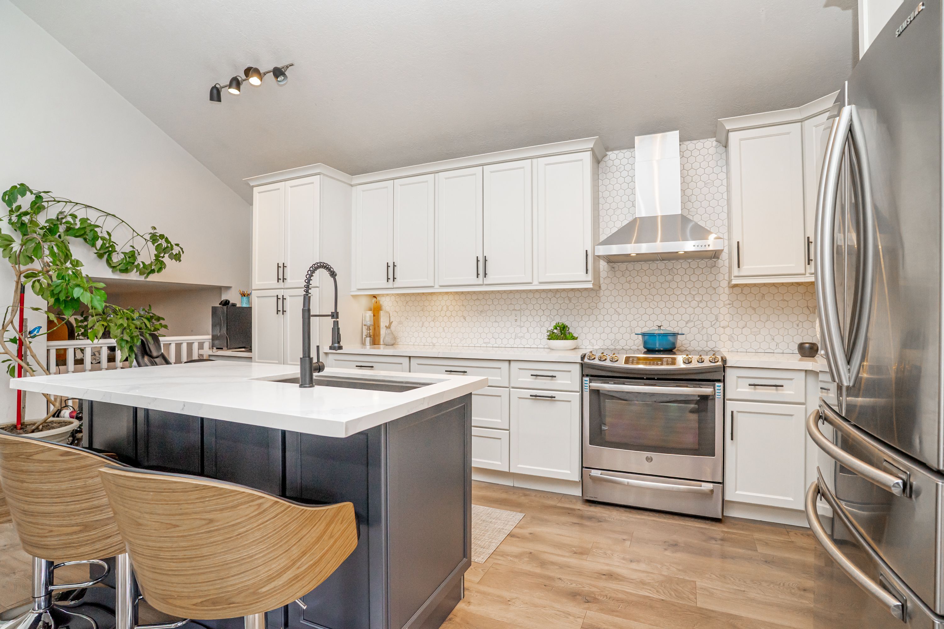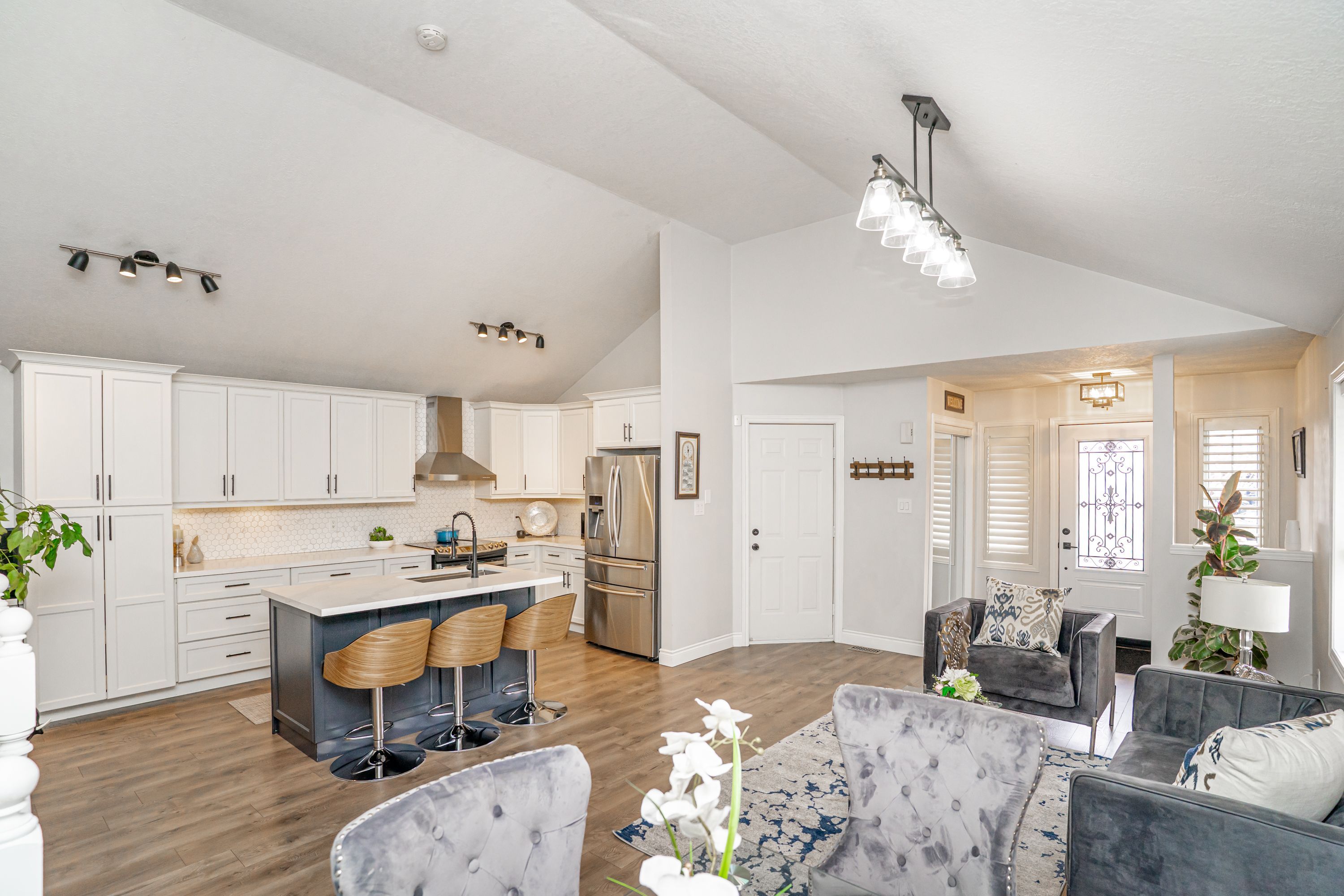 • Modern kitchen with breakfast bar and small desk area for convenience.