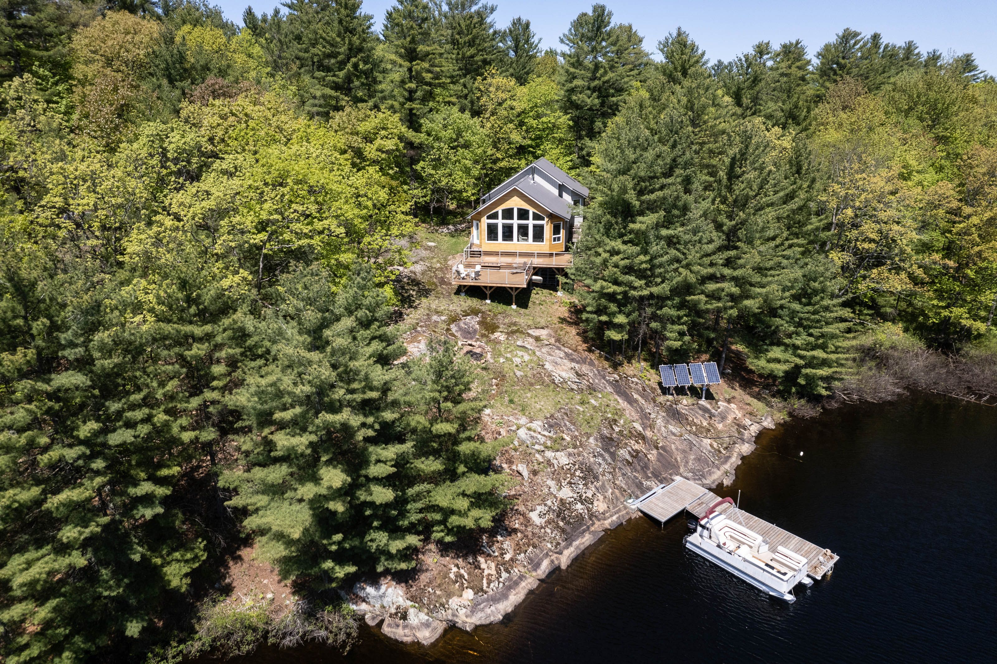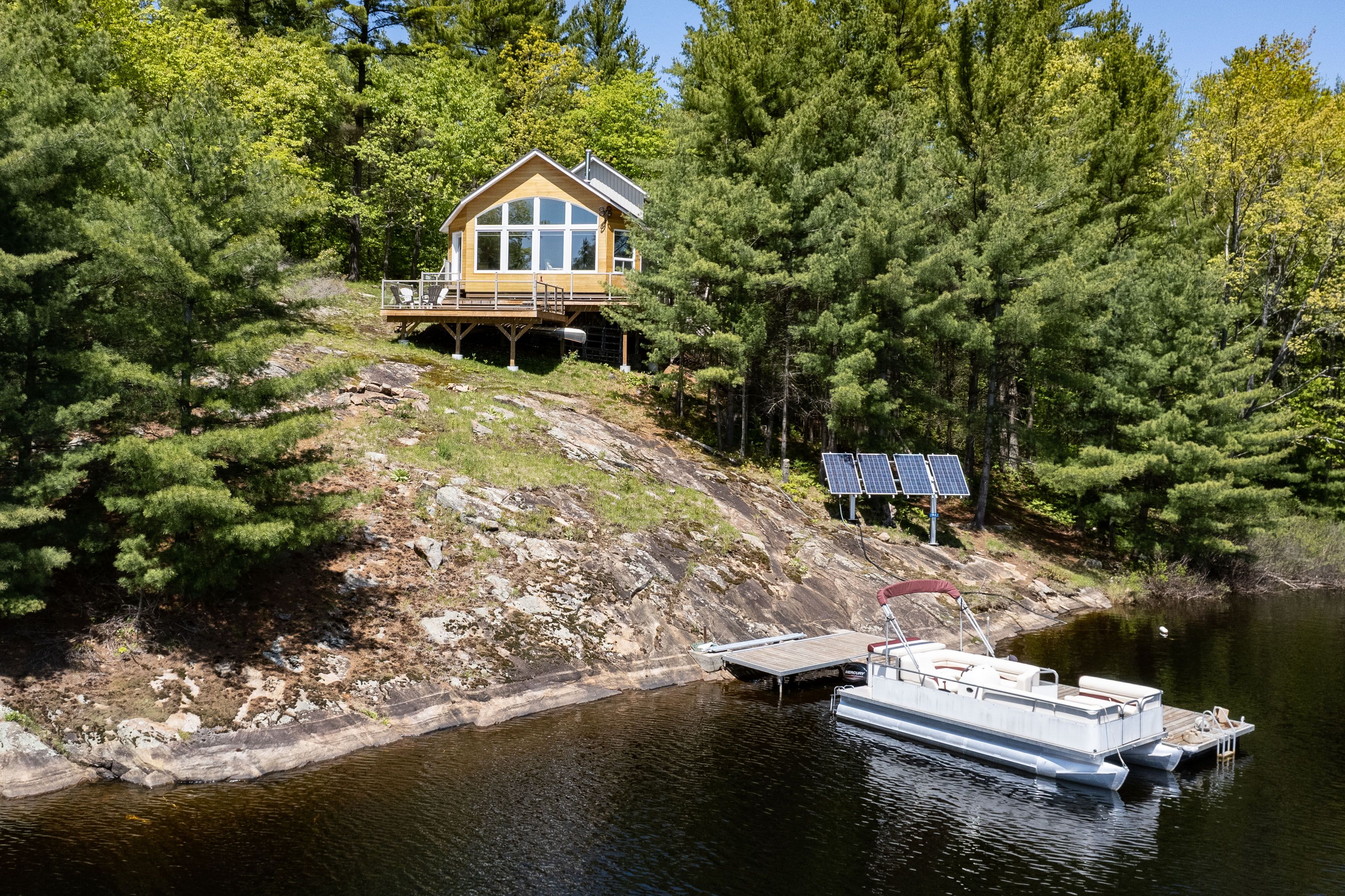 A wall of windows greets you as you arrive at this wonderful south facing granite perched charmer. The water access island cottage is located only a 5 min boat ride from your deeded mainland parking area but feels a world away when enjoying the peaceful privacy on the front deck. The lot consists of more than 1. 3 acres and over 220' of shoreline frontage. Featuring 3 bedrooms, a large primary living space with open plan kitchen, huge composite decks and a cozy woodstove. The cottage is completely off grid utilizing a fully upgraded and modern solar setup, composting toilet and grey water system, all backed up by an automatic duel fuel generator for peace of mind. This property is being offered mostly furnished and ready for immediate enjoyment. This is a solid, newer cottage with modern amenities and nothing to do but relax and enjoy. The seller is offering competitive private financing for qualified buyers and will even include a pontoon boat and some water toys. Call now to experience this value packed option on wonderful morrison lake.