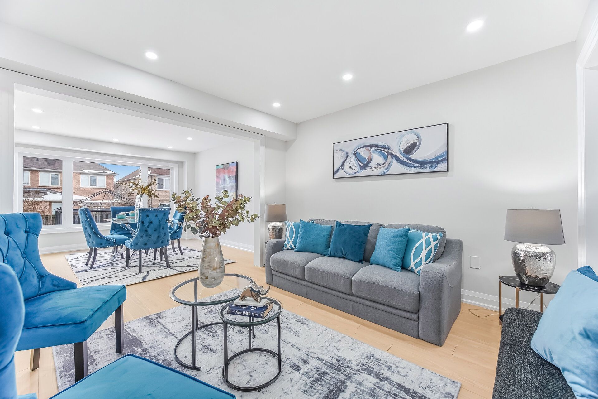 • Bright family room with vaulted ceilings and large windows.