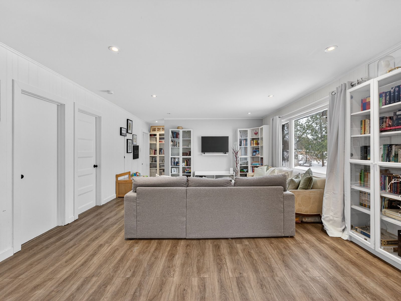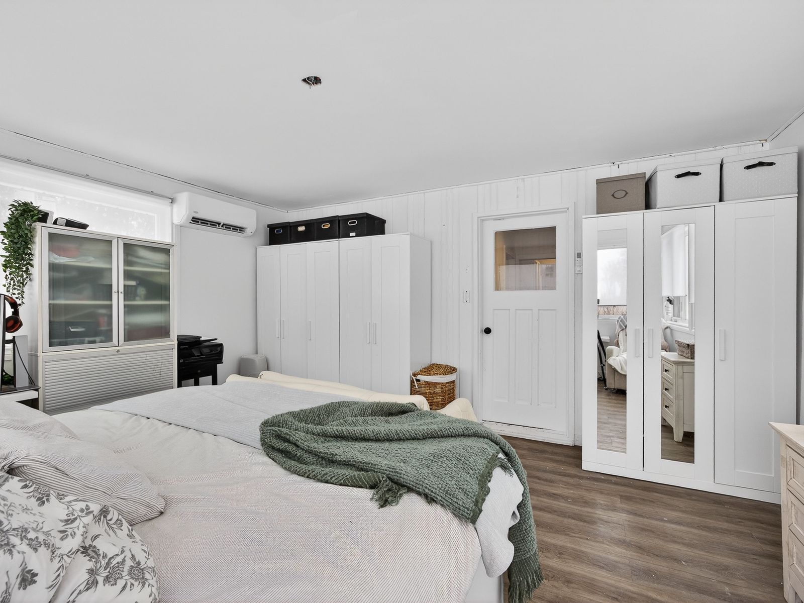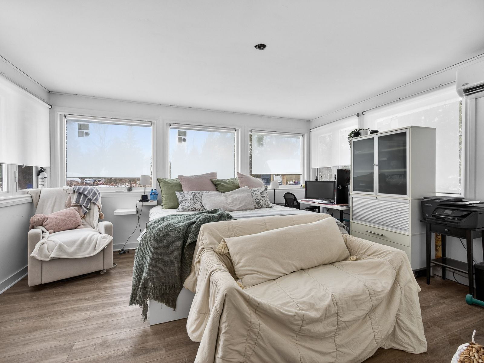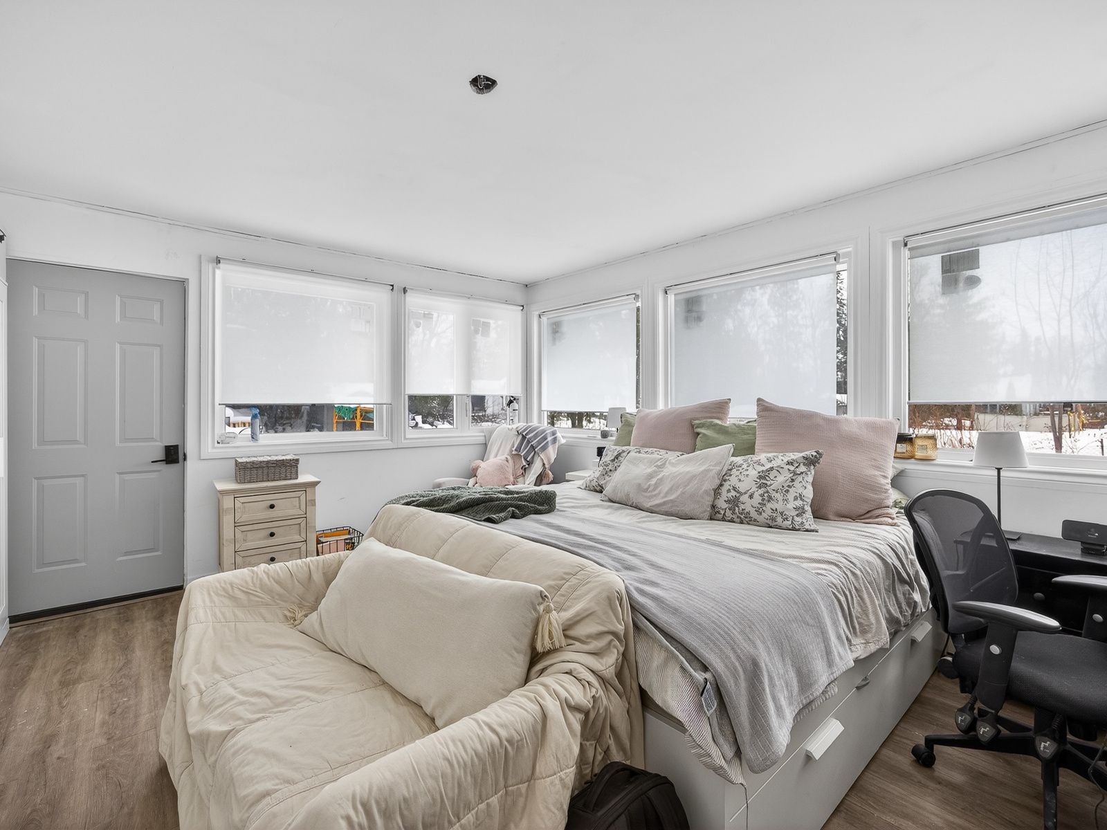 • Spacious primary bedroom with abundant natural light from windows.