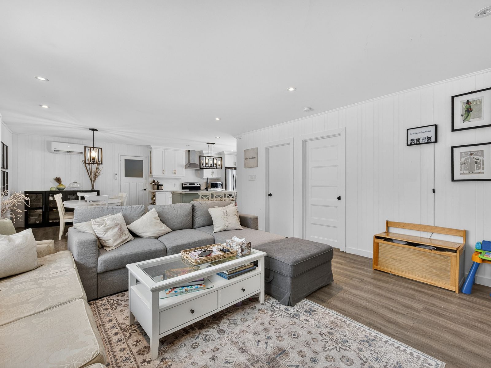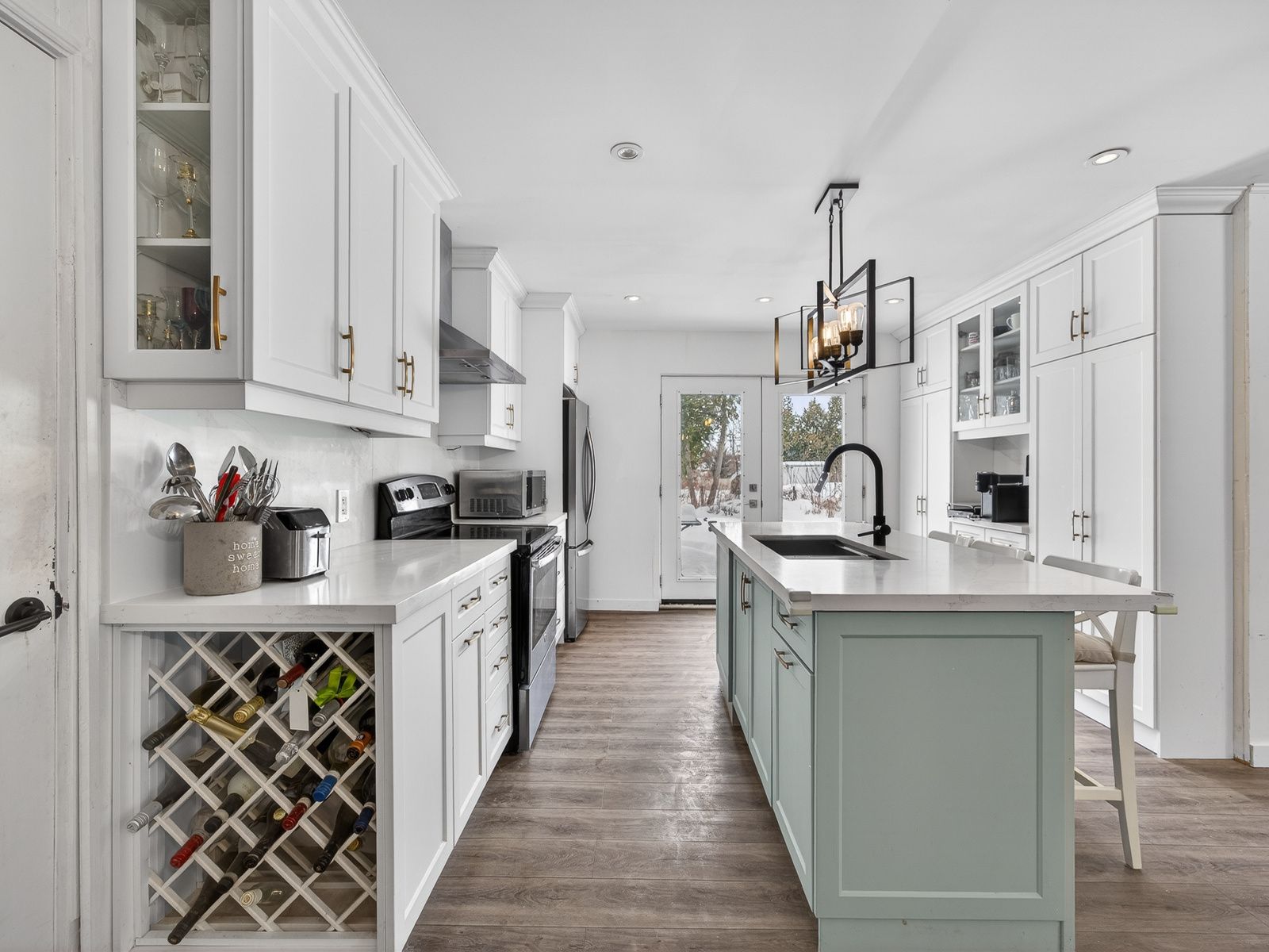 • Bright kitchen with quartz countertops and built-in appliances.