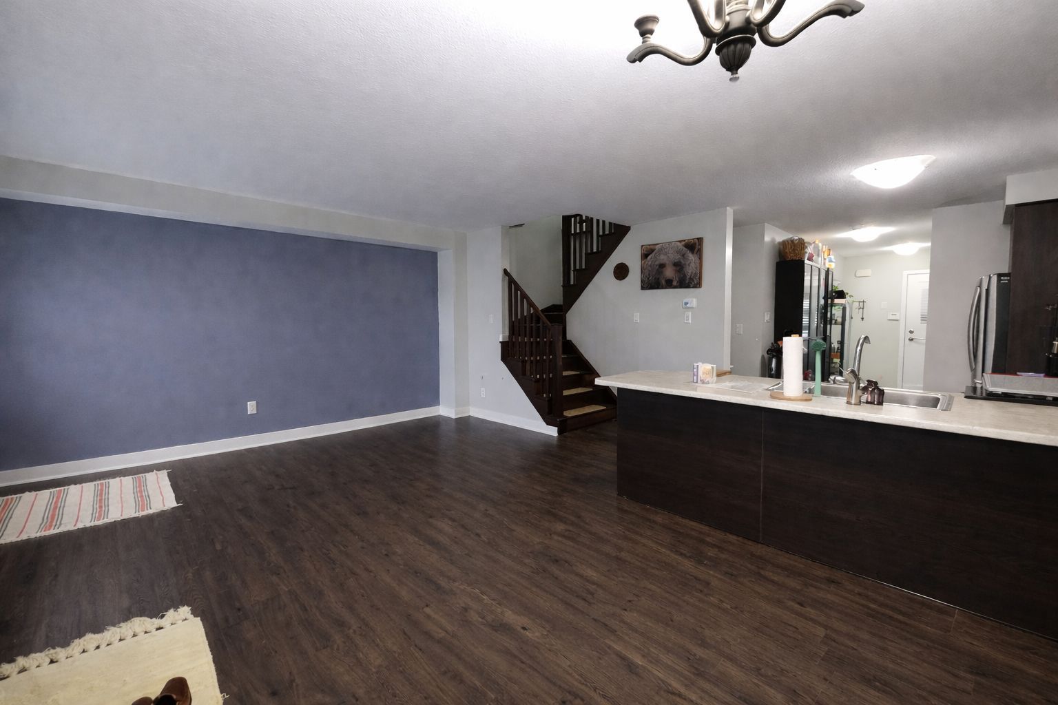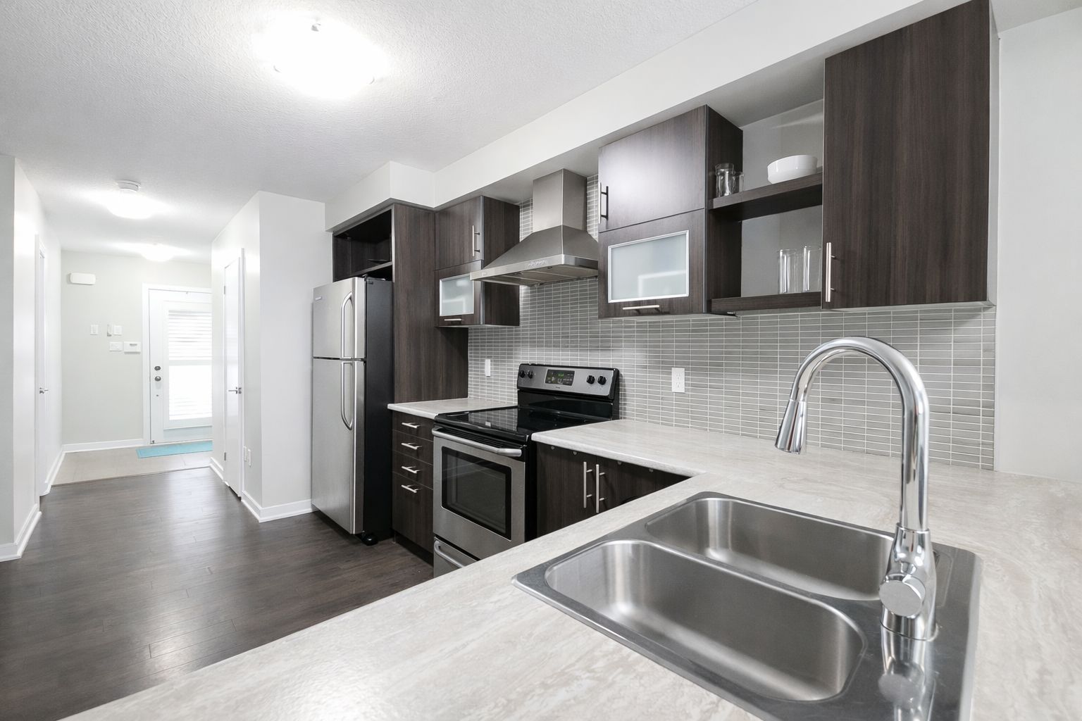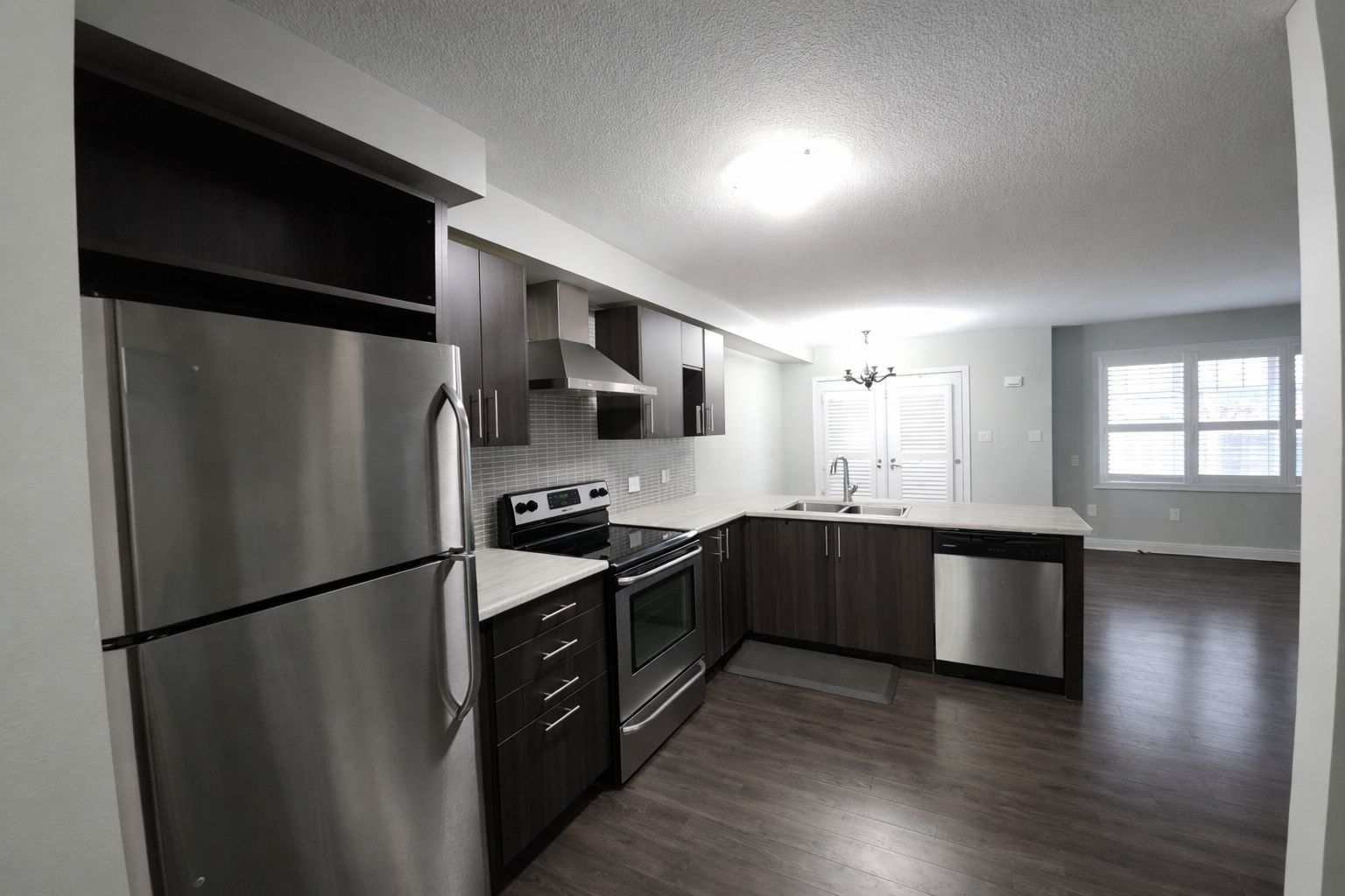• Stylish design with a kitchen island and stainless steel appliances.