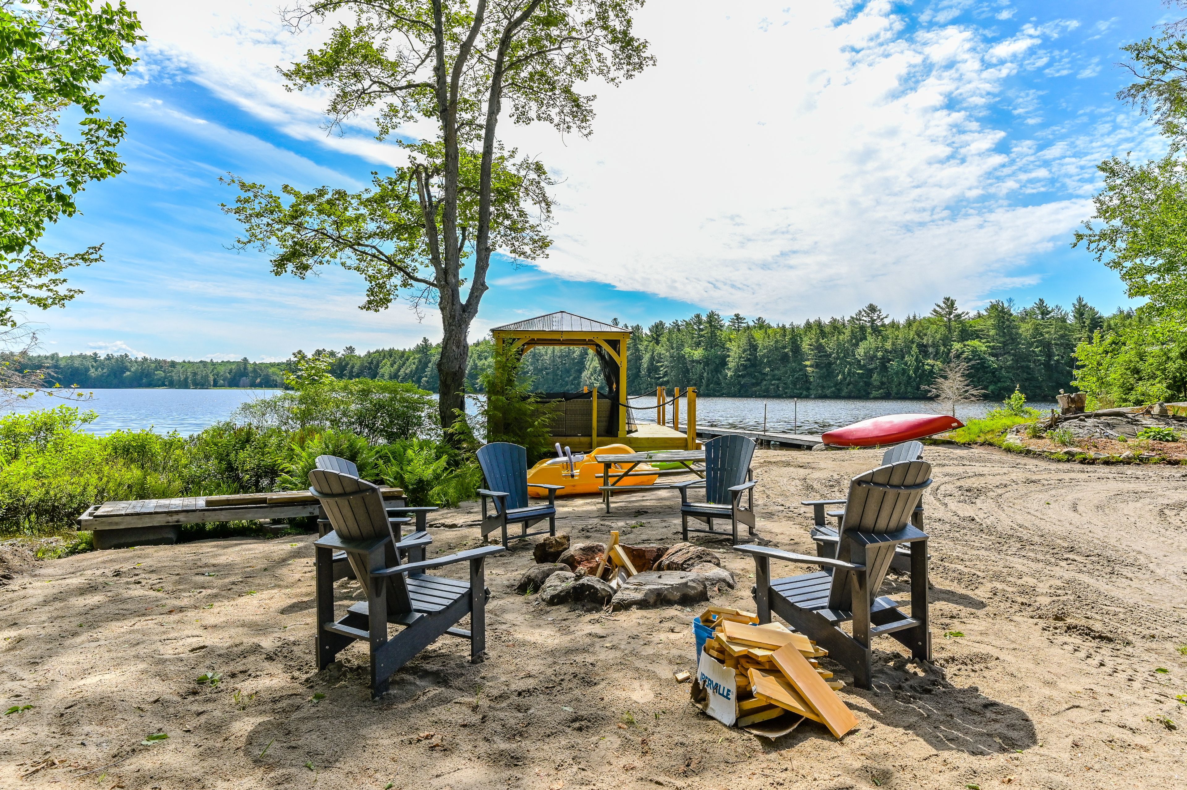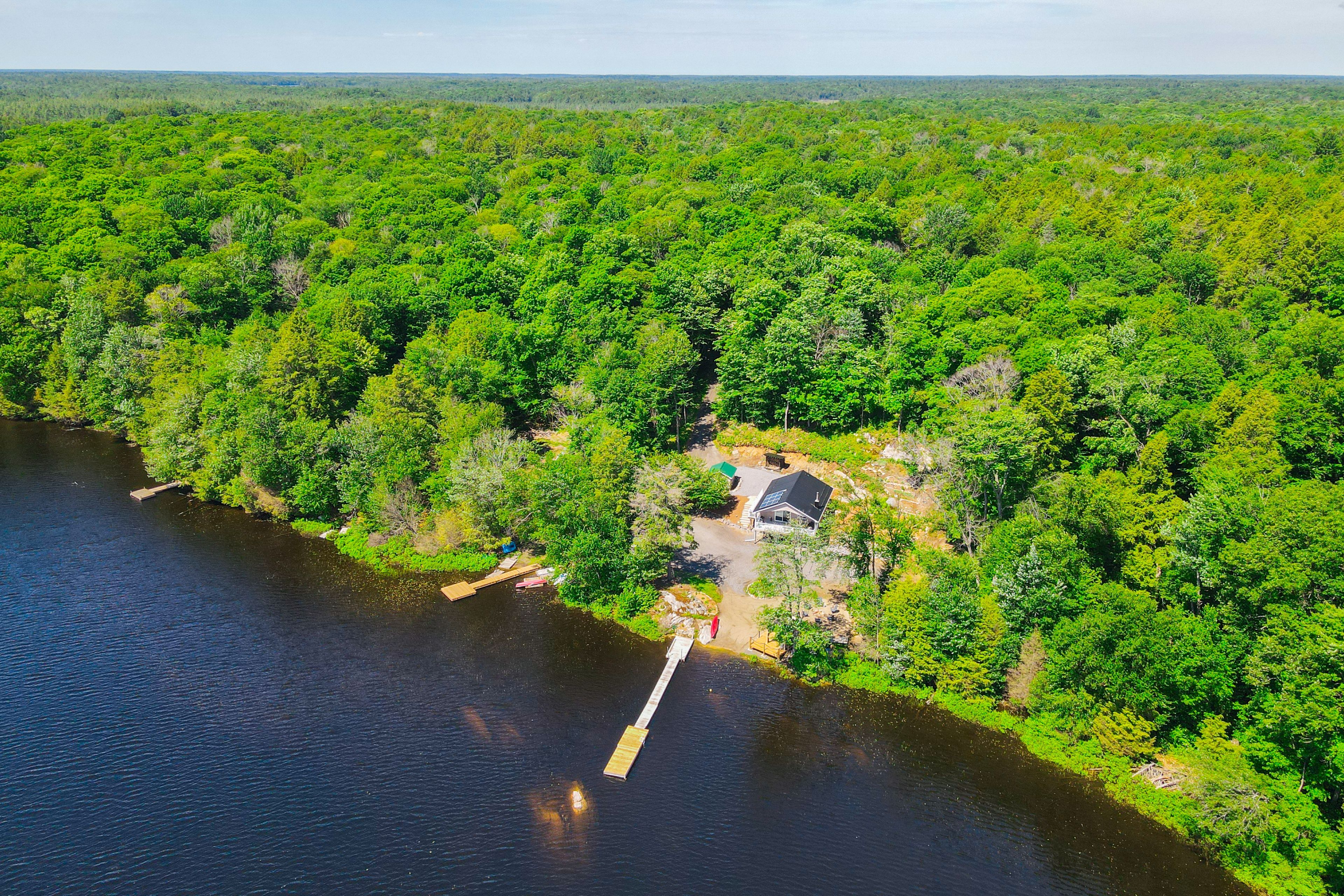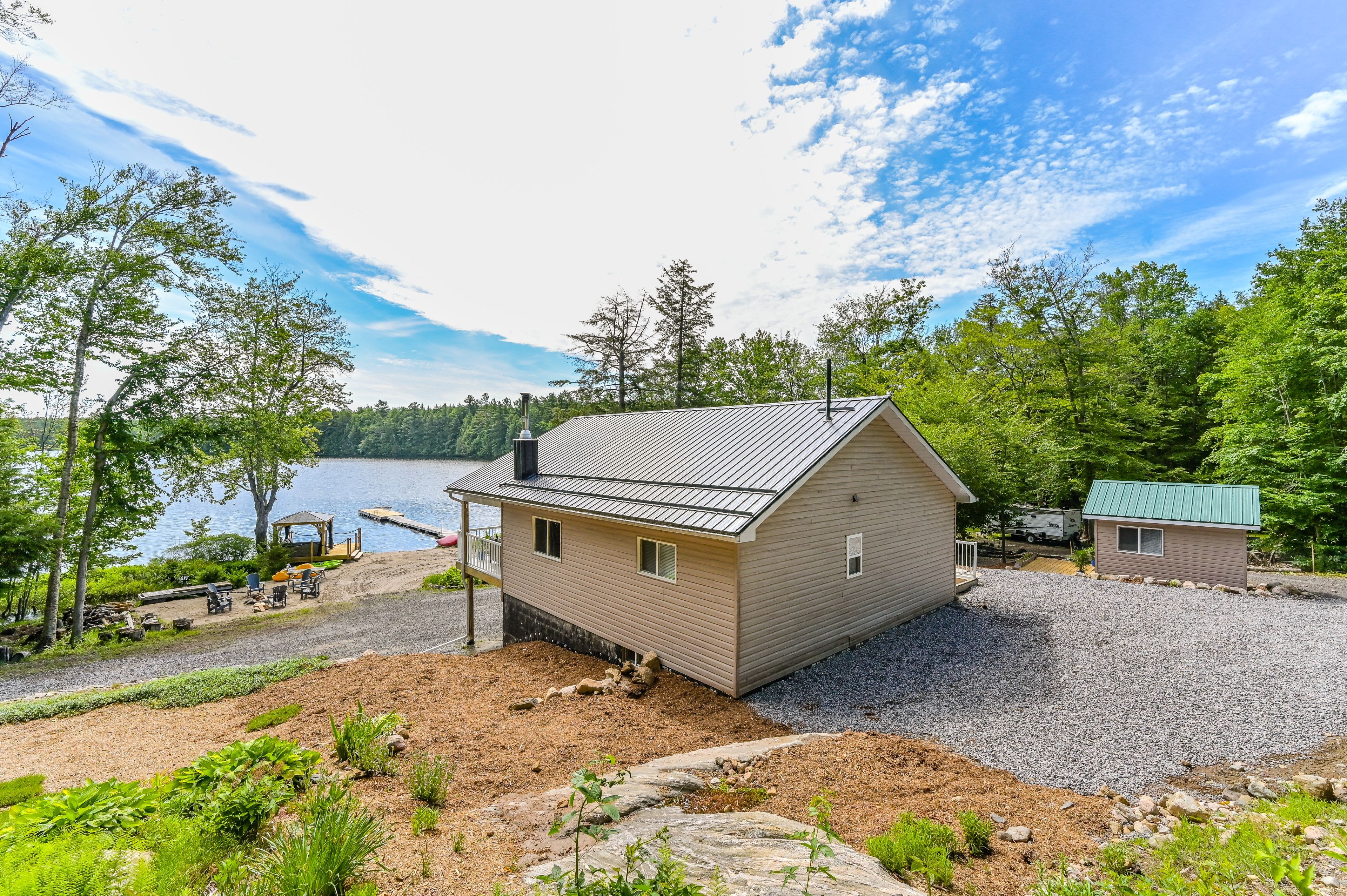 Welcome to bloor lake house (currently listed on airbnb and has a full summer of rentals, if the buyer wants to assume them ($3000 per week) a fully renovated lakefront retreat, offering the same natural beauty and lifestyle the muskoka area is known for with added privacy and tranquility. Set on 3. 3 acres, with private tree lined laneway with gated secure entrance and ample parking, this property was completely renovated four years ago and combines modern systems with classic cottage character. The main cottage features open-concept living with vaulted pine ceilings, updated wood finishes, wood stove, large covered front porch with full lake view, and a bright kitchen with quartz countertops, white cabinetry, gas range, and excellent counter space for cooking and serving. Sleeping accommodations include space for up to 11 people between the cottage and a separate heated bunkie, making it ideal for families and guests. The property is situated on a private lake shared by only four cottages, with no public access, and the views are open and expansive. Outside you'll find expansive perennial gardens, lakeside firepit, enclosed wood storage, and lockable atv or gardening storage. The waterfront includes a lakeside screened in gazebo with seating, private dock and swim platform, and a gradual entry sandy beach which allows for motor boat launch and opportunities for swimming, canoeing, kayaking, and excellent fishing for small and largemouth bass, sunfish, and crappie. A nearby waterfall offers portage access into the lower crane lake, adding to the recreational appeal. Recent upgrades include a wrapped foundation, solar power with lithium batteries, and a whole-home propane generator, ensuring efficient and reliable service in all seasons. With 3. 3 acres of land, updated interiors, exceptional waterfront, and no short-term rental restrictions in the area, this lake house is well-suited as a year-round residence, seasonal getaway, or rental investment.