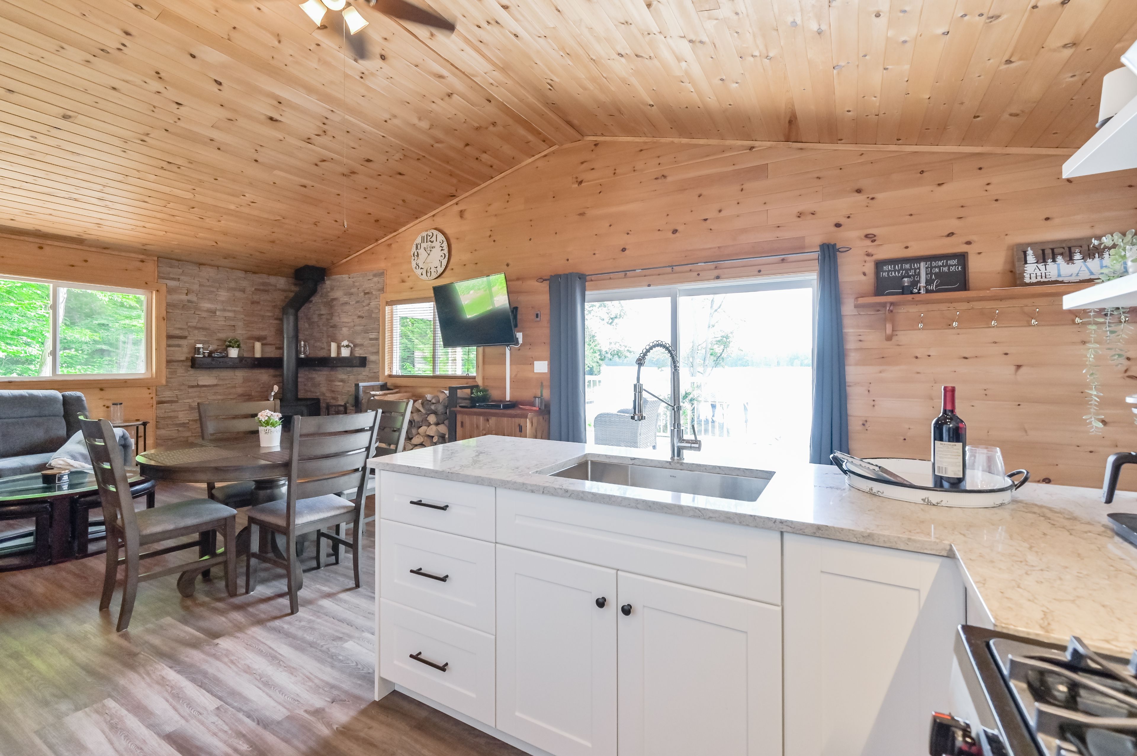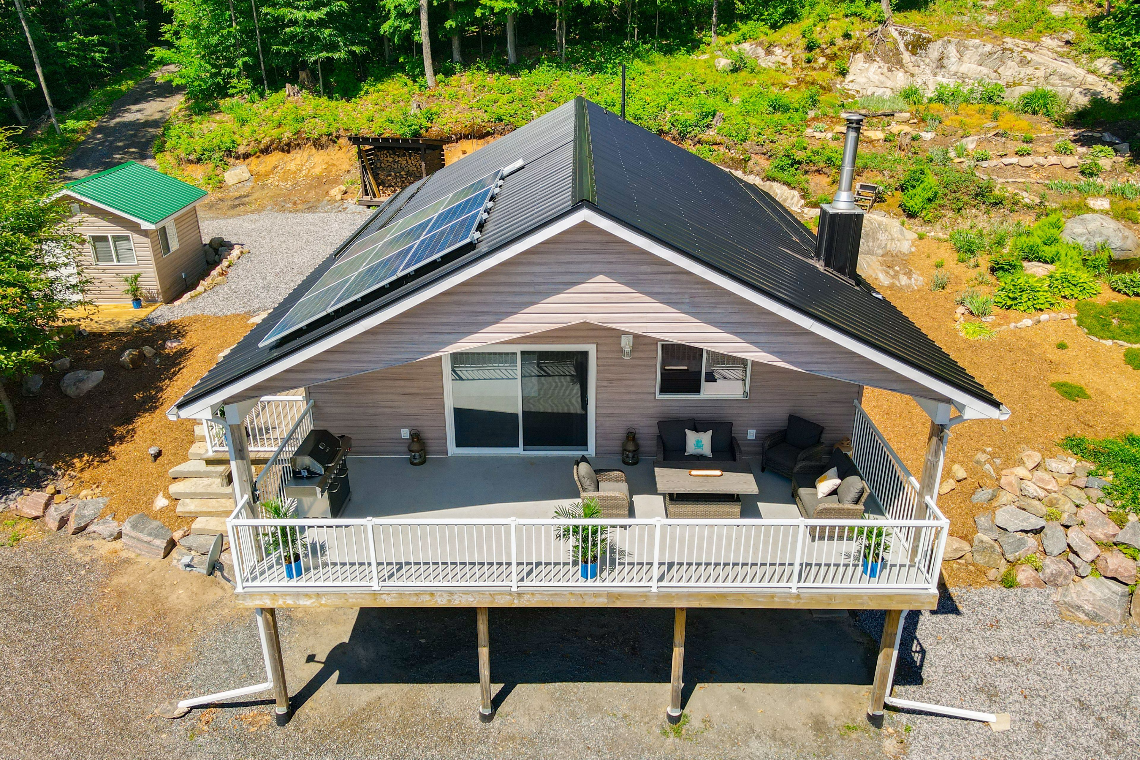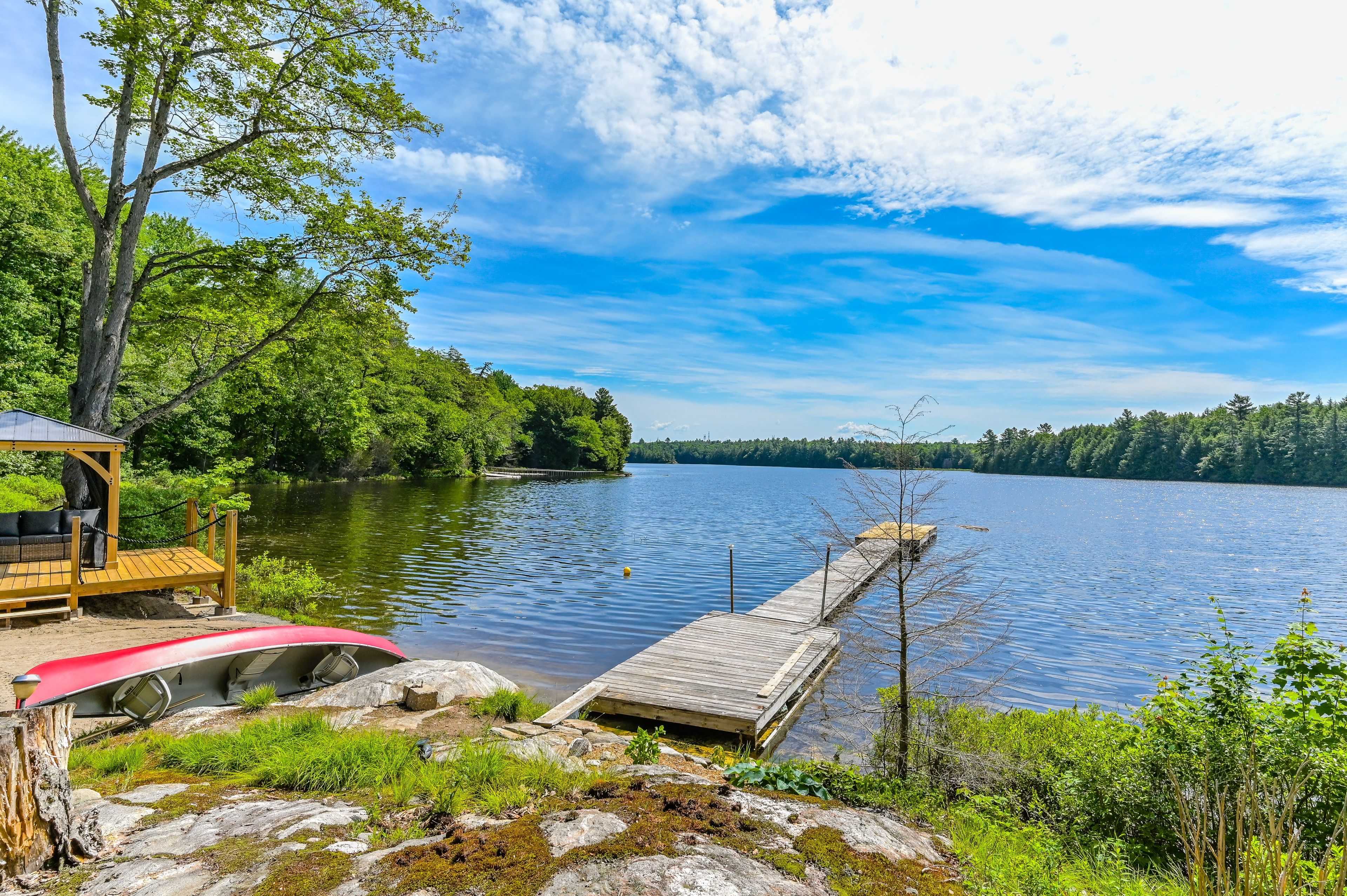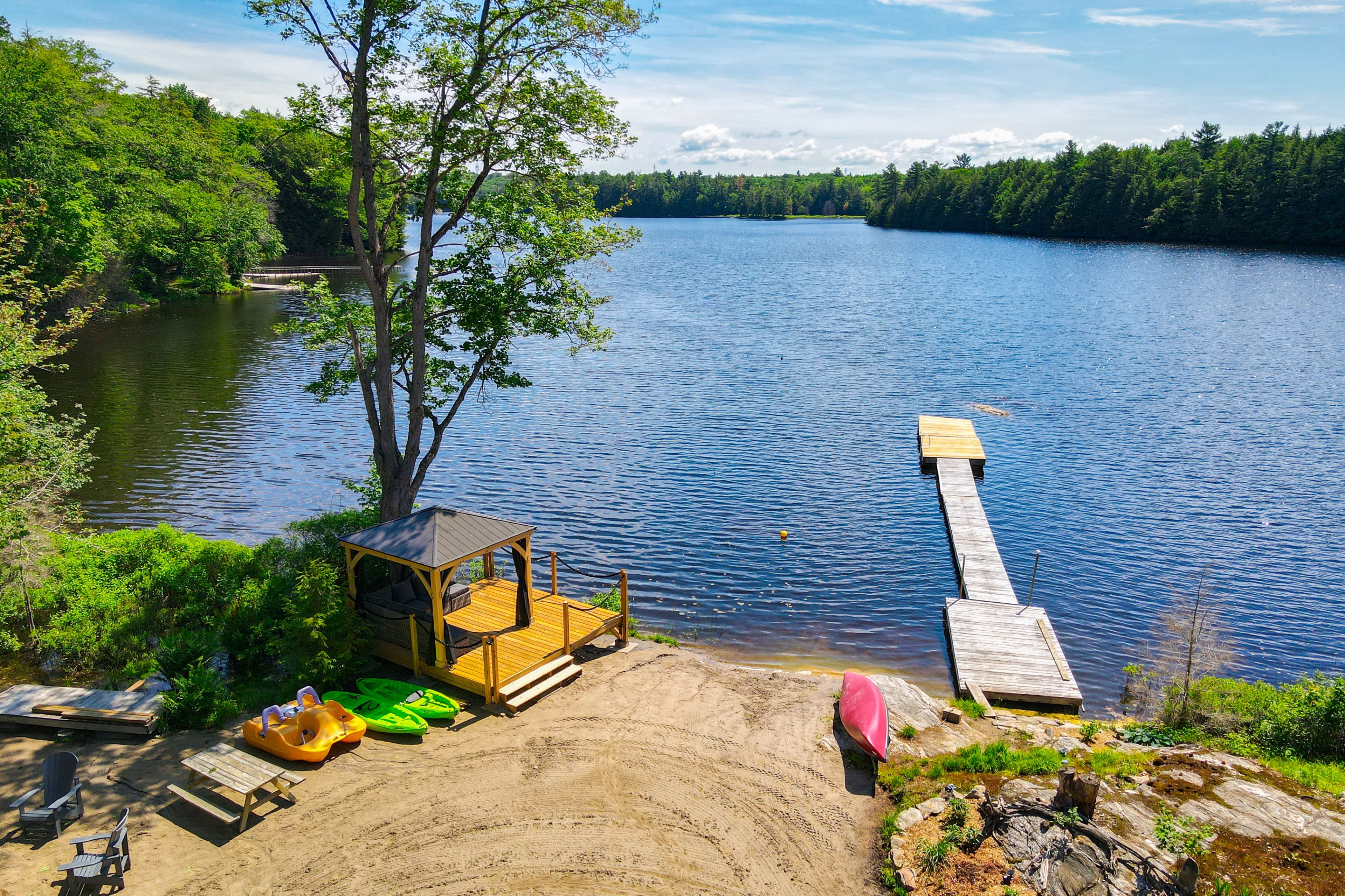 Welcome to bloor lake house (currently listed on airbnb and has a full summer of rentals, if the buyer wants to assume them ($3000 per week) a fully renovated lakefront retreat, offering the same natural beauty and lifestyle the muskoka area is known for with added privacy and tranquility. Set on 3. 3 acres, with private tree lined laneway with gated secure entrance and ample parking, this property was completely renovated four years ago and combines modern systems with classic cottage character. The main cottage features open-concept living with vaulted pine ceilings, updated wood finishes, wood stove, large covered front porch with full lake view, and a bright kitchen with quartz countertops, white cabinetry, gas range, and excellent counter space for cooking and serving. Sleeping accommodations include space for up to 11 people between the cottage and a separate heated bunkie, making it ideal for families and guests. The property is situated on a private lake shared by only four cottages, with no public access, and the views are open and expansive. Outside you'll find expansive perennial gardens, lakeside firepit, enclosed wood storage, and lockable atv or gardening storage. The waterfront includes a lakeside screened in gazebo with seating, private dock and swim platform, and a gradual entry sandy beach which allows for motor boat launch and opportunities for swimming, canoeing, kayaking, and excellent fishing for small and largemouth bass, sunfish, and crappie. A nearby waterfall offers portage access into the lower crane lake, adding to the recreational appeal. Recent upgrades include a wrapped foundation, solar power with lithium batteries, and a whole-home propane generator, ensuring efficient and reliable service in all seasons. With 3. 3 acres of land, updated interiors, exceptional waterfront, and no short-term rental restrictions in the area, this lake house is well-suited as a year-round residence, seasonal getaway, or rental investment.