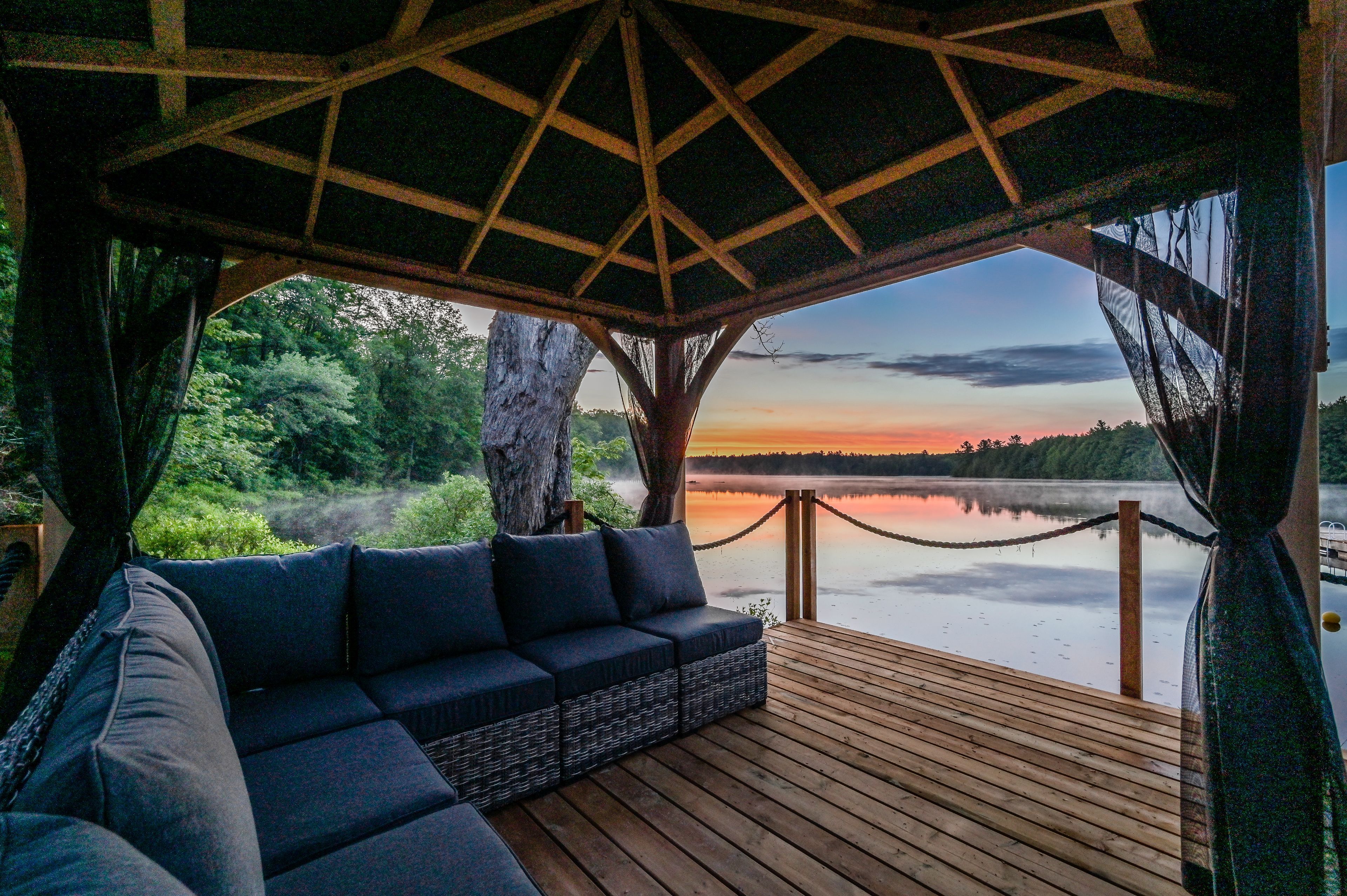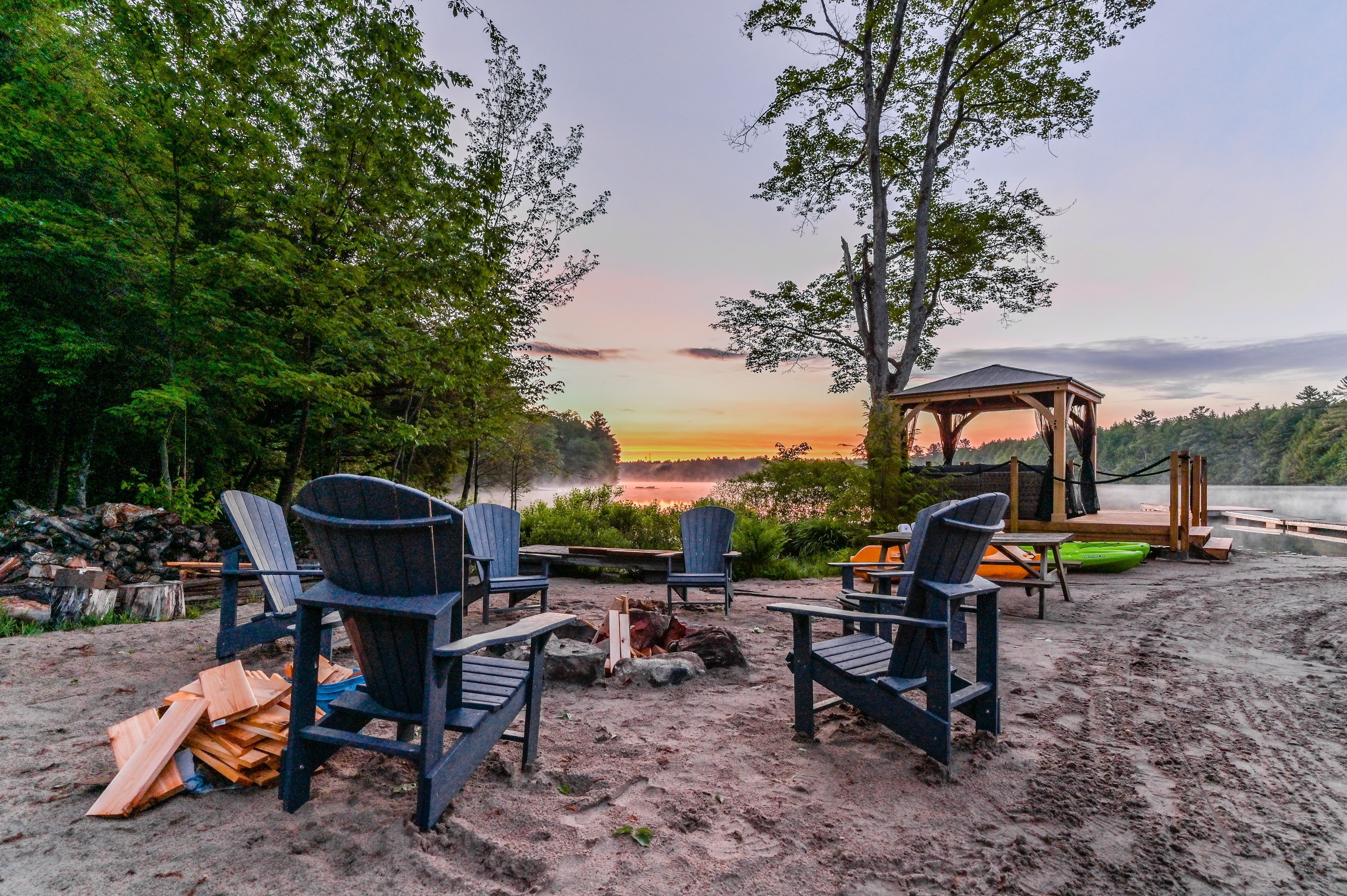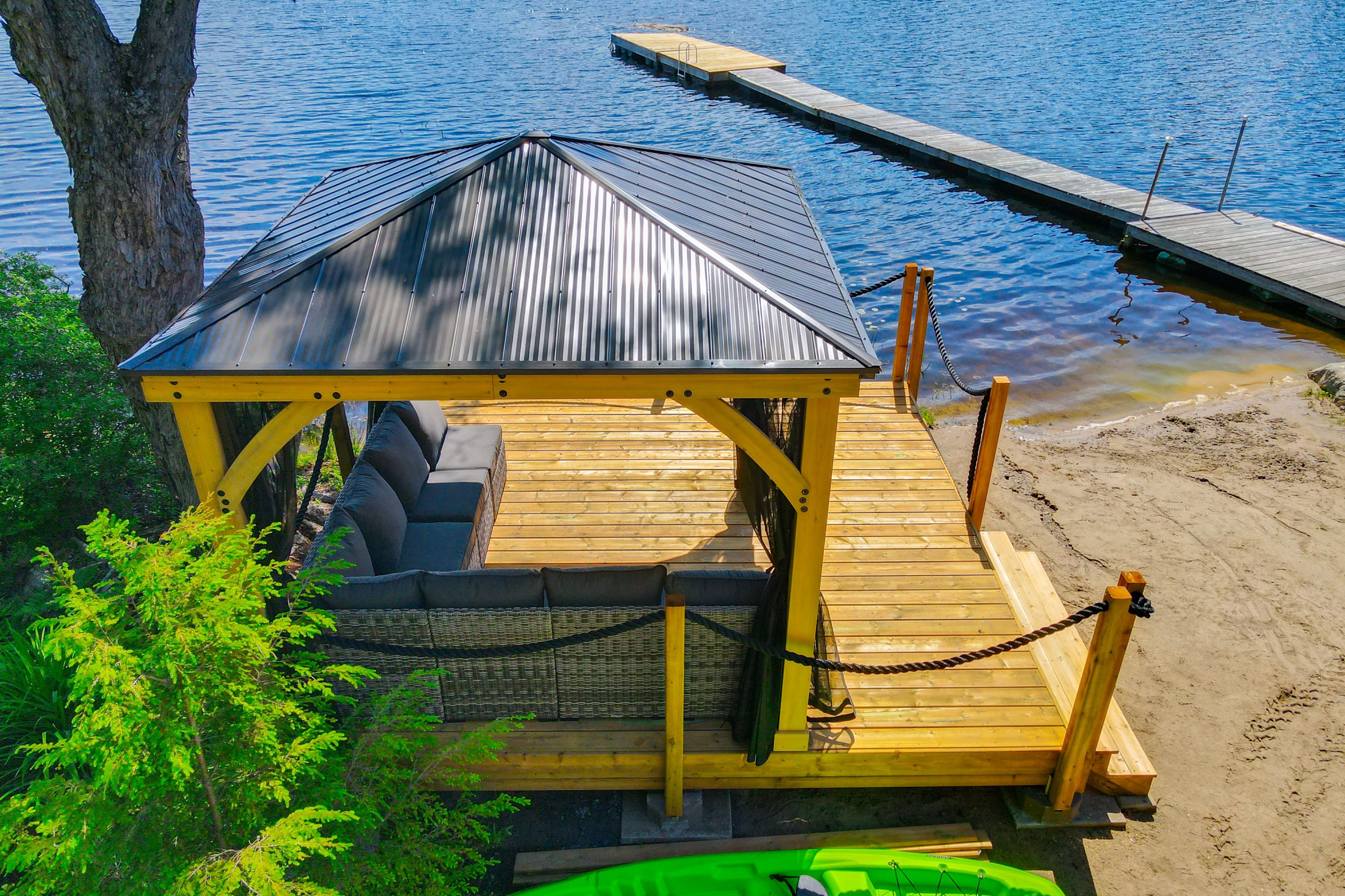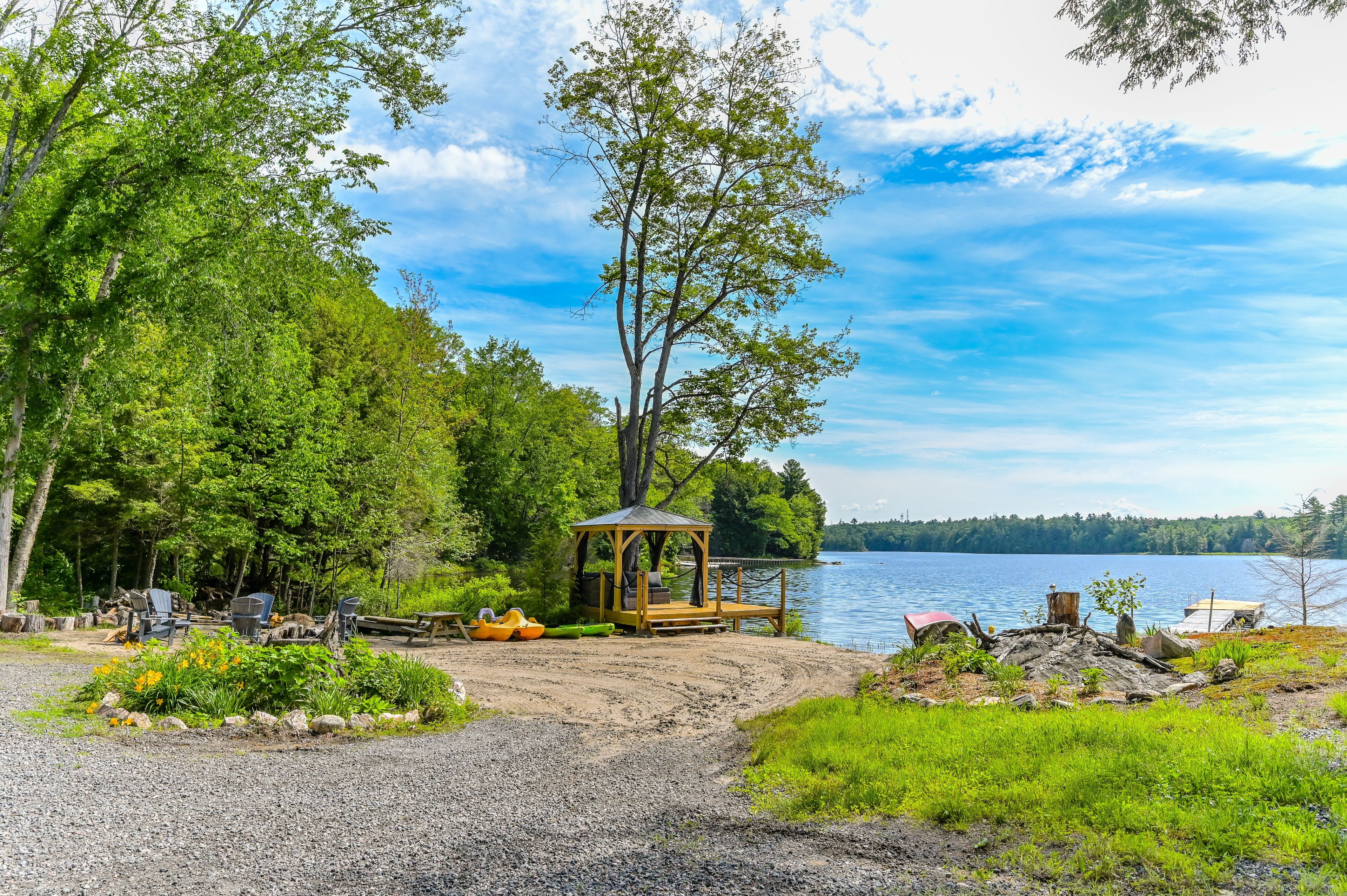 • Multiple outdoor amenities including a dock, gazebo, and sandy beach access.