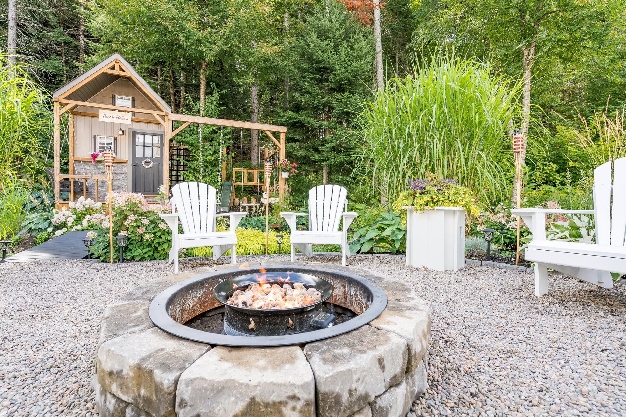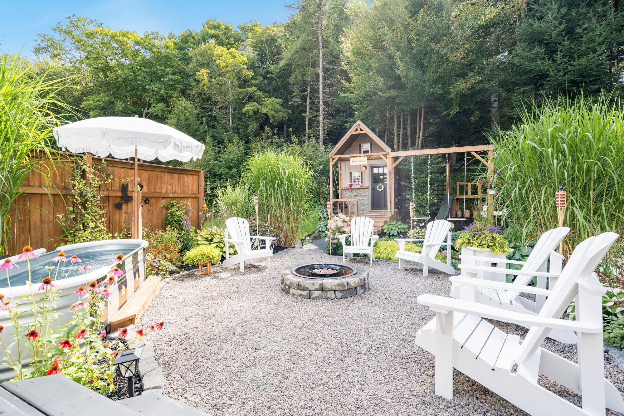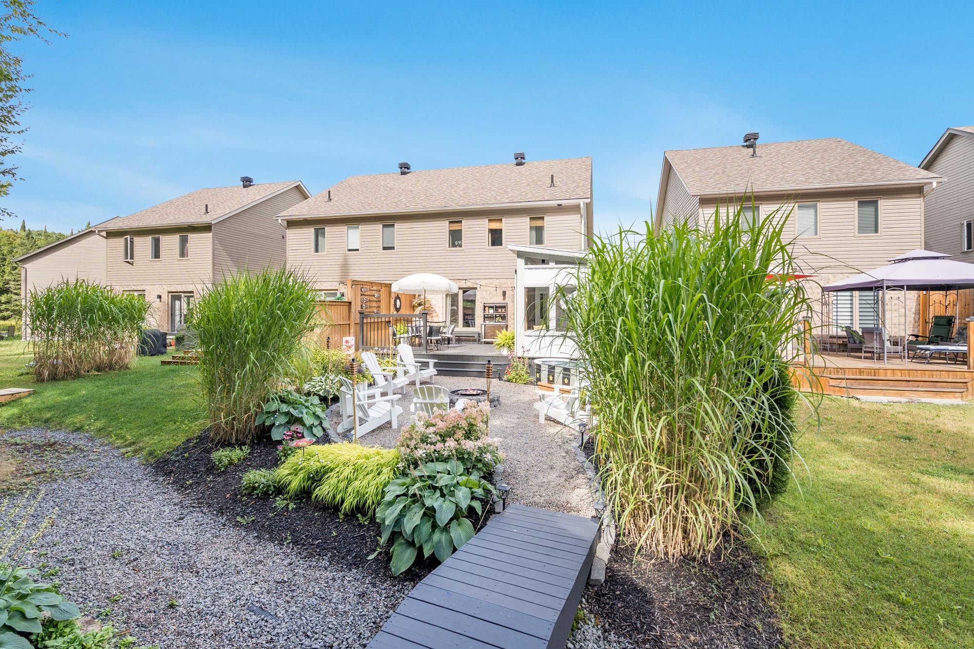 • Muskoka-style backyard with a gazebo, landscaping, and heated pool.