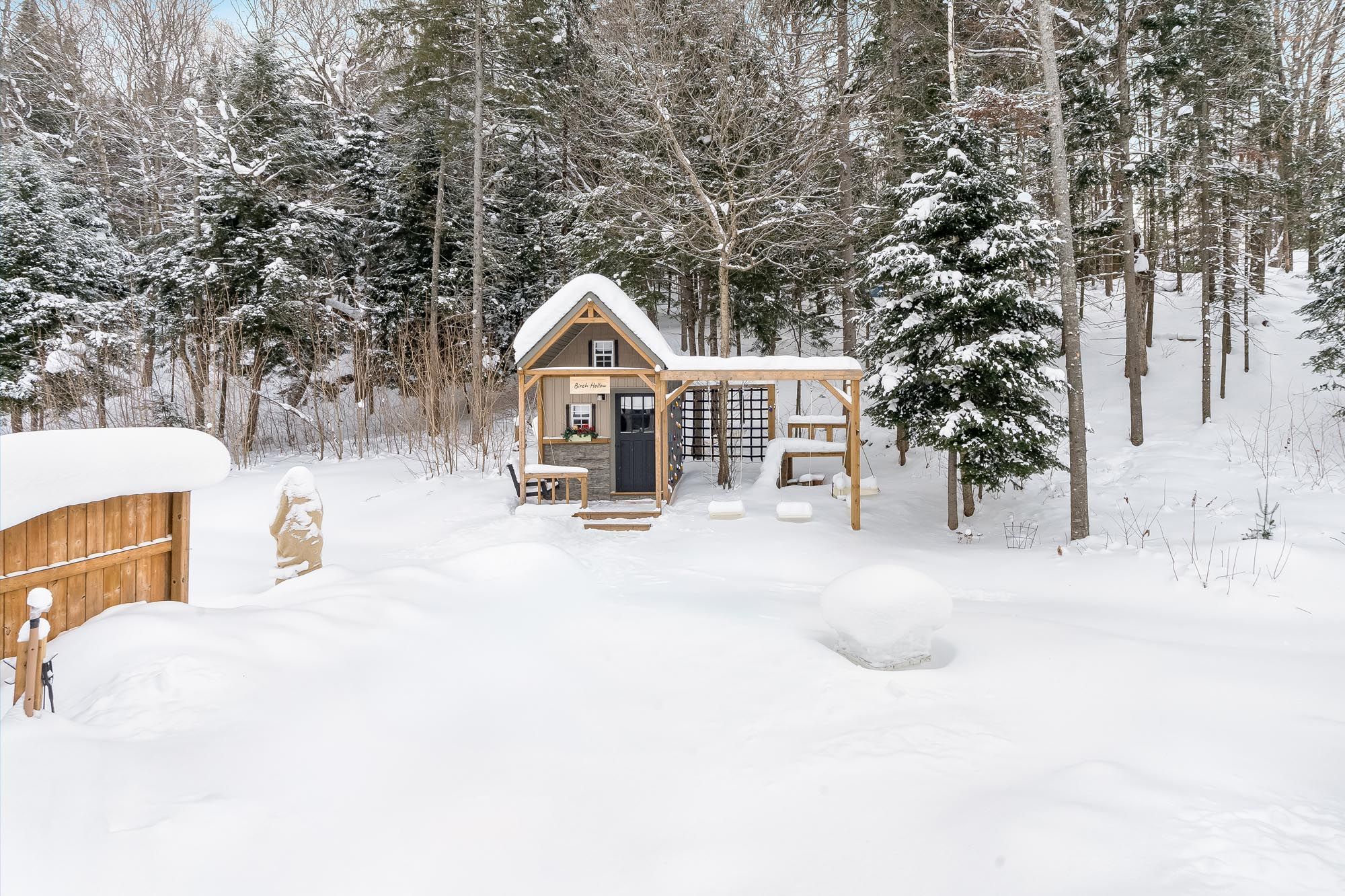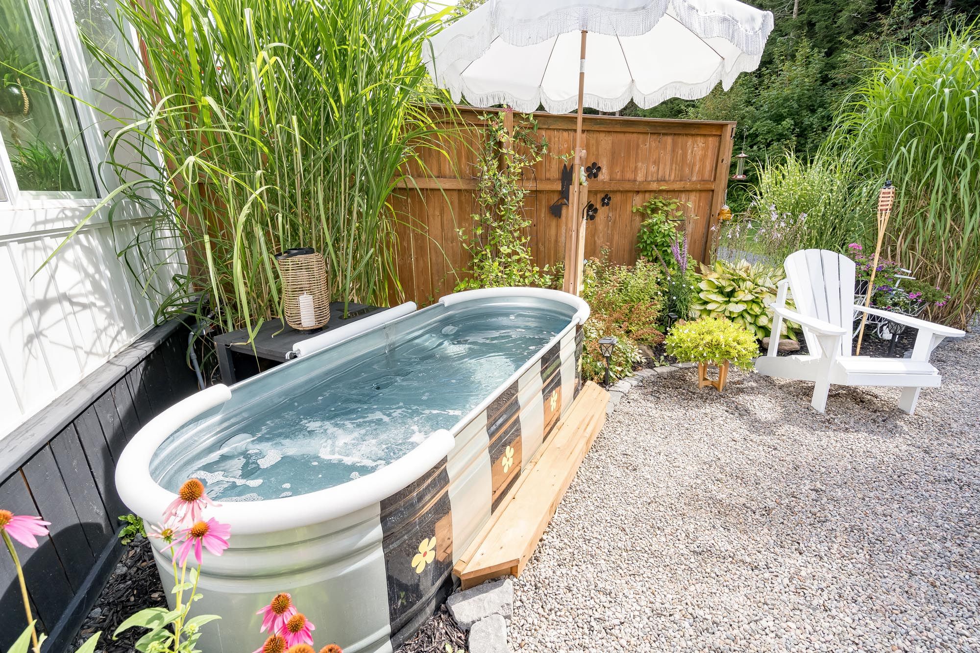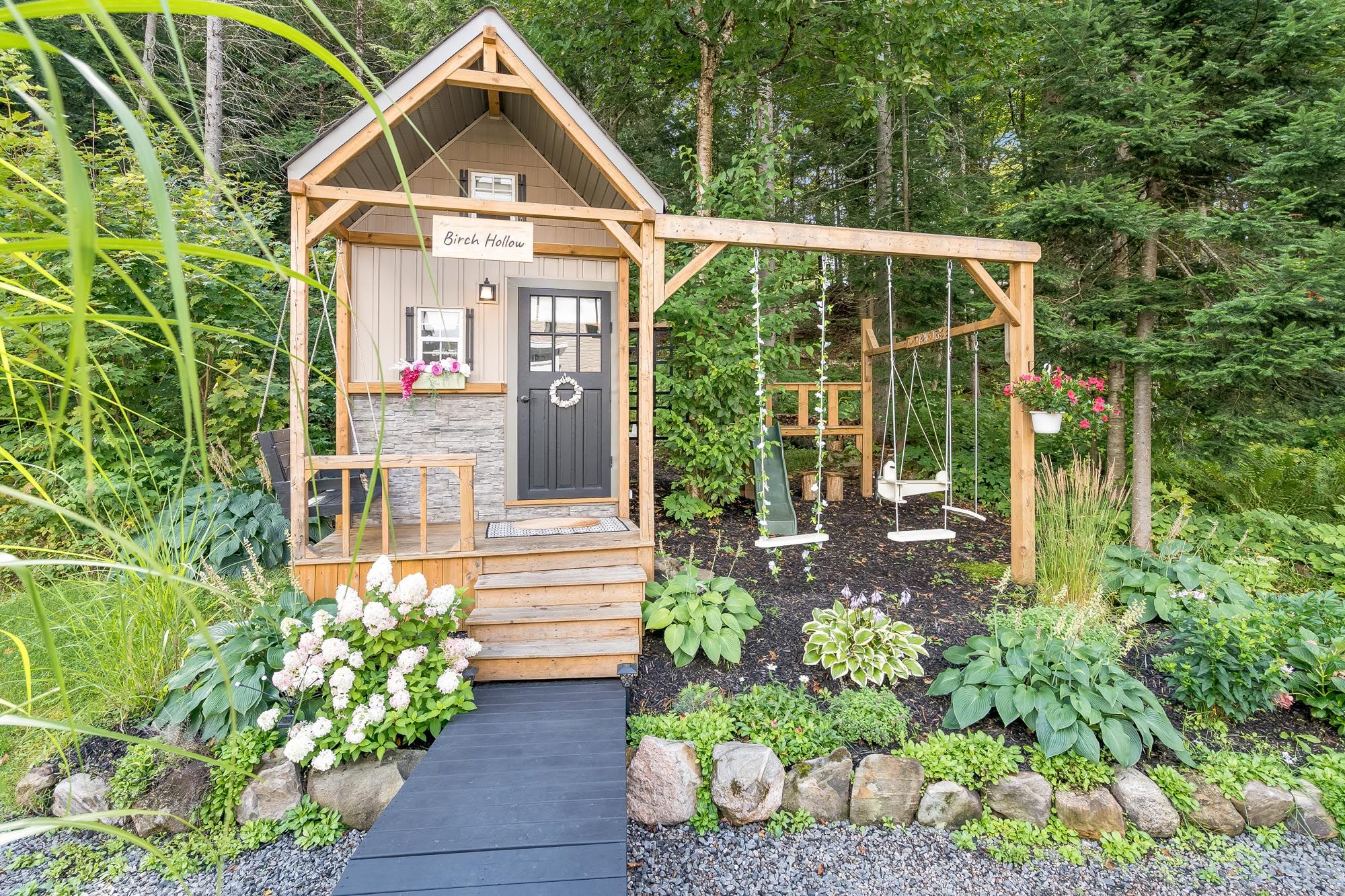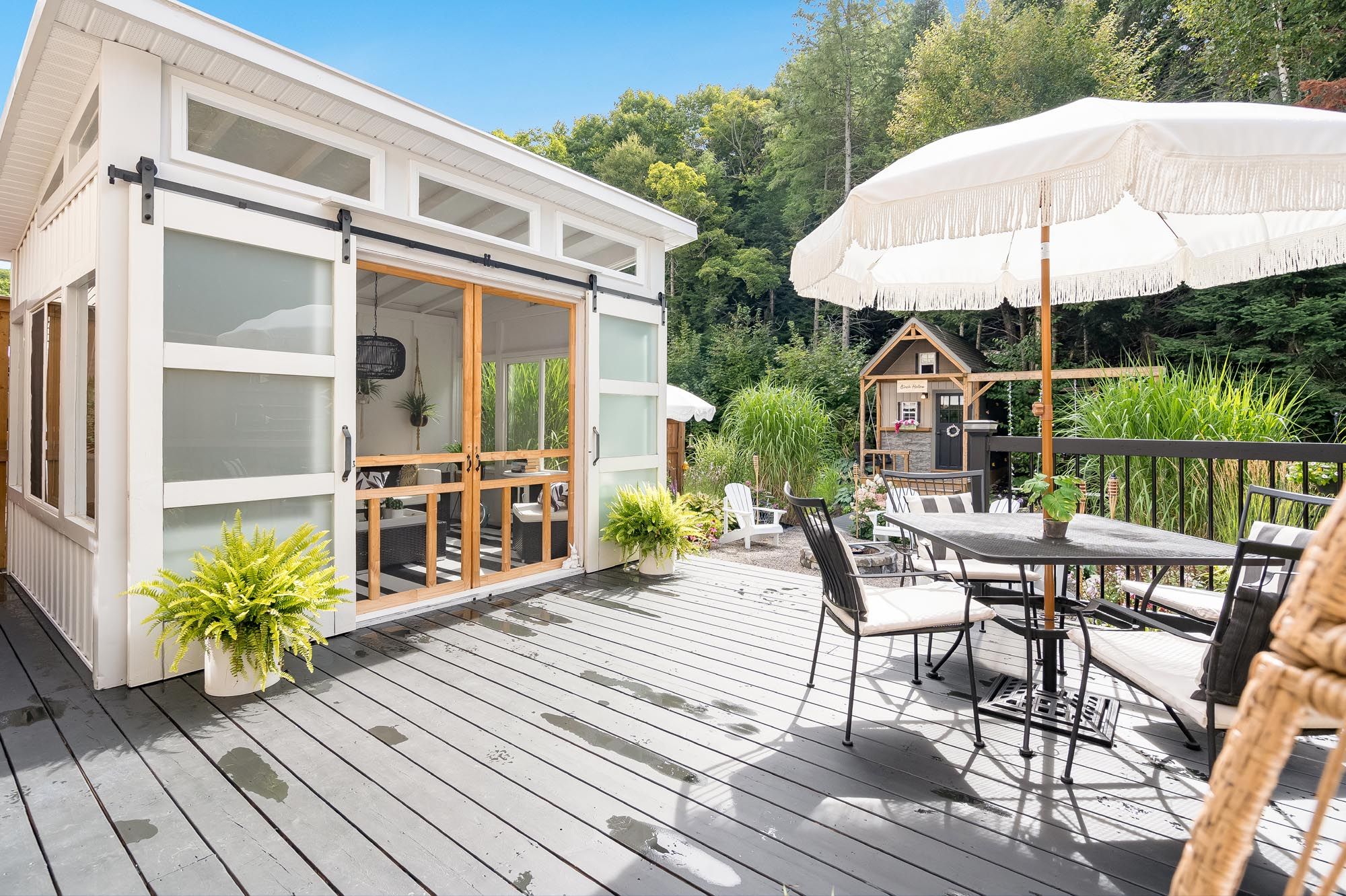 • Muskoka-style backyard with a gazebo, landscaping, and heated pool.