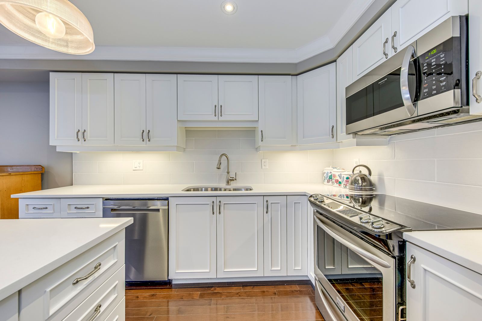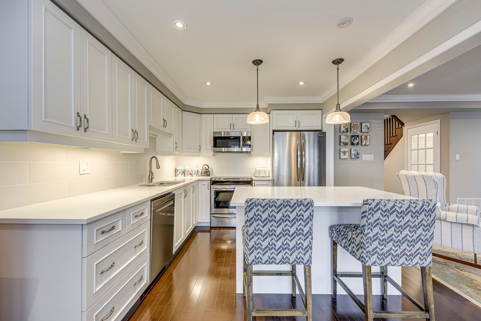• Gourmet kitchen with quartz countertops and under-cabinet lighting for cooking enthusiasts.