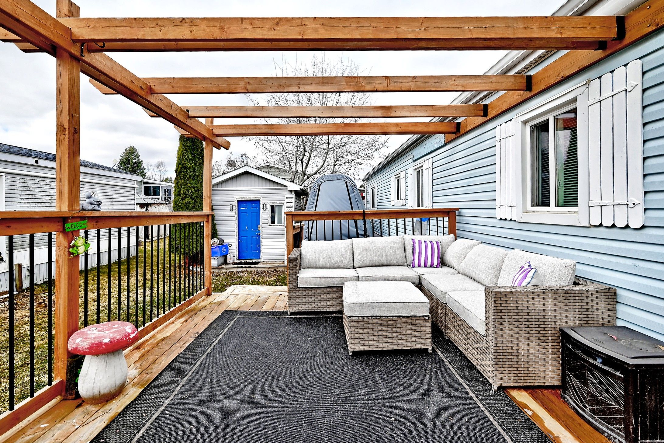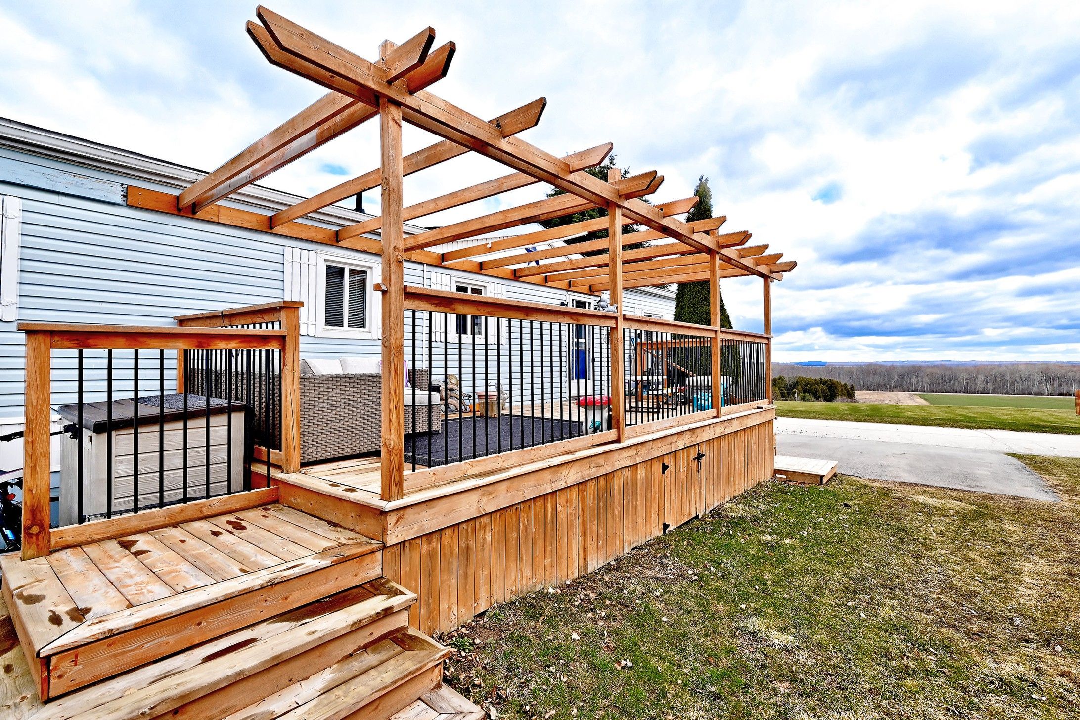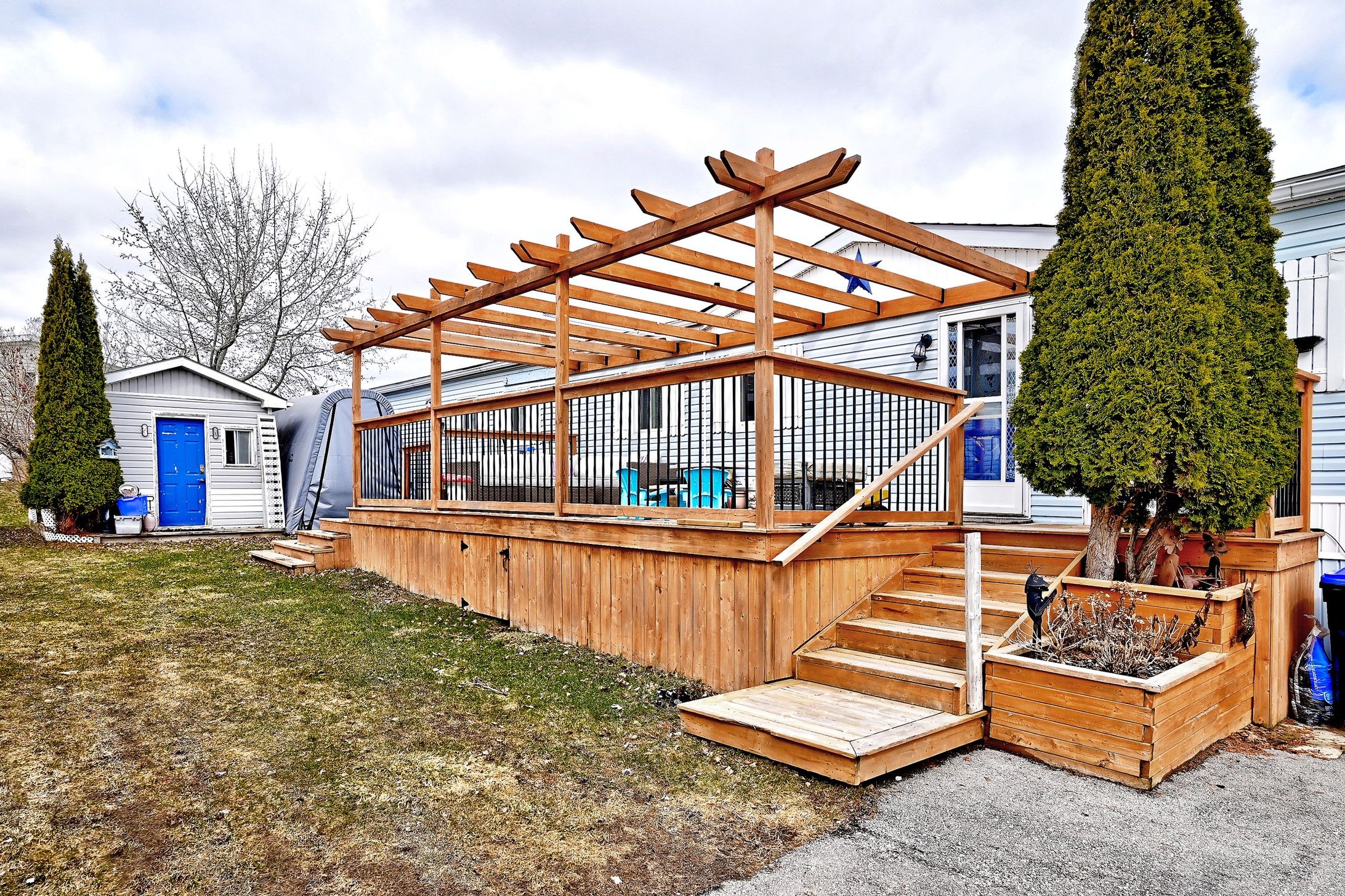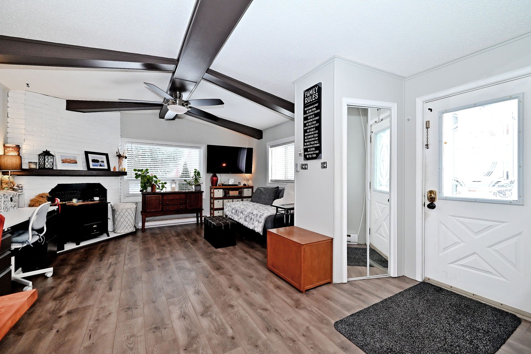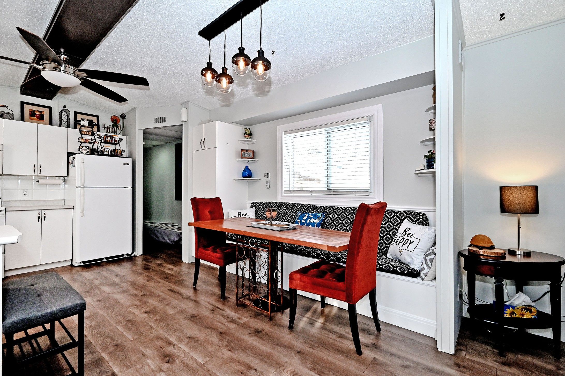 Attention first time buyers, renters, and those looking to downsize! This modular home is a wonderful opportunity for home ownership in a country setting ! Charming 2 bedroom modular home with spacious layout! Inviting living room features a chalet style beam ceiling and cozy wood burning fireplace. Bright eat in kitchen with plenty of counter space! The stylish banquette seating offers both charm and functionality to the kitchen! You will certainly appreciate that each bedroom has its own bathroom. The main bathroom is recently renovated with sought after modern touches. Many recent upgrades allow you comfortable living and peace of mind. Upgrades include: hot water tank - owned (2026), shingles (2024), deck,(2021),new flooring (2021),family bathroom(2021),paved driveway (2021), windows (2019). Located just mins from bradford this land lease community has no age restrictions. Monthly fees of $575. 00 include property taxes and water. Home owner responsible for hydro, internet and phone. Plenty of room for 4 cars in the private driveway, and guest parking is available! Enjoy living comfortably in a serene setting!